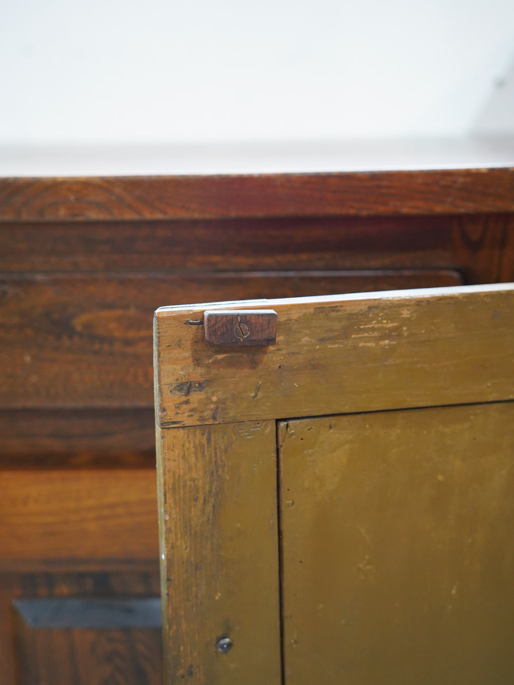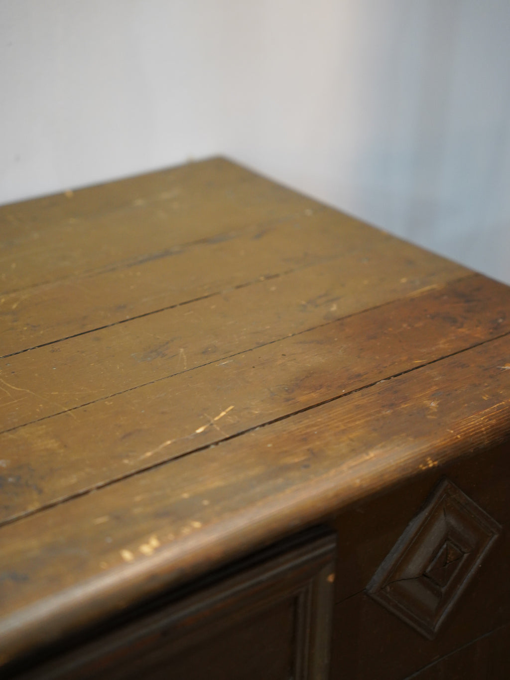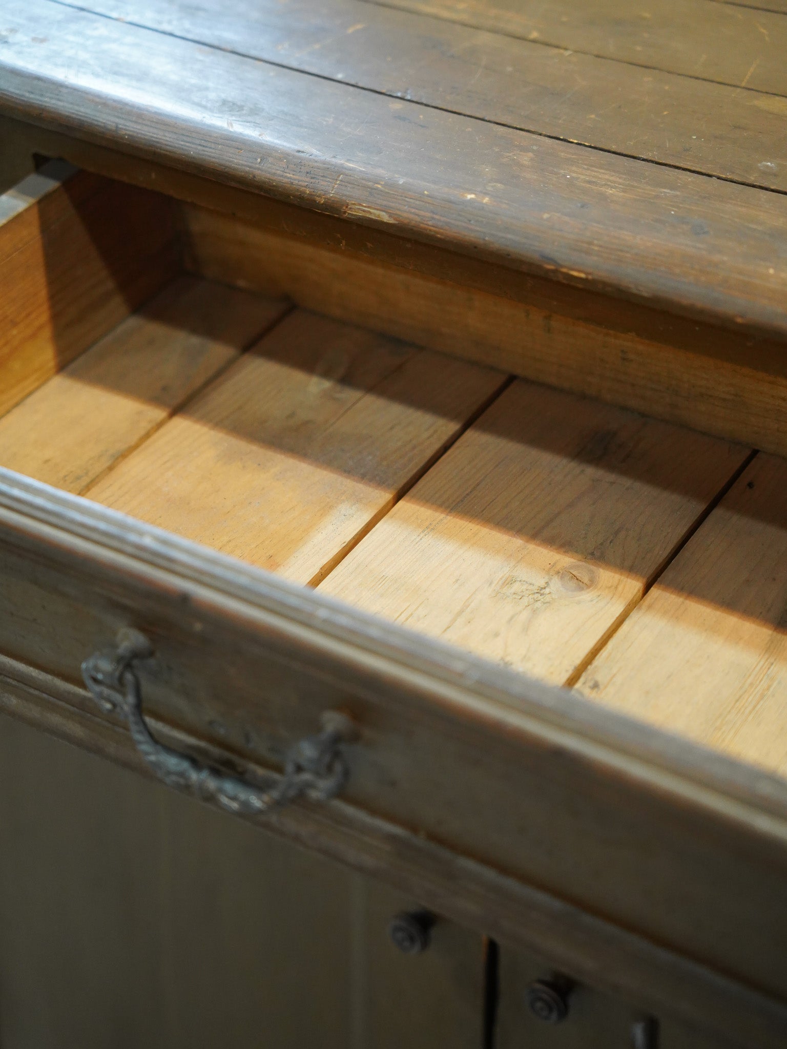 木目の美しさと耐久性を兼ね備えた無垢材が使用されていると推測されます。使い込まれたことによる細かな傷や木材のひび割れ、色合いの変化は、この家具が持つ歴史と唯一無二の風合いを物語っています。