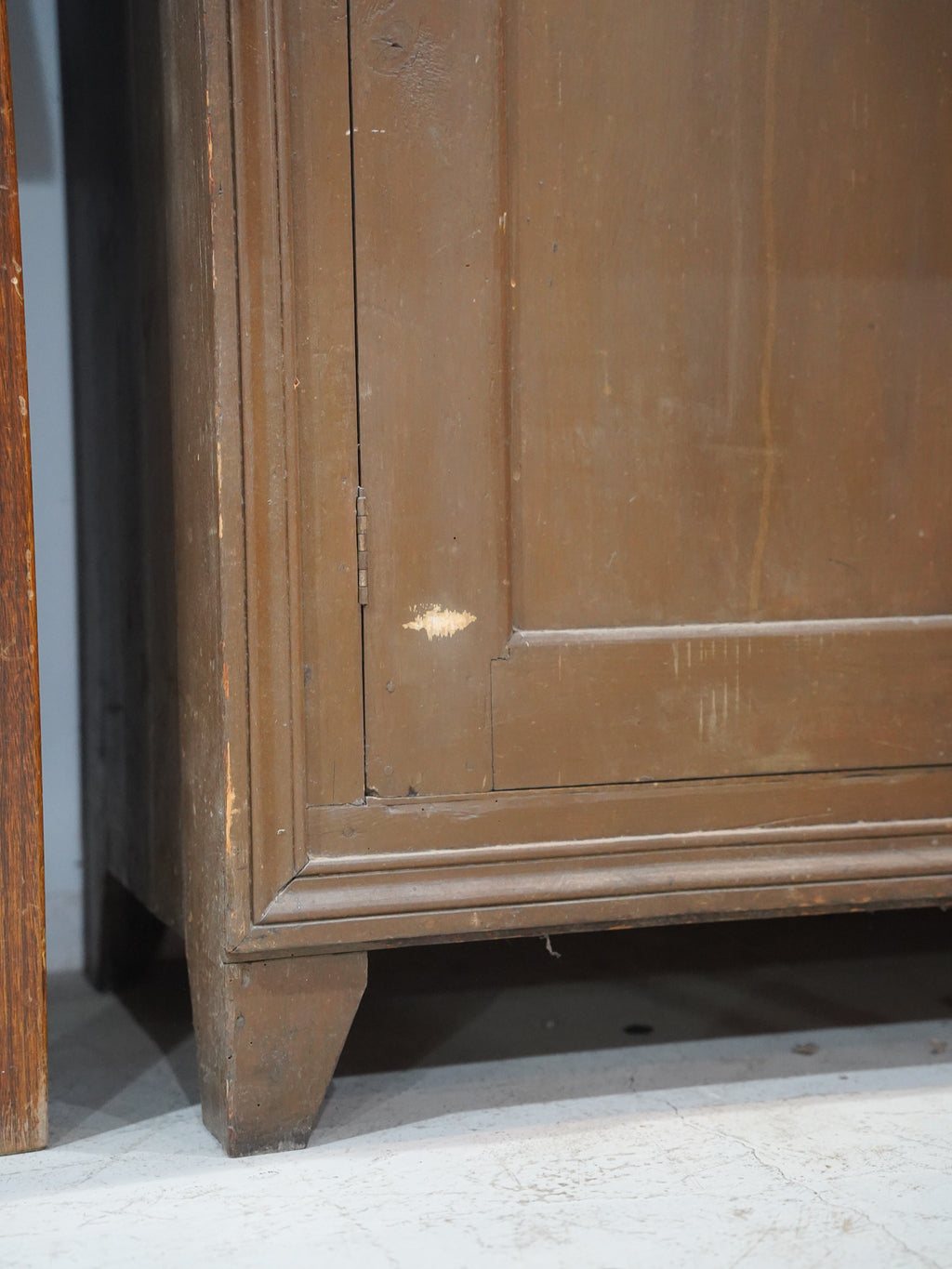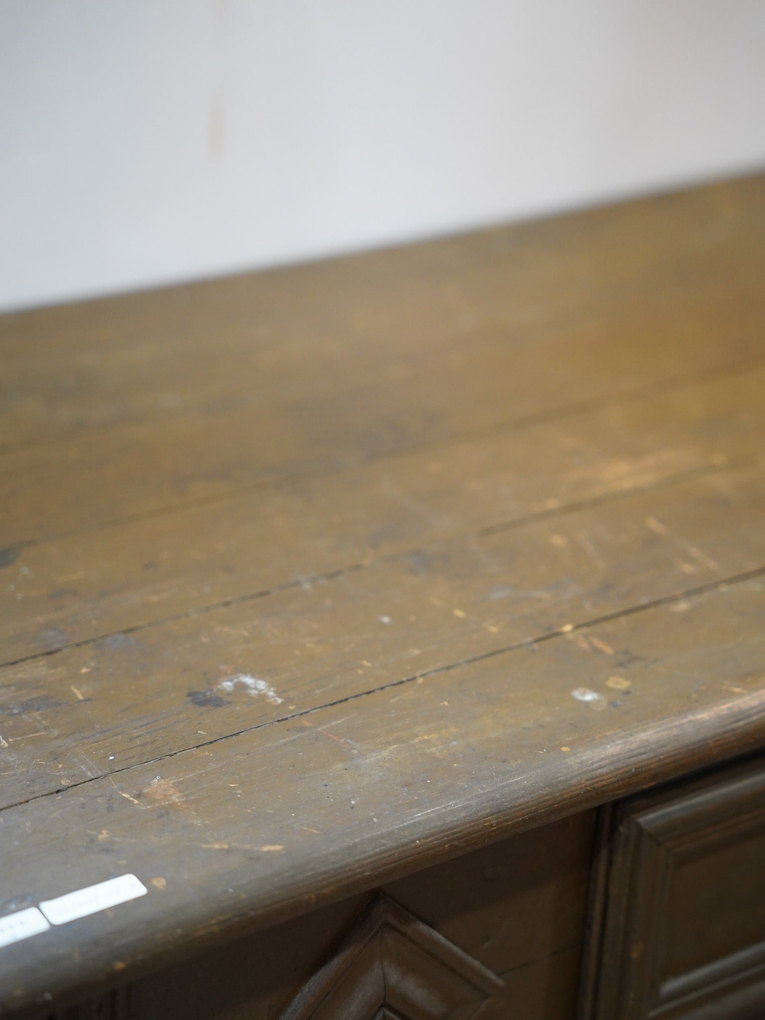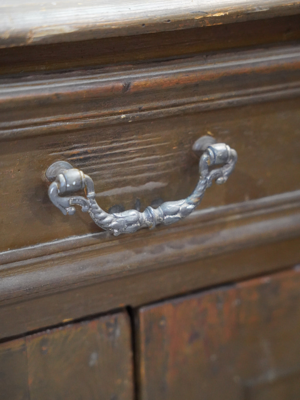 木目の美しさと耐久性を兼ね備えた無垢材が使用されていると推測されます。使い込まれたことによる細かな傷や木材のひび割れ、色合いの変化は、この家具が持つ歴史と唯一無二の風合いを物語っています。