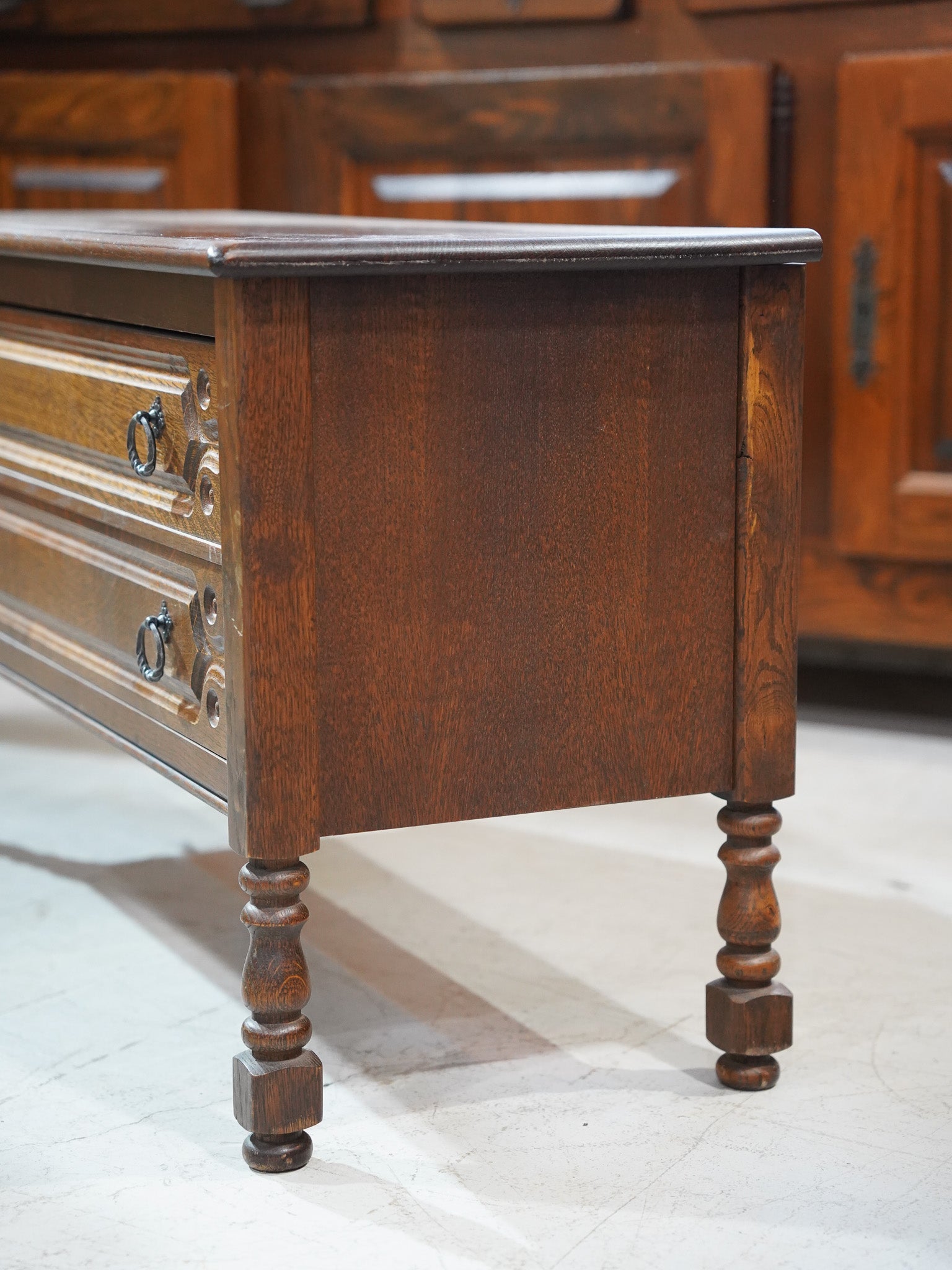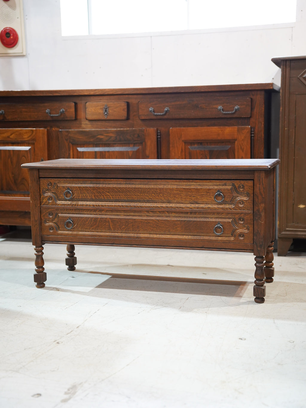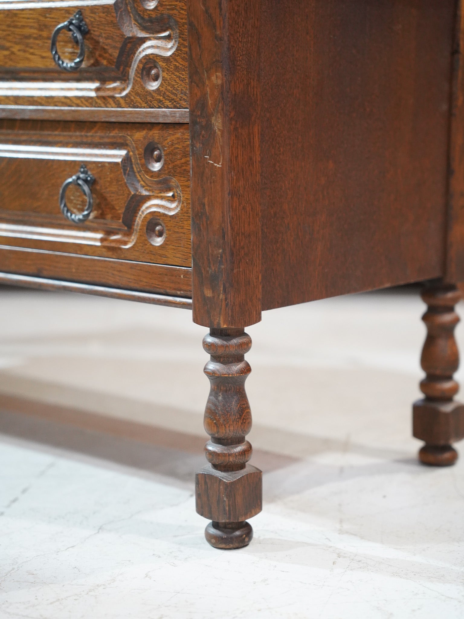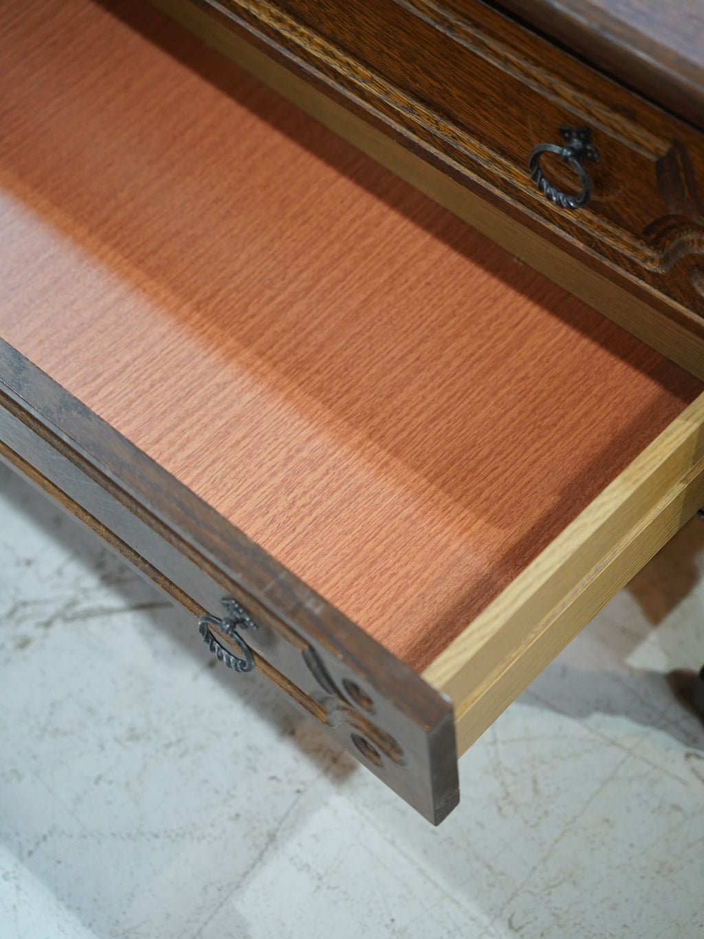 引き出しの前面には、オーク材の木目を活かした彫刻や、古典的なデザインのモールディング(装飾的な縁取り)が施されており、立体感と豊かな表情を生み出しています。