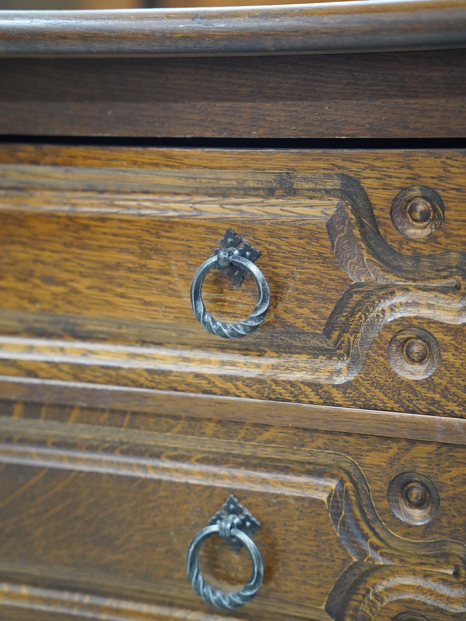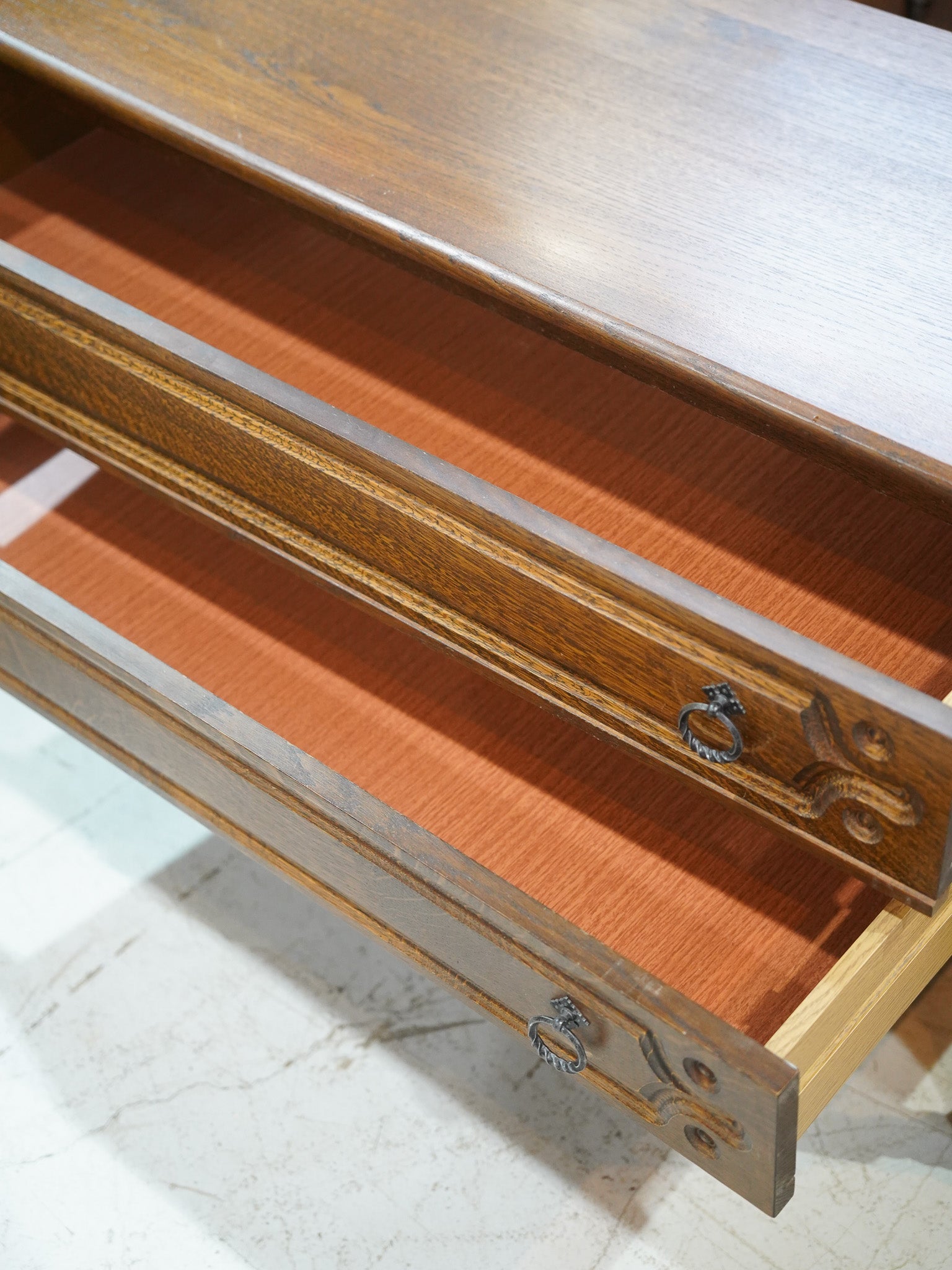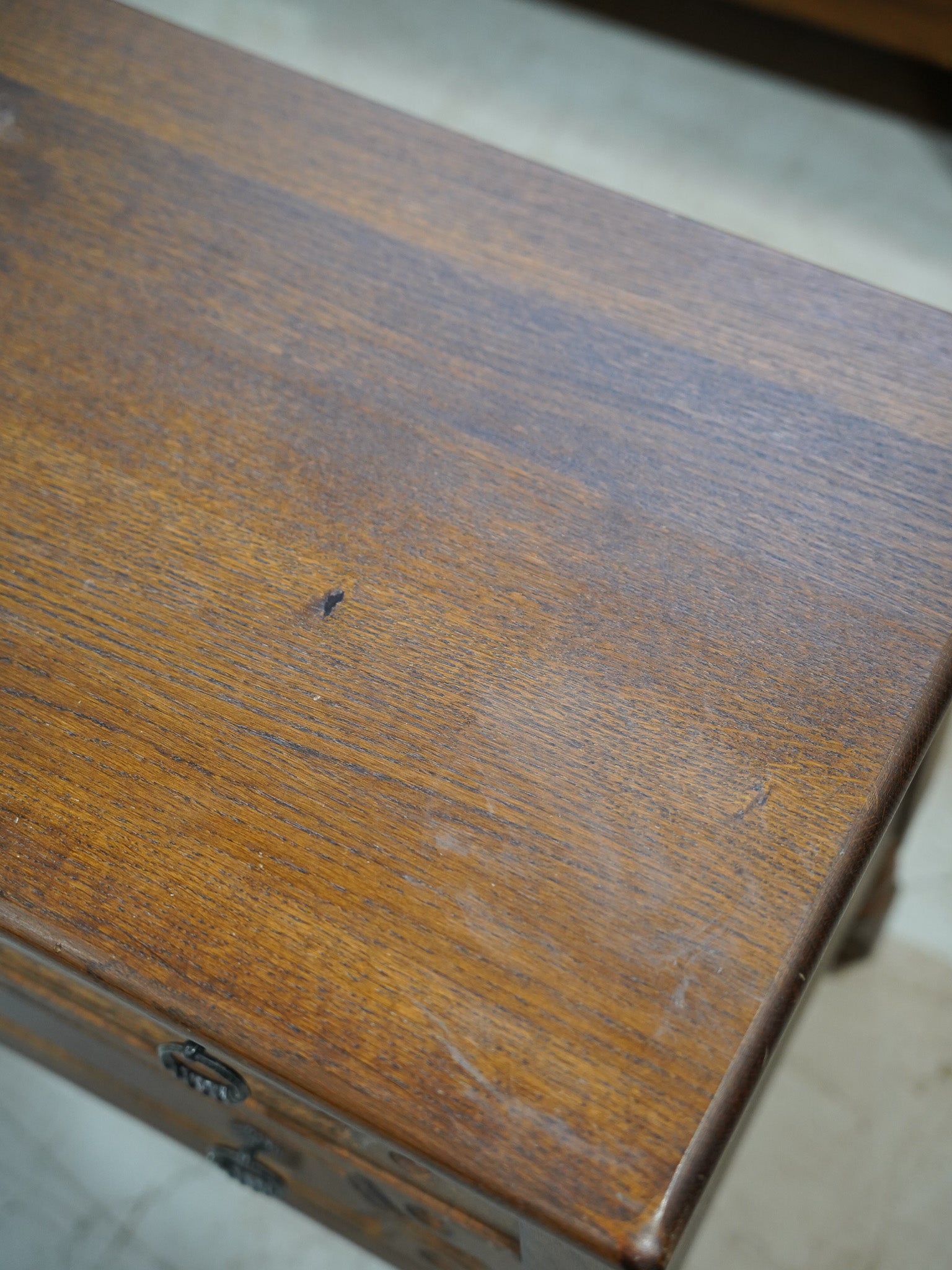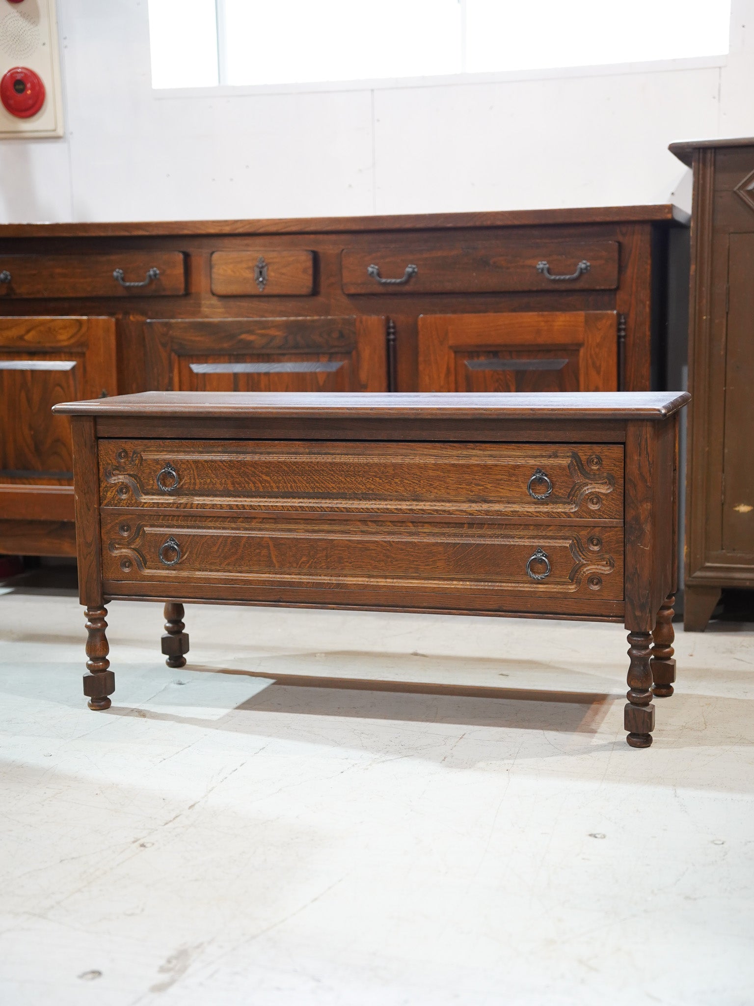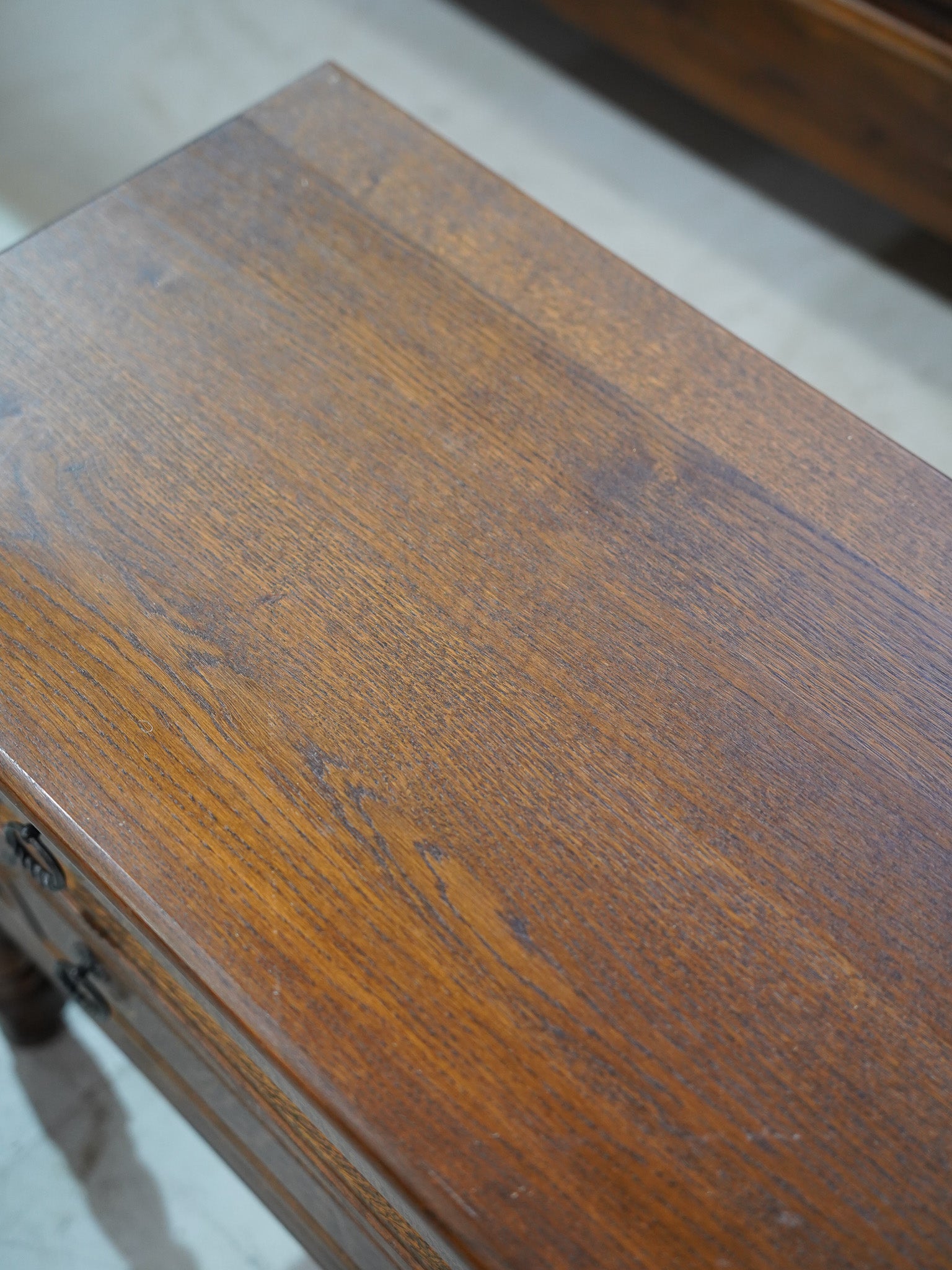 引き出しの前面には、オーク材の木目を活かした彫刻や、古典的なデザインのモールディング(装飾的な縁取り)が施されており、立体感と豊かな表情を生み出しています。