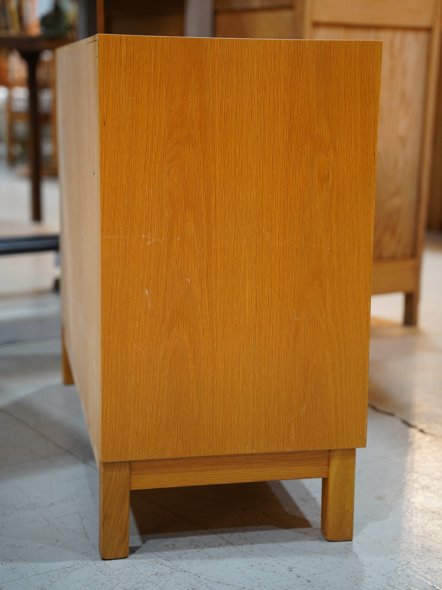 直線的で脚付きのフォルムはモダンな空間にも馴染みやすいデザインです。シンプルな引き戸(戸棚)と上部のひきだしで構成された、実用性の高いキャビネットです。