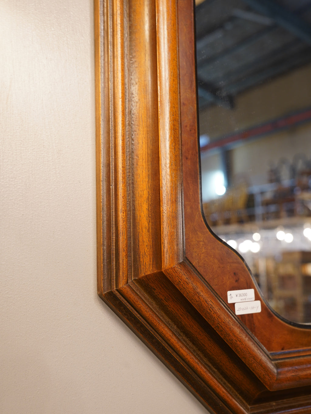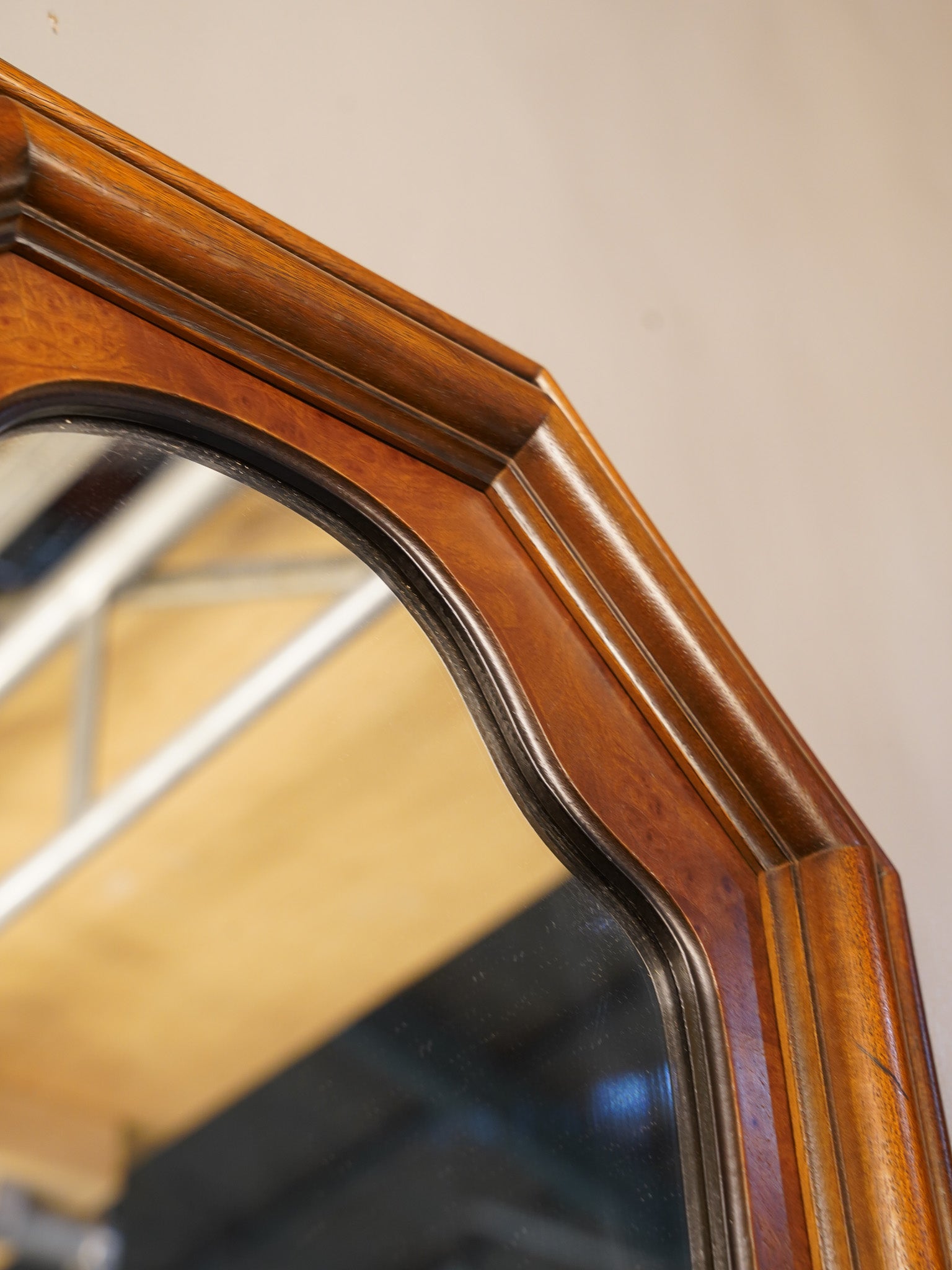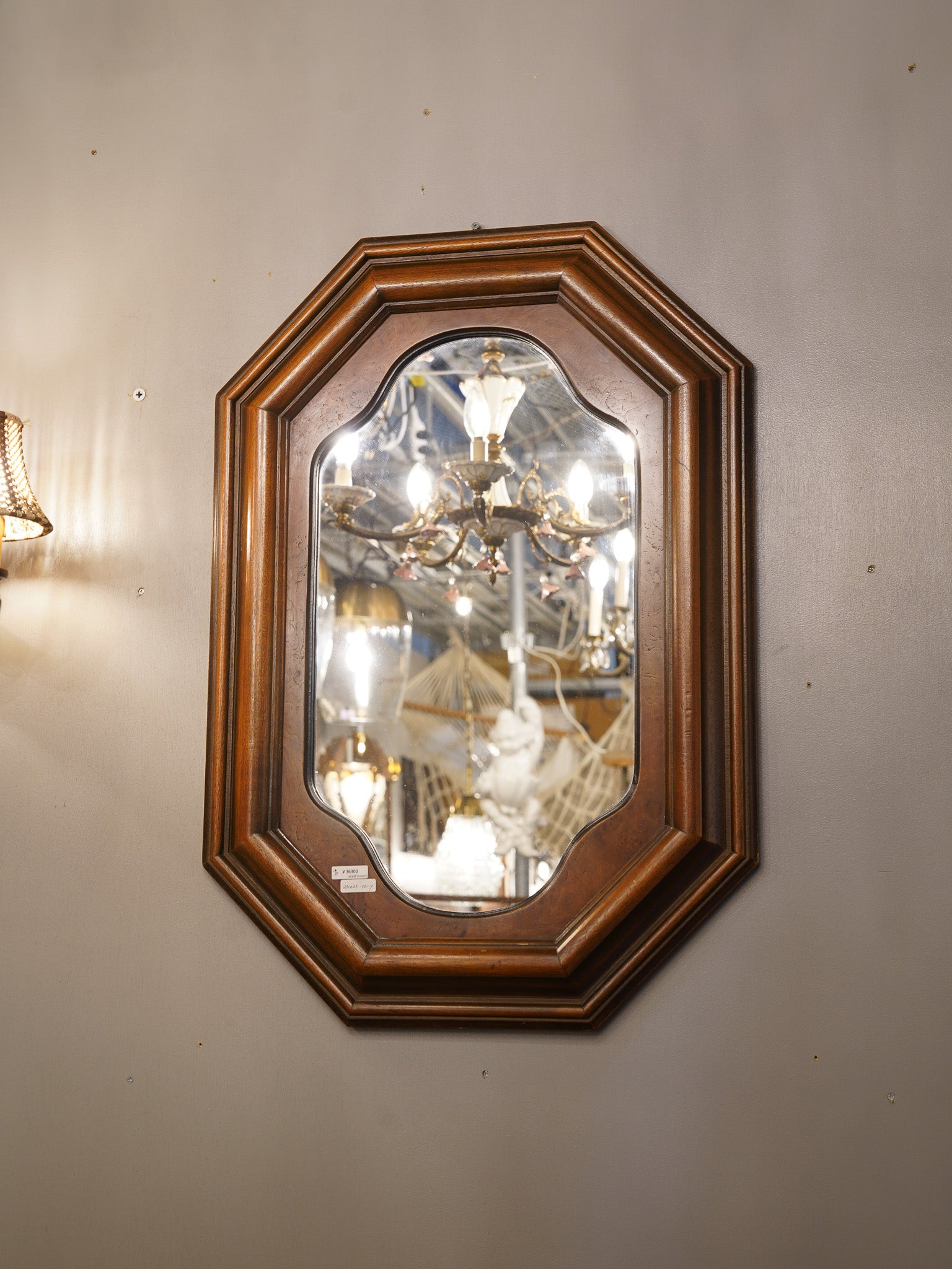 こちらの鏡は、外側のフレームが八角形の形状をしており、内側の鏡面が優雅な曲線で縁取られた、非常にクラシカルで個性的なデザインのミラーです。