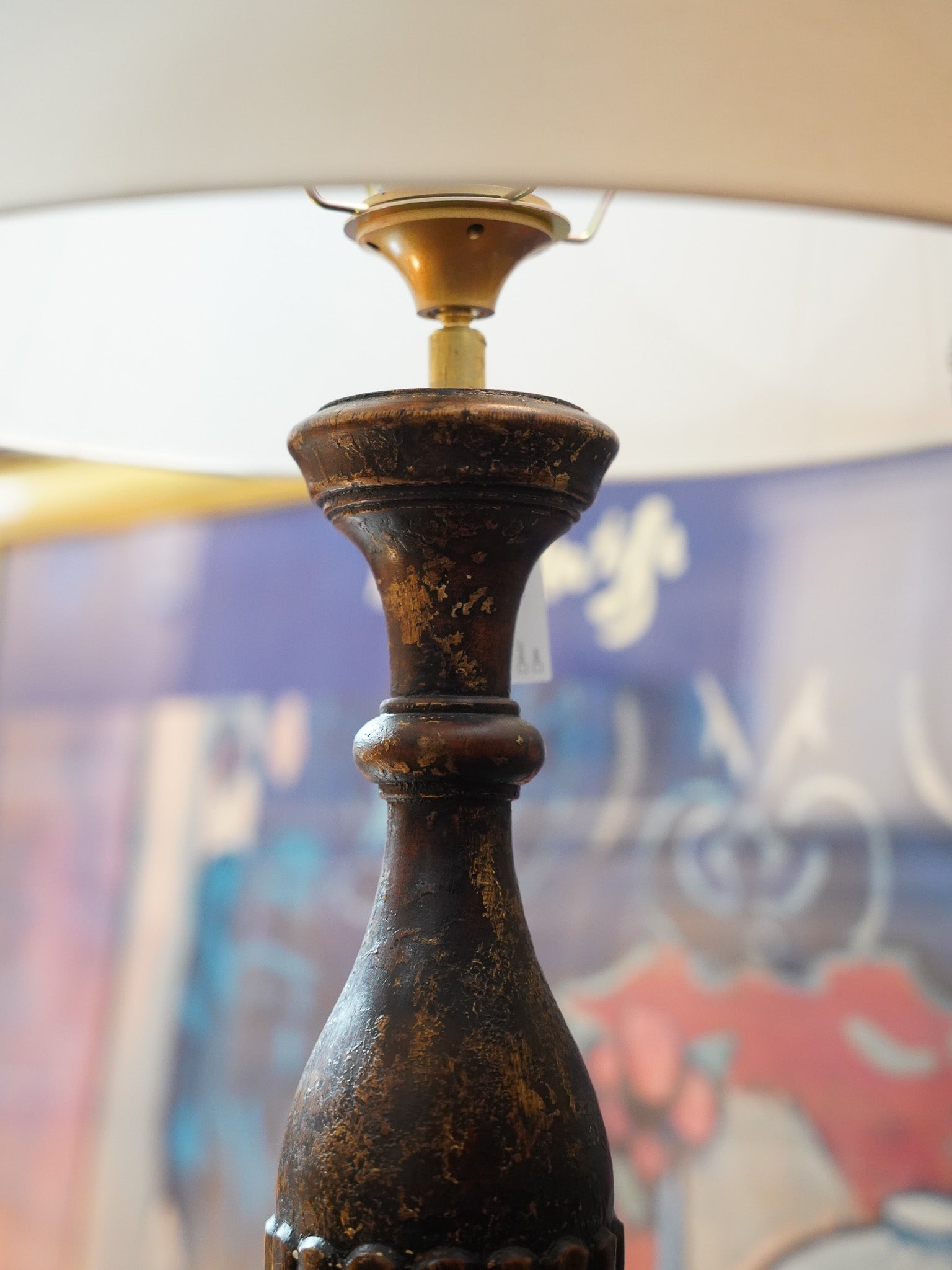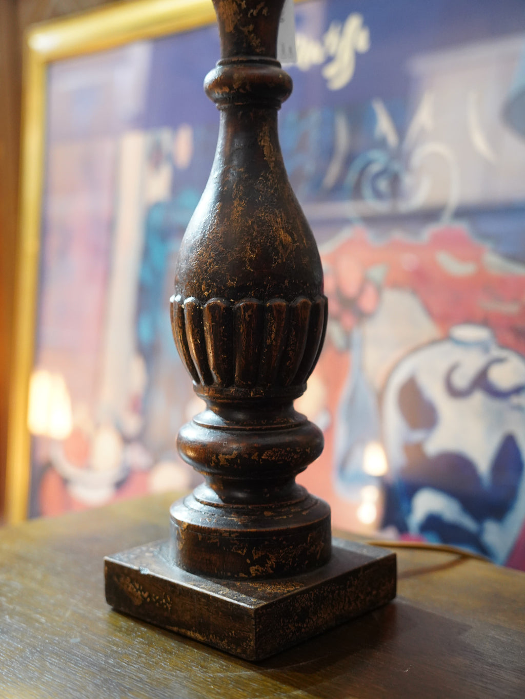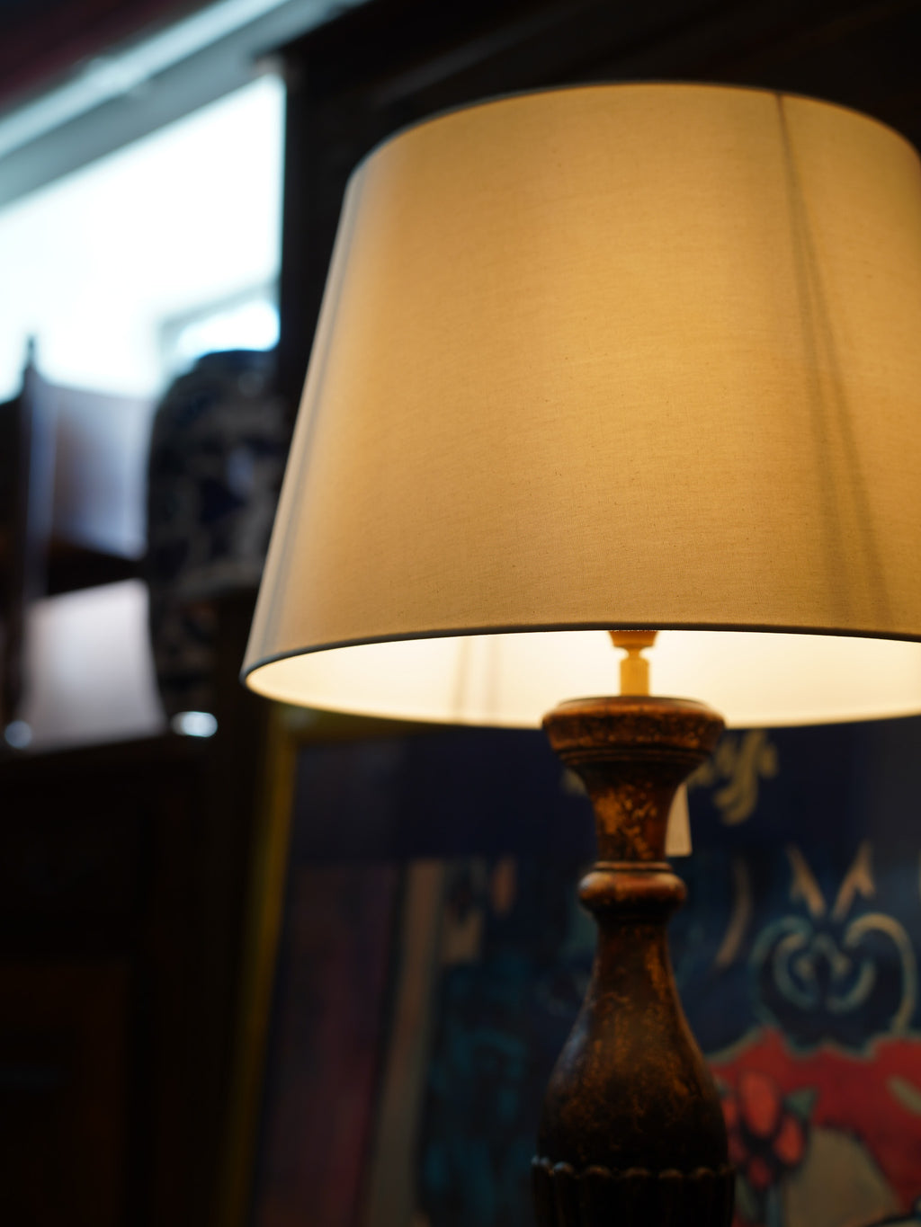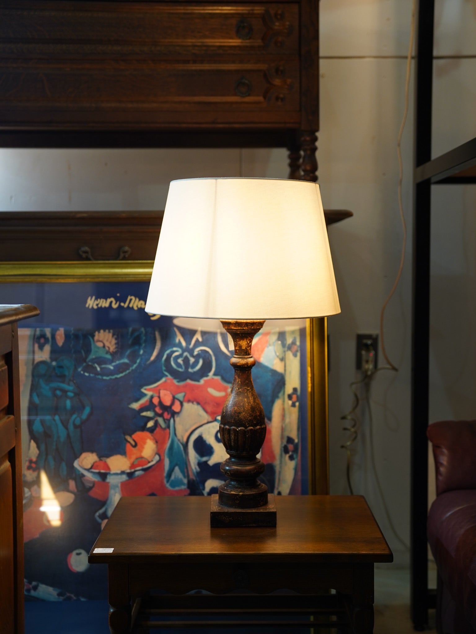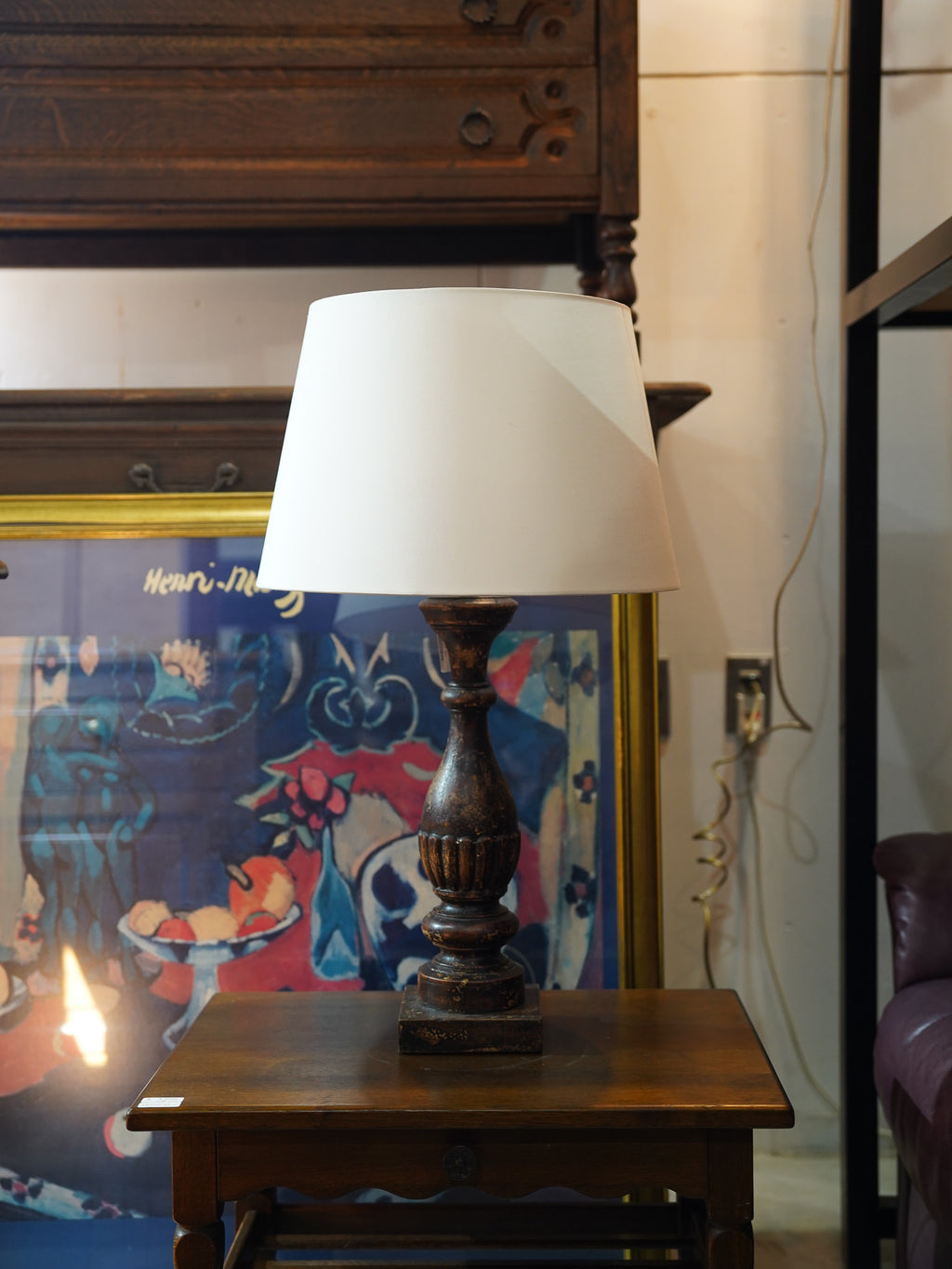 ベースには、ろくろ細工のような優雅な装飾が施され、深みのあるブラウンとゴールドが、ランプ全体に歴史と物語を感じさせる存在感を与えています。点灯時、この木製ベースの質感と温かみのある光が相まって、空間に格調高い落ち着きをもたらします。