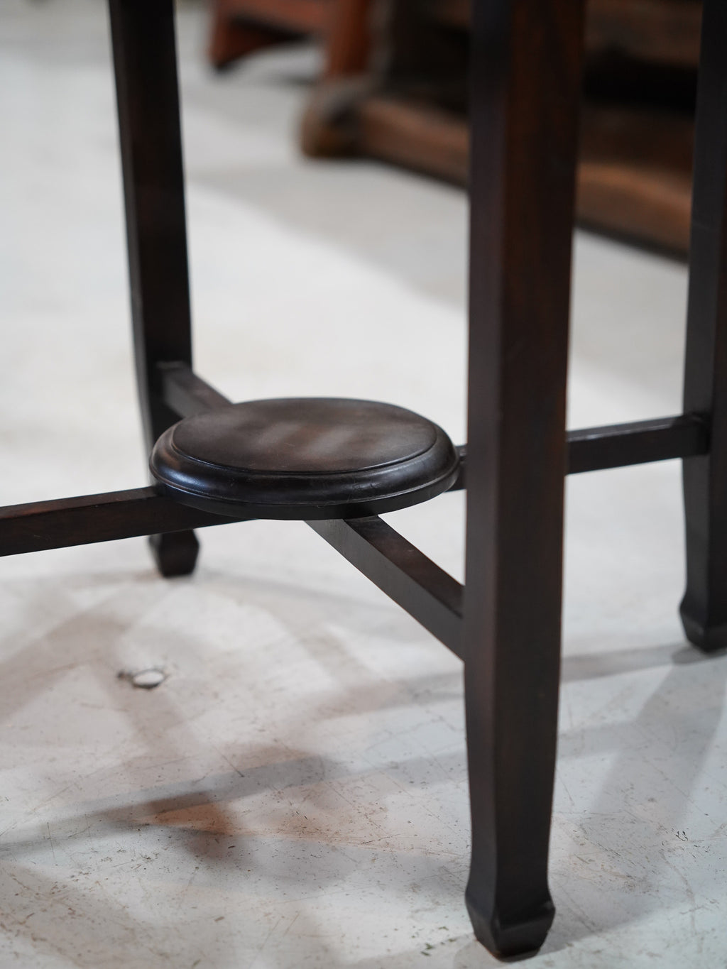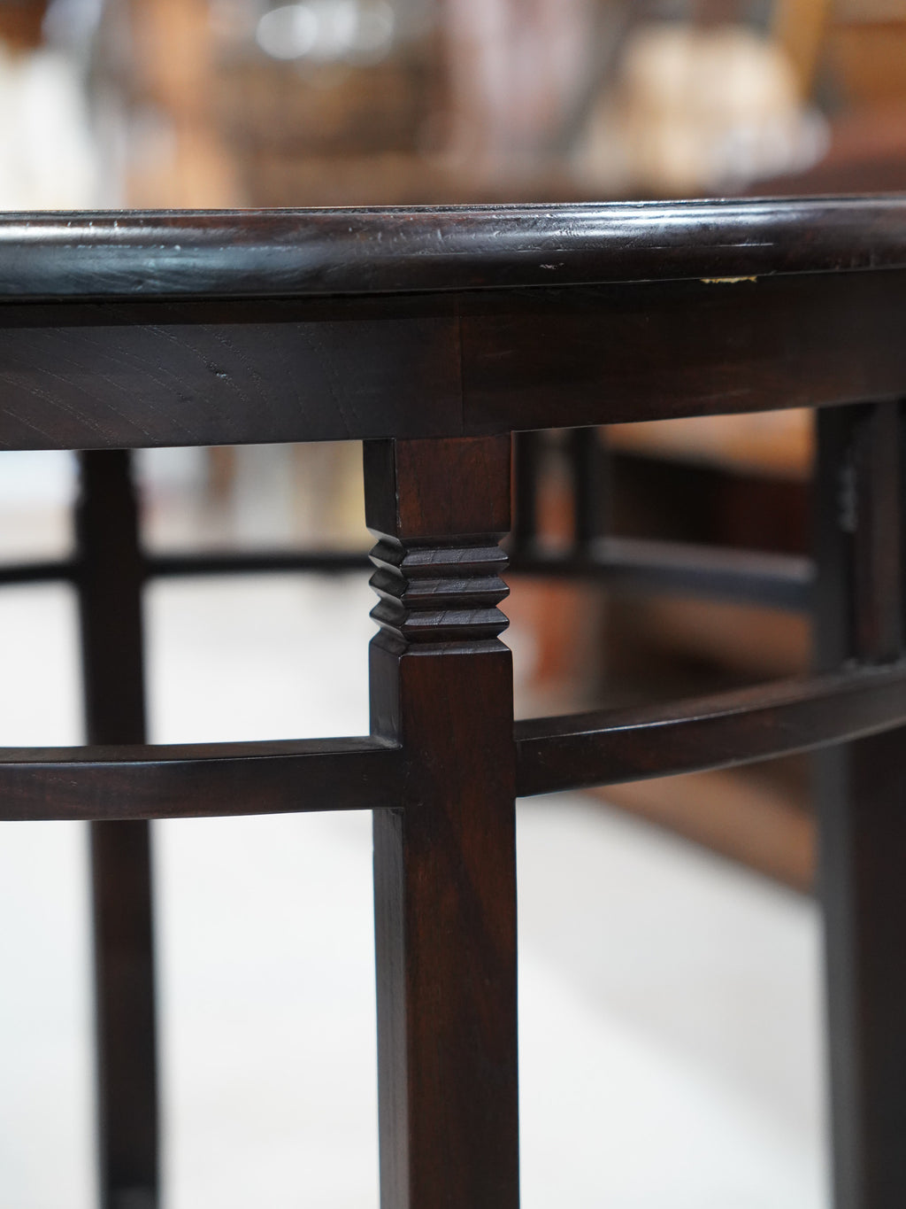 特徴的なのは、脚部に施されたデザインです。天板下の円形の貫と、下部の丸い板状の棚板が、デザインのアクセントとなりつつ、安定性を高めています。このすらりとした脚部とシンプルな構成は、洗練された印象を与えます。