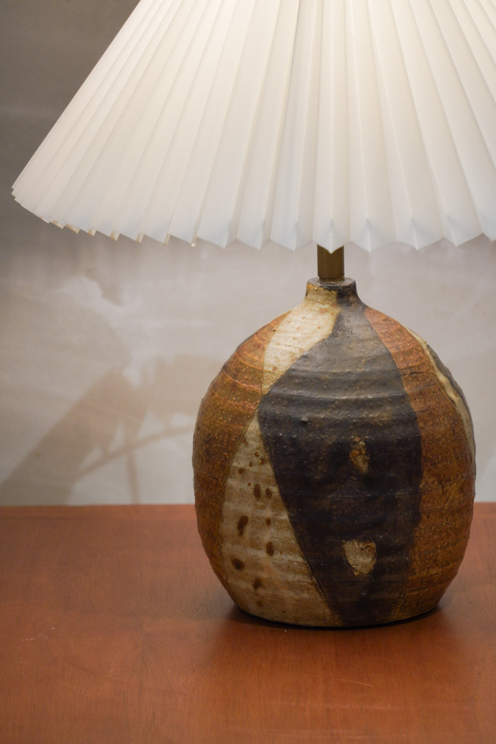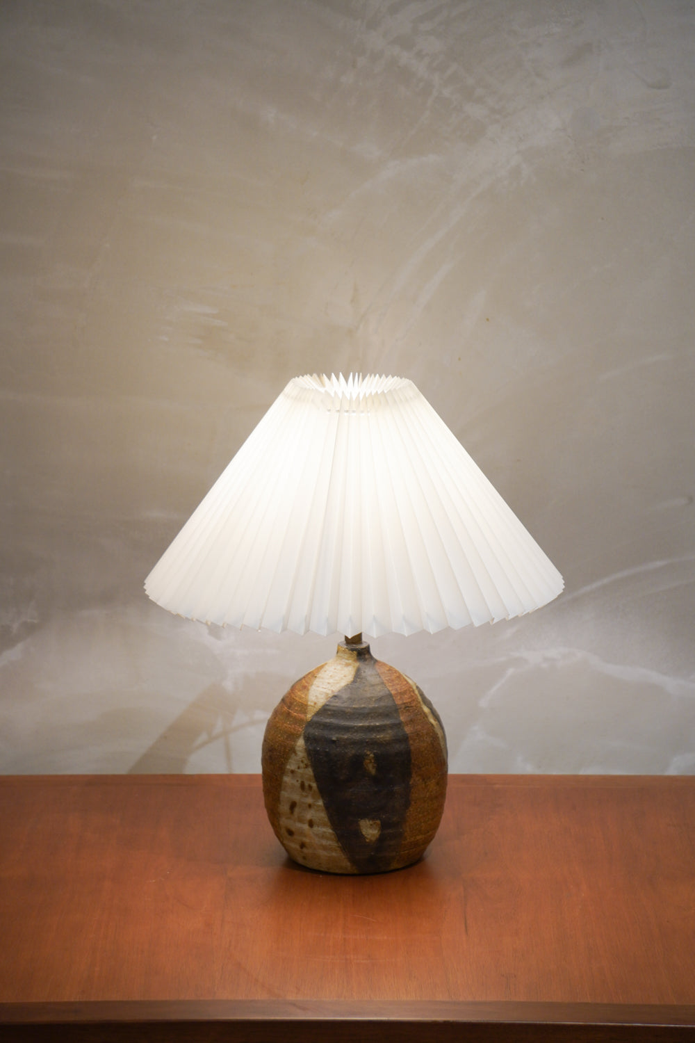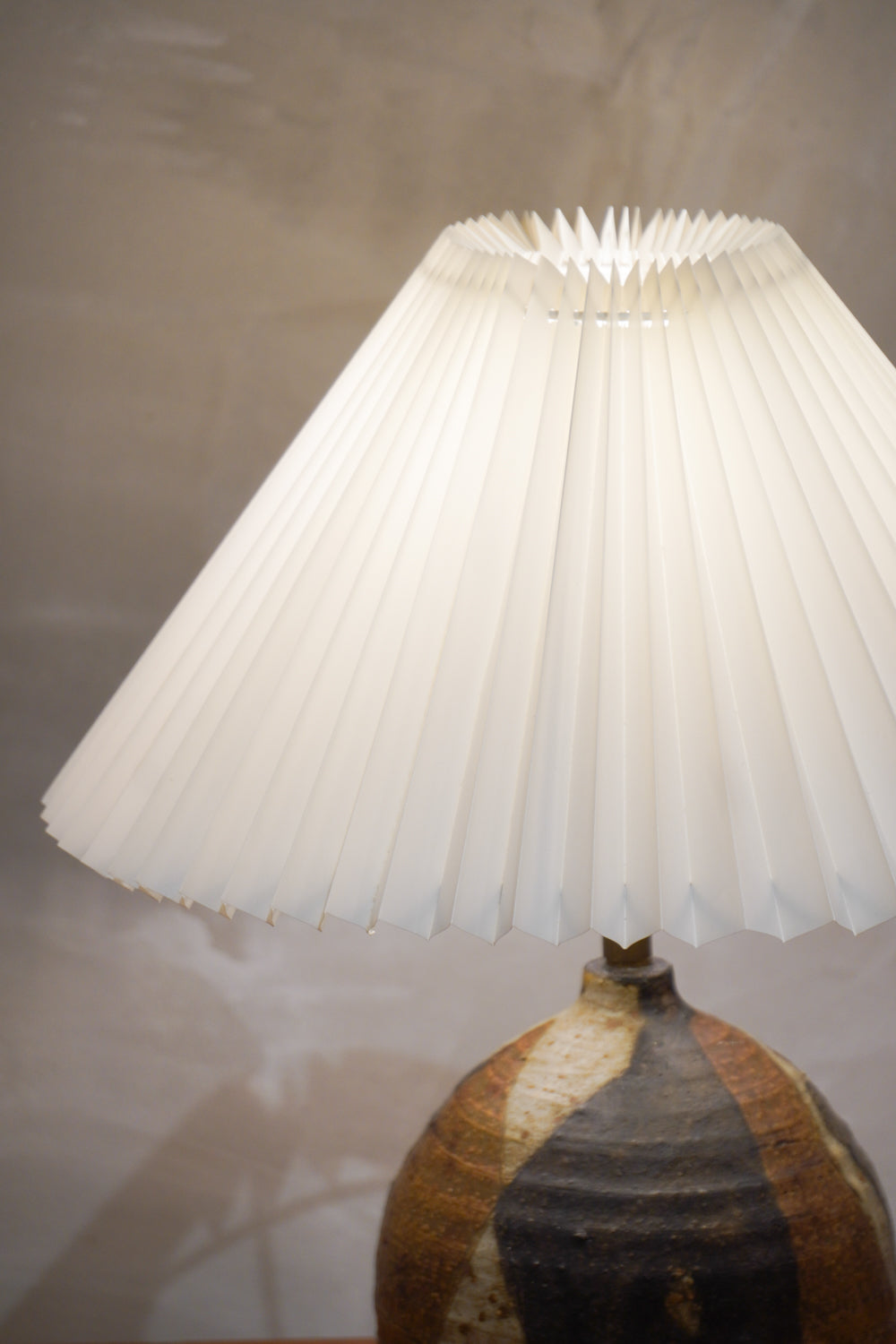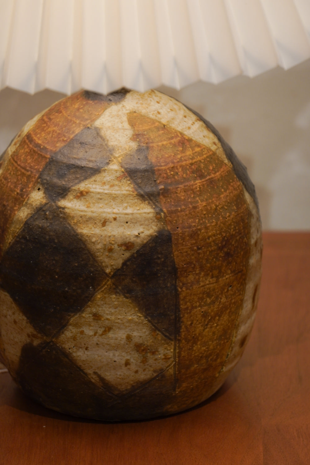 恐らく1960年代ごろの作品であろうこのテーブルランプ、丸いプクッとしたフォルムに色分けされた釉薬と連続した模様、横に走る均等に引かれたロクロ目が全体を引き締めていて面白いバランスで成り立っています。