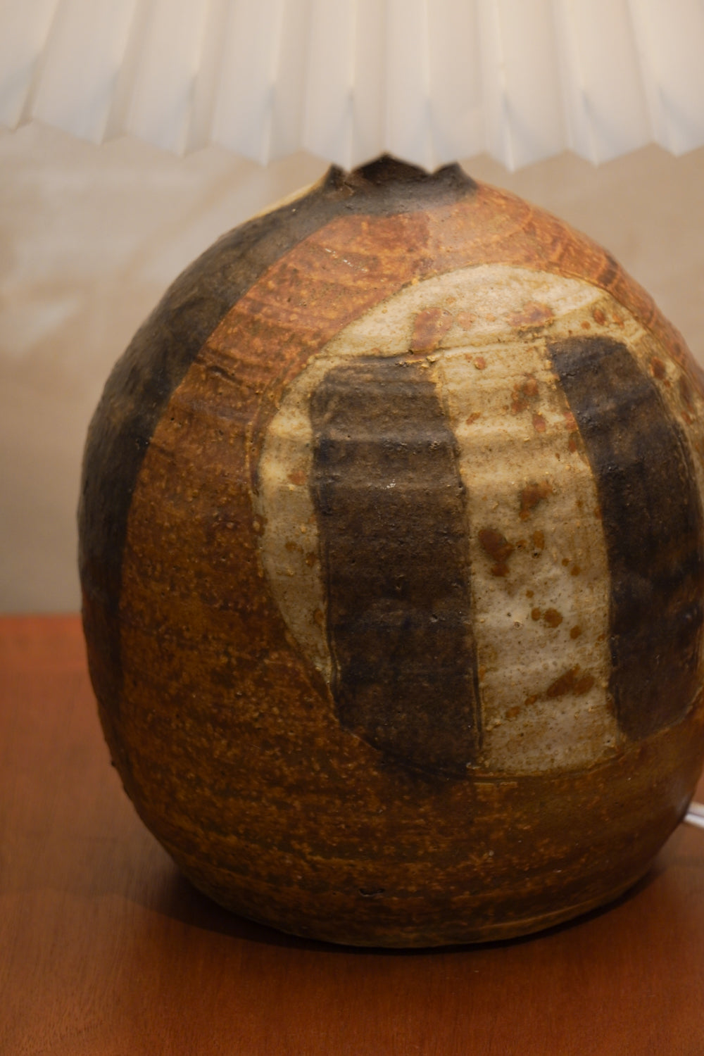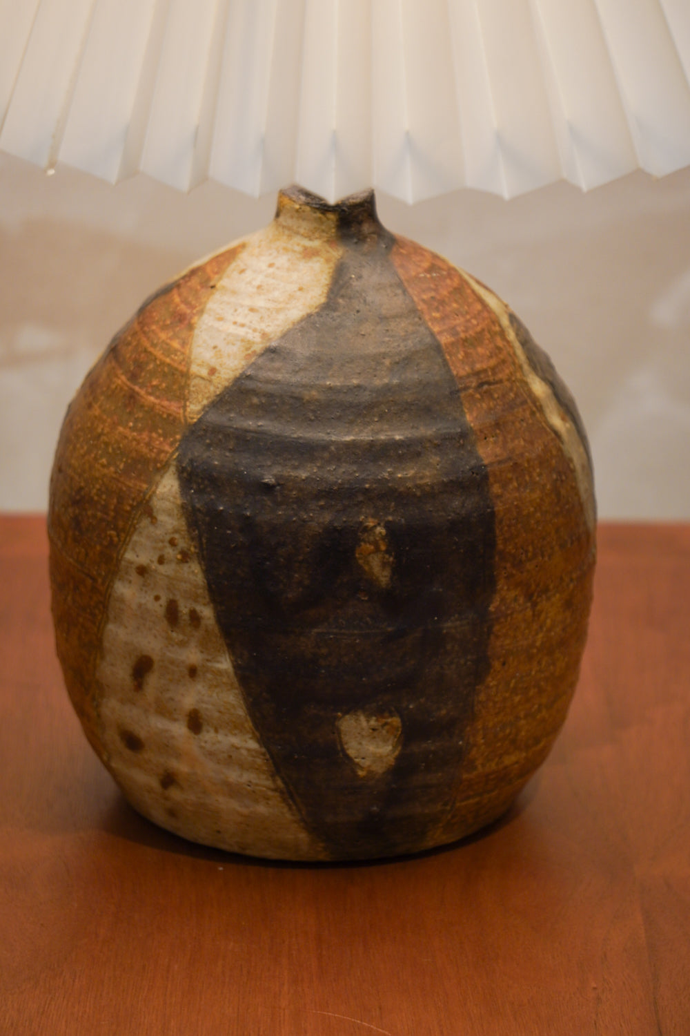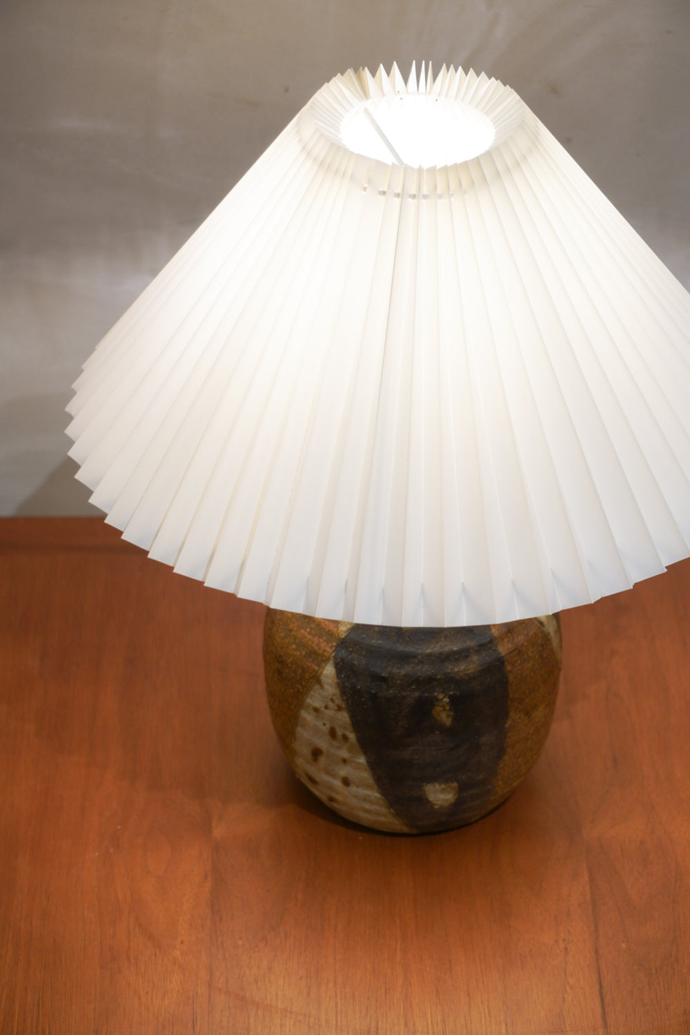 恐らく1960年代ごろの作品であろうこのテーブルランプ、丸いプクッとしたフォルムに色分けされた釉薬と連続した模様、横に走る均等に引かれたロクロ目が全体を引き締めていて面白いバランスで成り立っています。