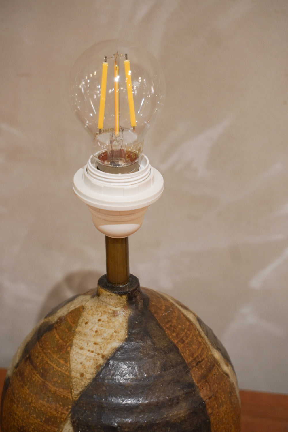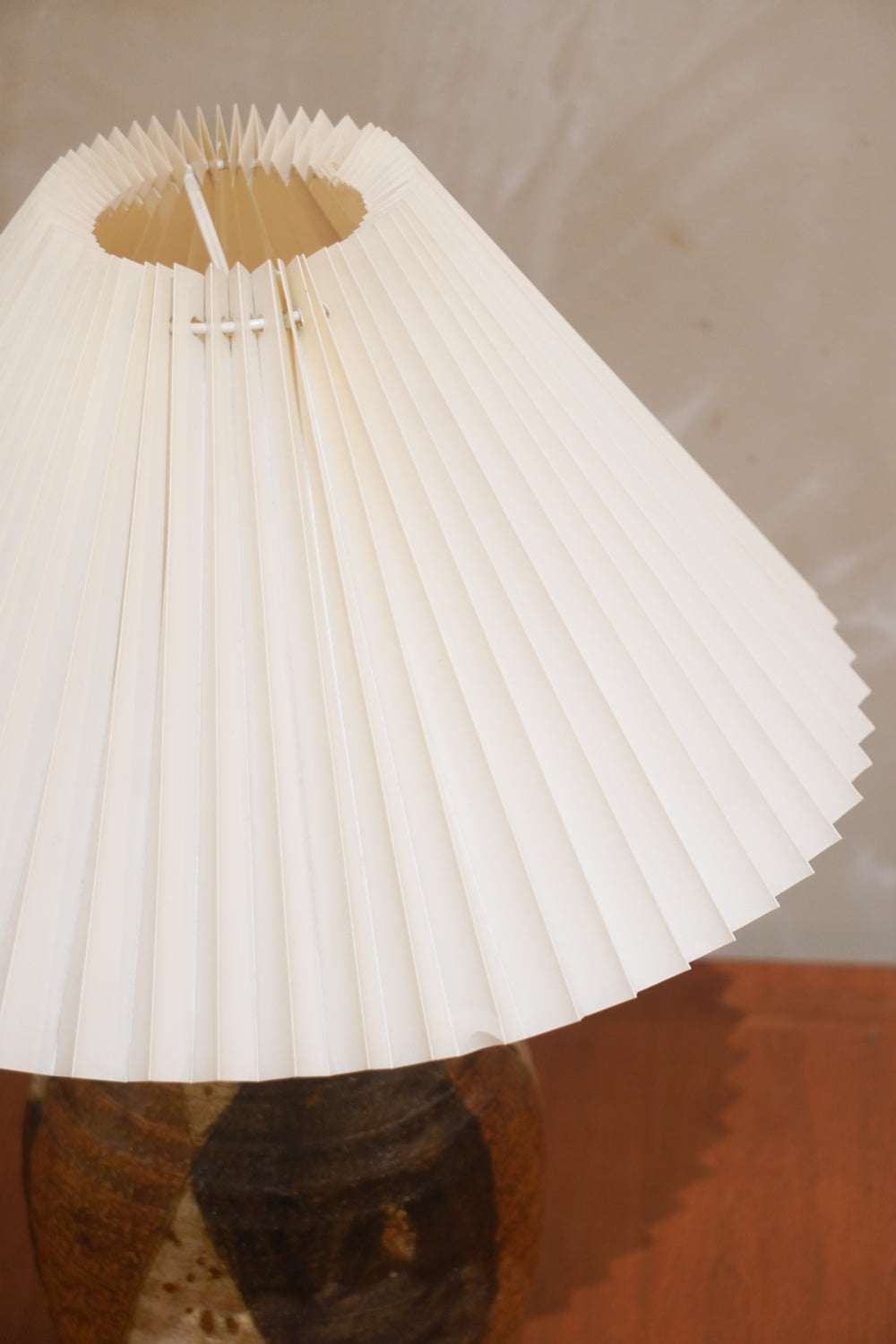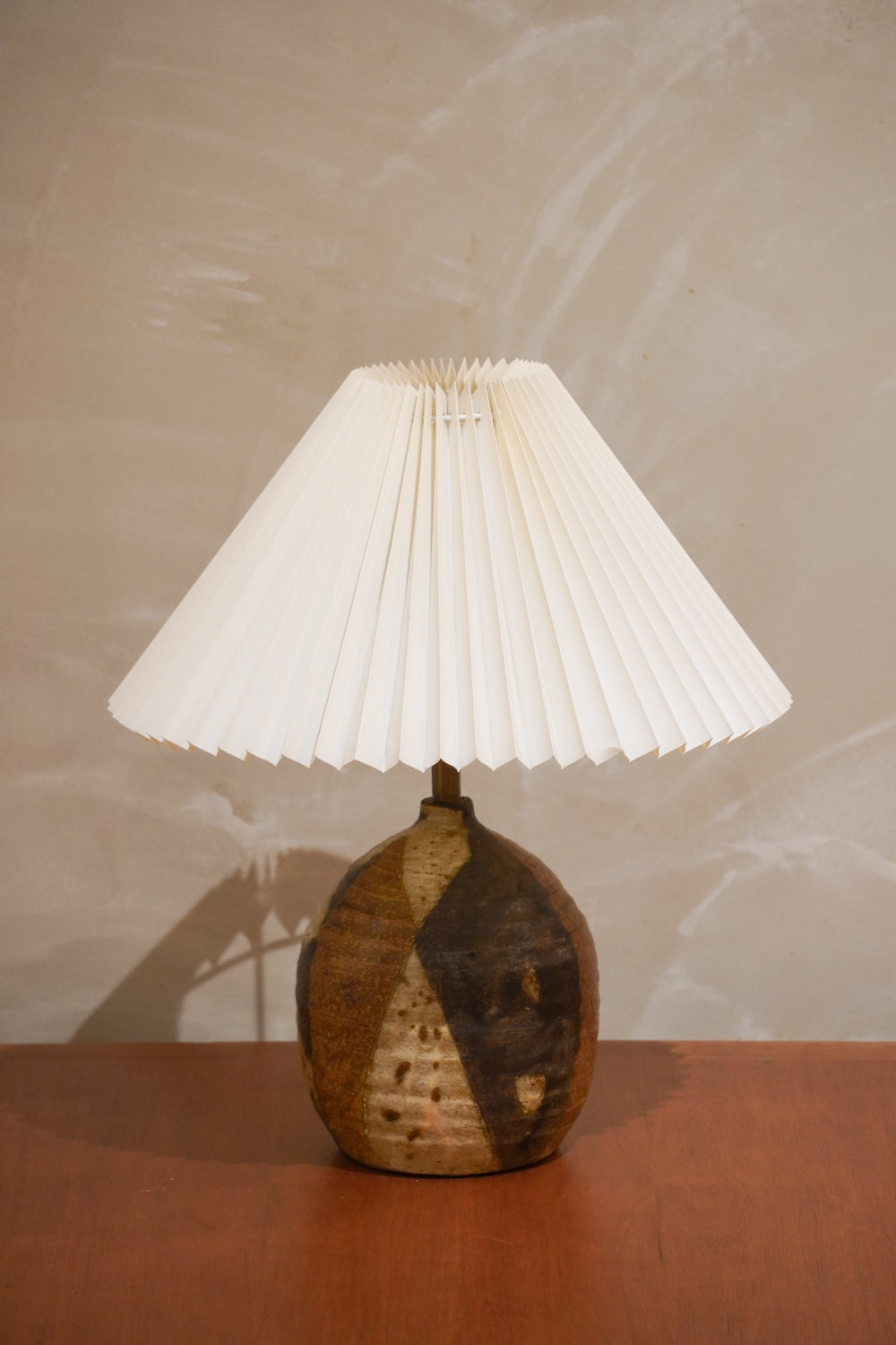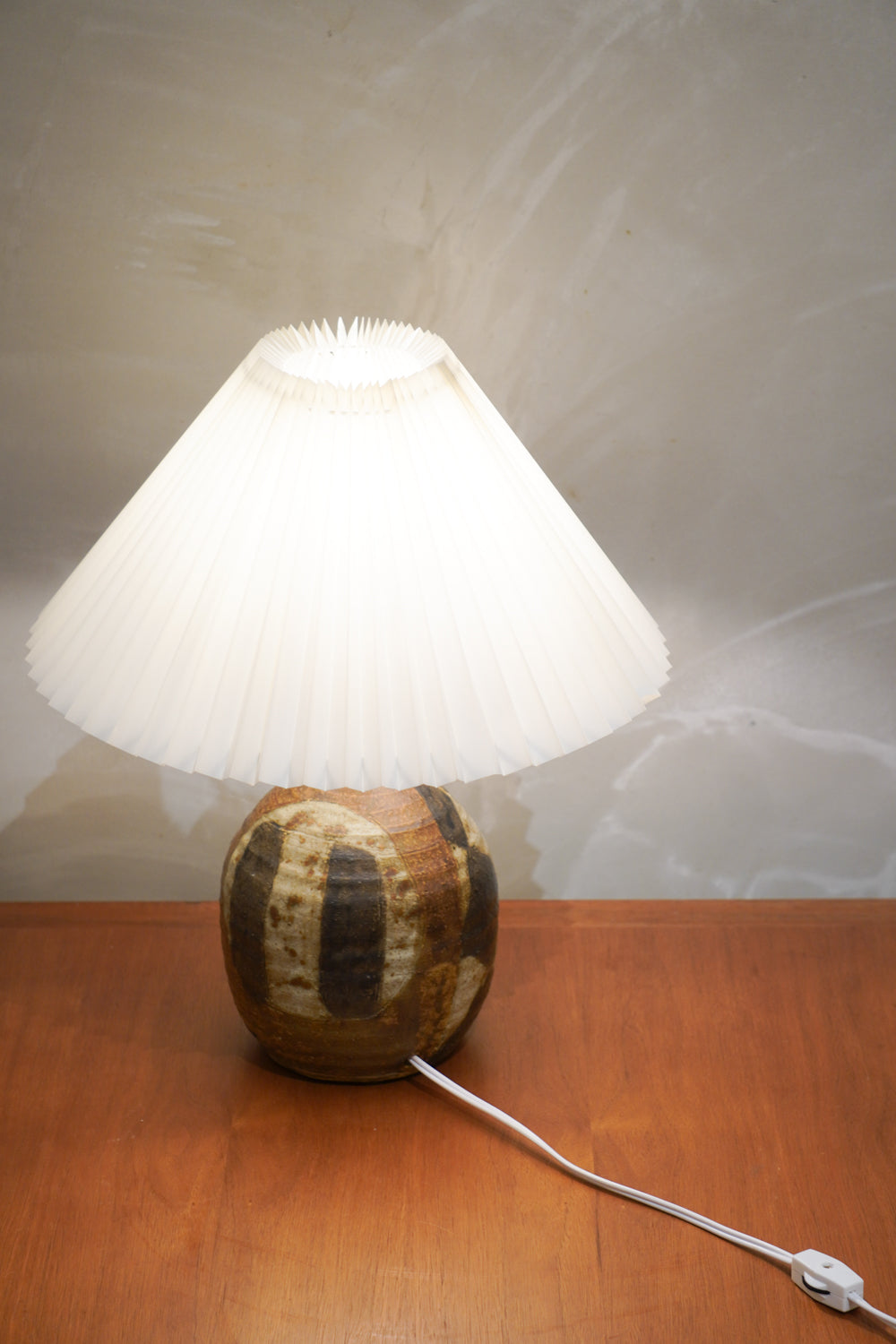 恐らく1960年代ごろの作品であろうこのテーブルランプ、丸いプクッとしたフォルムに色分けされた釉薬と連続した模様、横に走る均等に引かれたロクロ目が全体を引き締めていて面白いバランスで成り立っています。