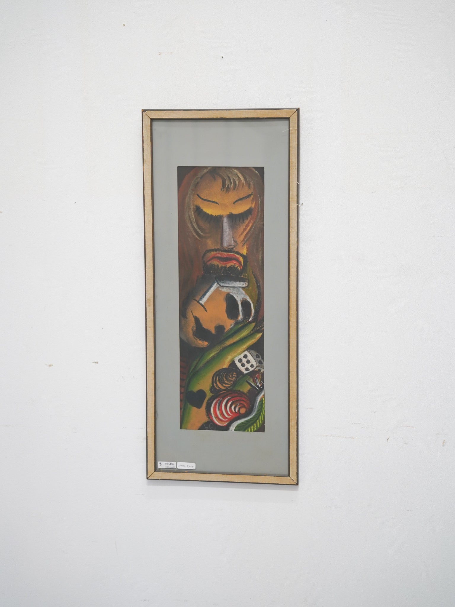 静かに目を閉じた人物の表情と、その傍らに配されたダイスやハートのモチーフが、見る者に物語を語りかけるミステリアスな作品です。