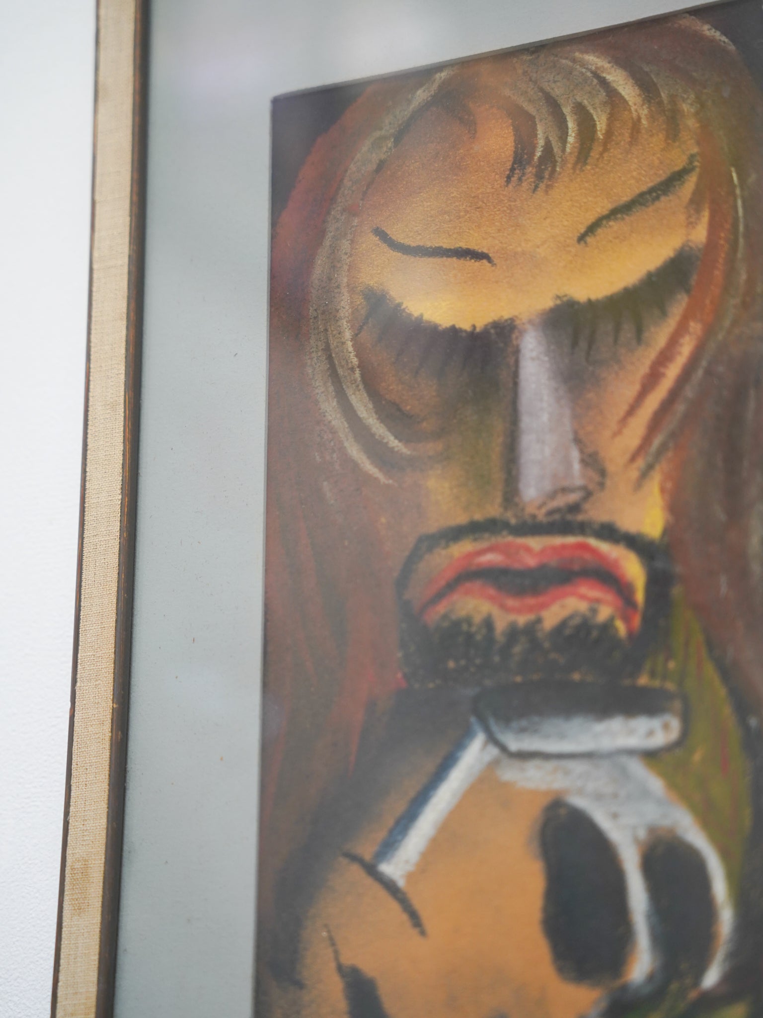 時の流れを感じさせるヴィンテージ調の木製フレームが、作品の持つプリミティブで温かみのある雰囲気を優しく包み込んでいます。