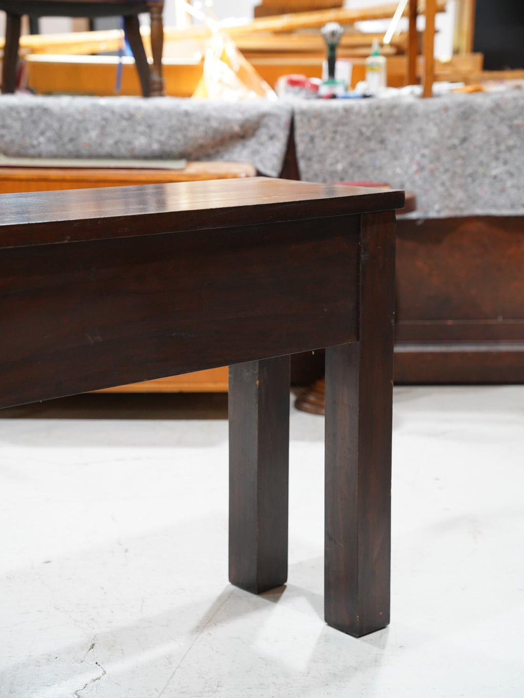 天板には、色の濃淡が美しい木材が並べられ、深みのあるダークブラウンの仕上げが施されています。この落ち着いた色合いと自然な木目は、空間に温もりとヴィンテージな雰囲気をもたらします。