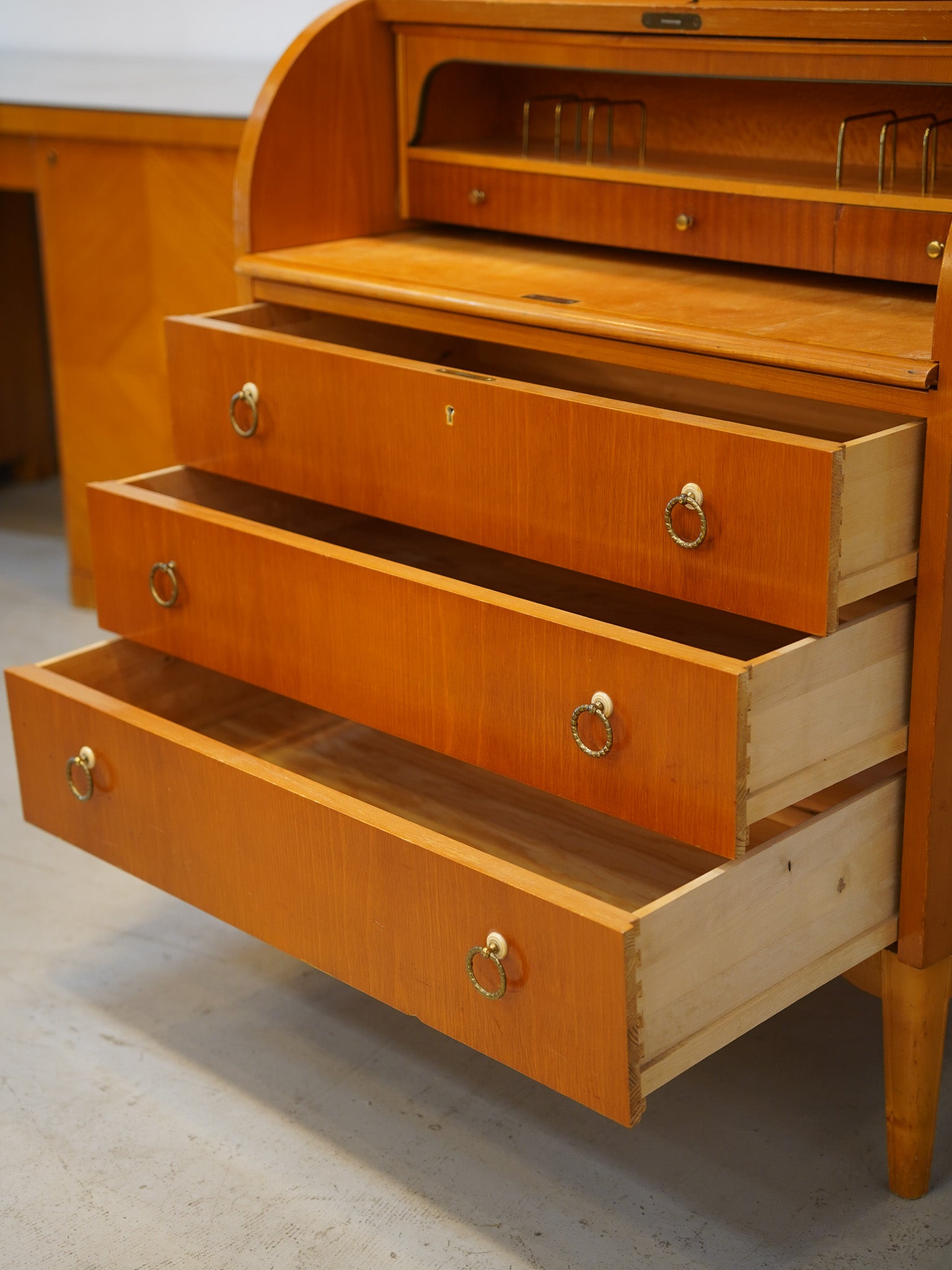 引き出しは3段あり、収納力も十分。ロール部分を開けると小物や書類を整理できるデスクスペースが現れ、実用性にも優れています。