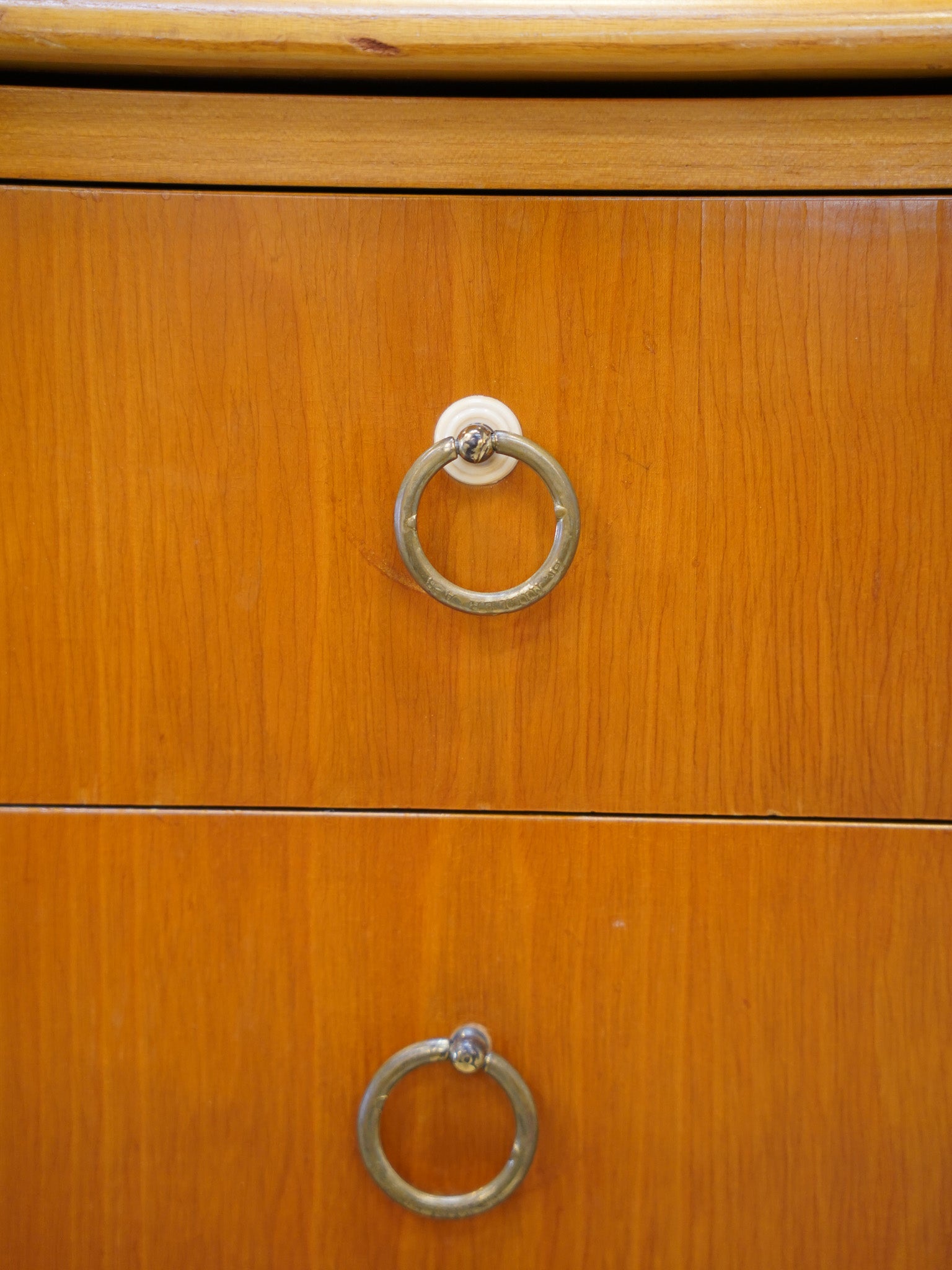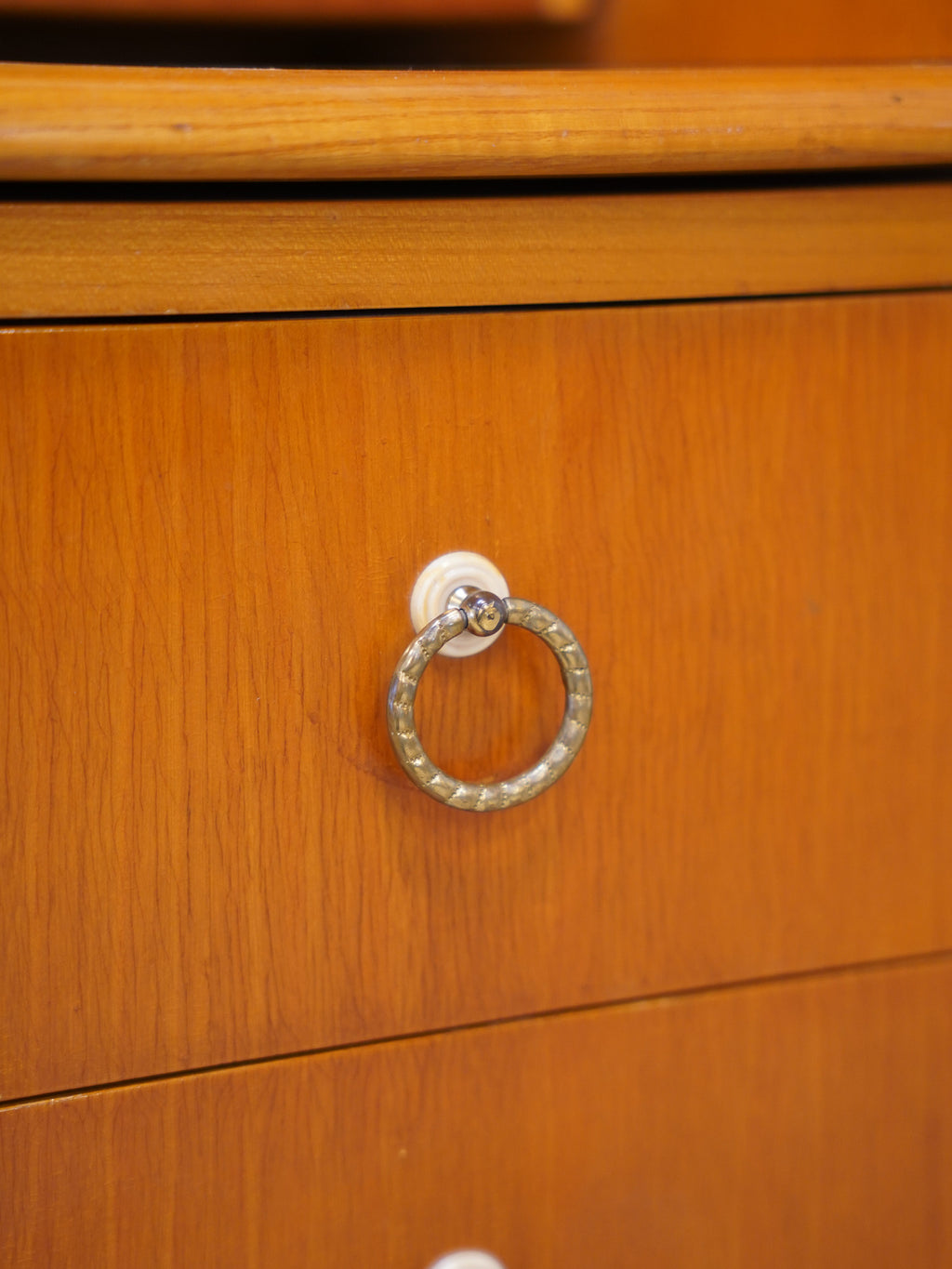艶やかな木肌と上品な光沢を持つ真鍮の取手が、北欧ヴィンテージらしい温もりと気品を漂わせます。