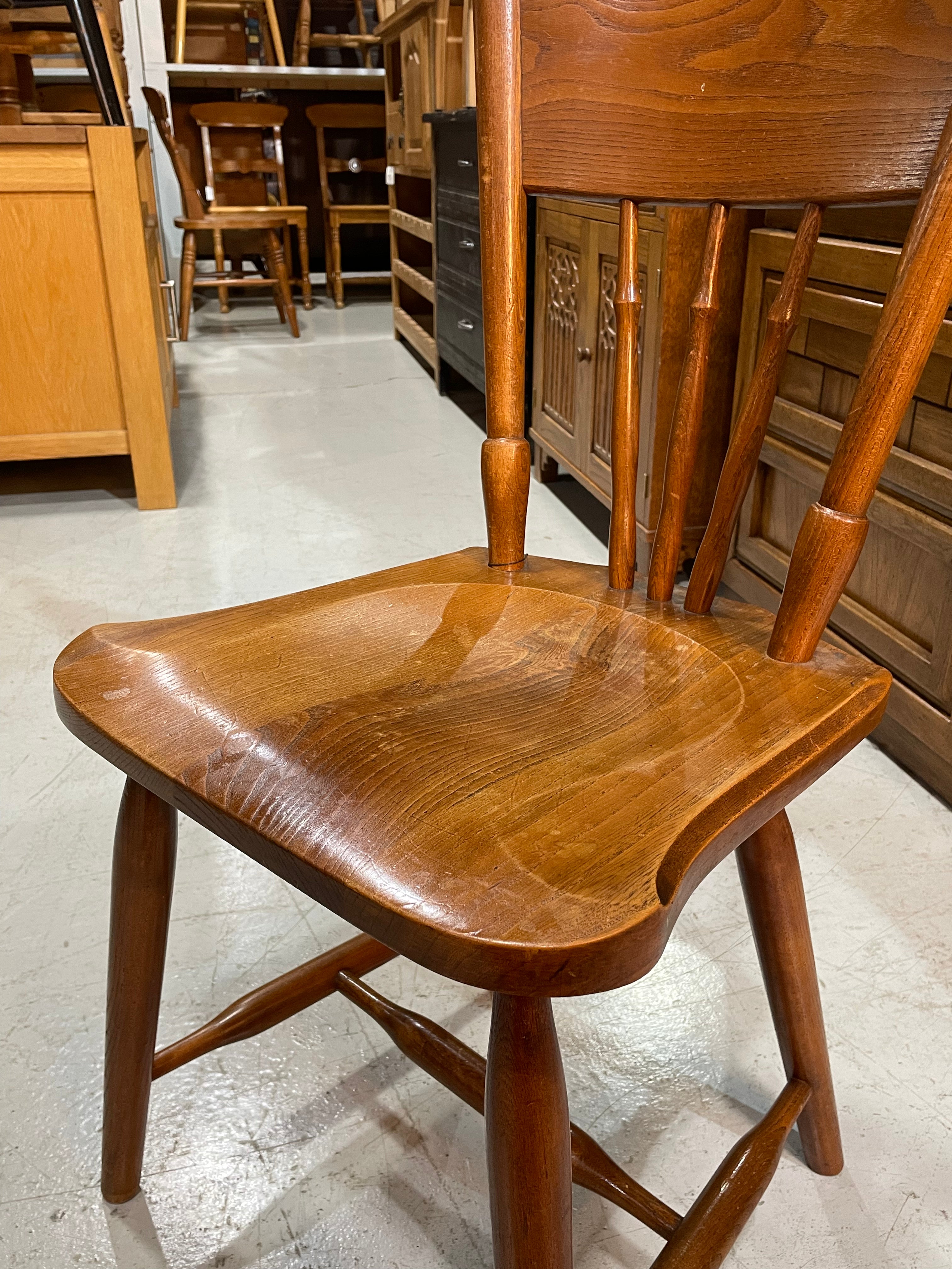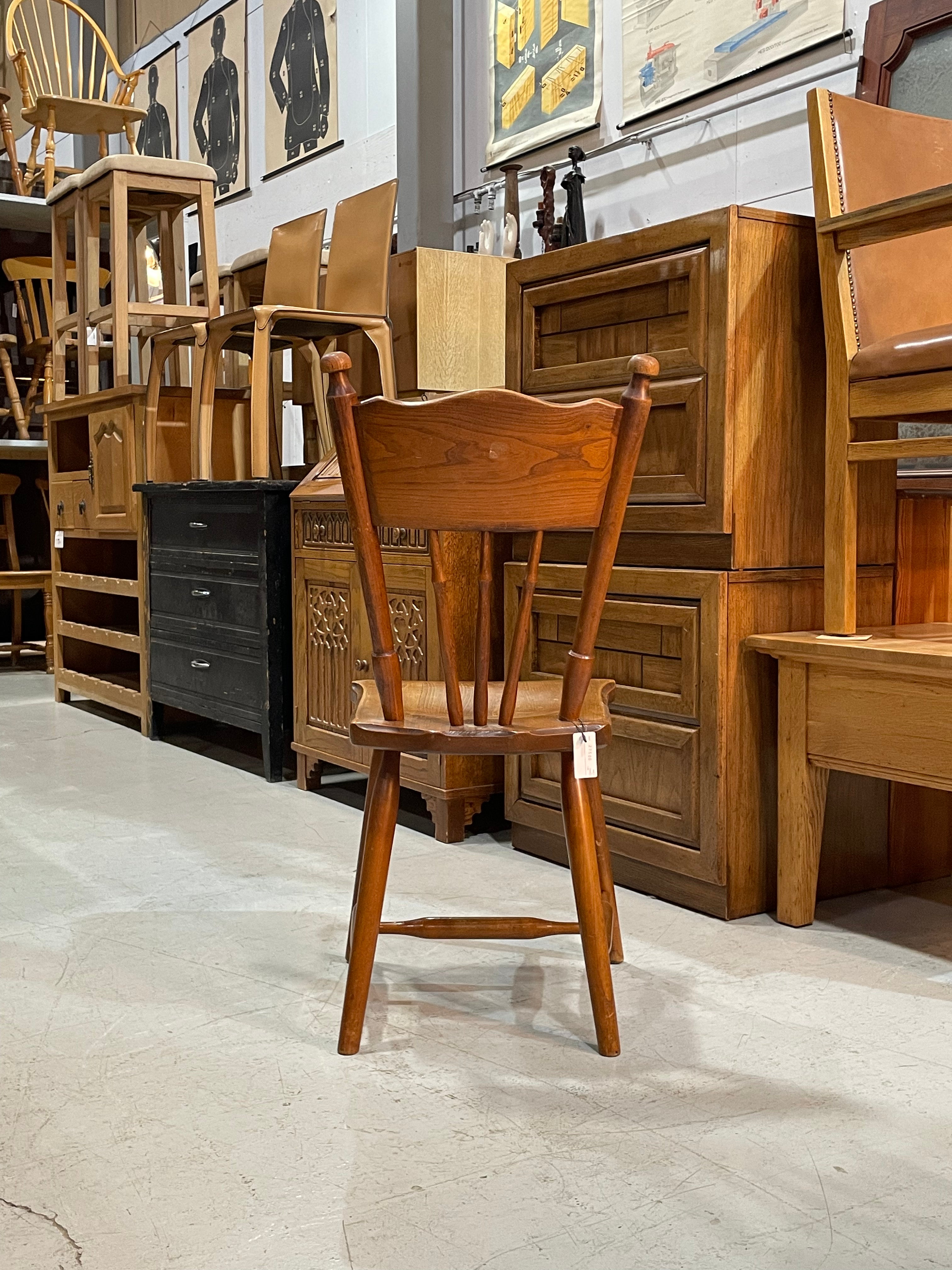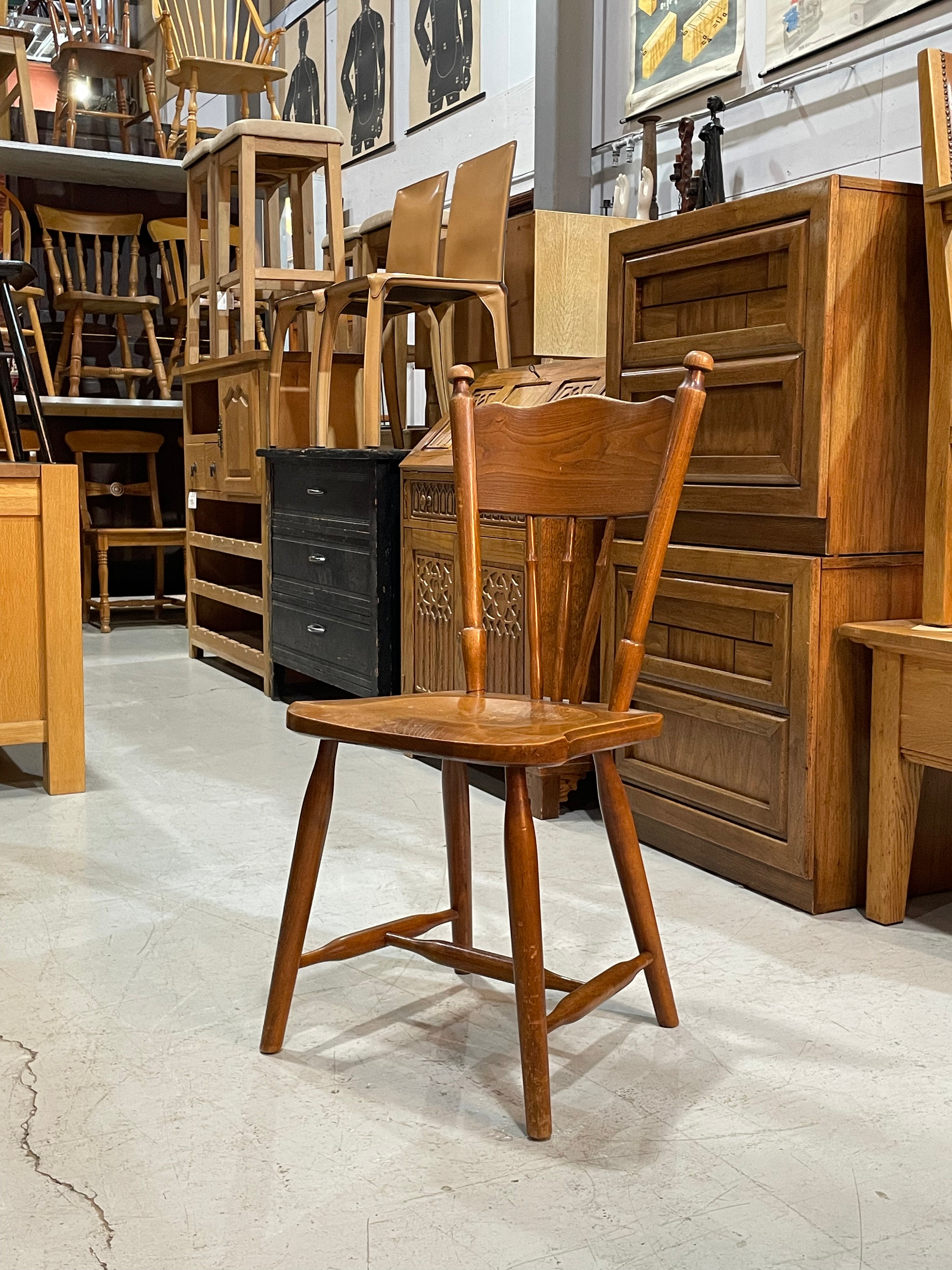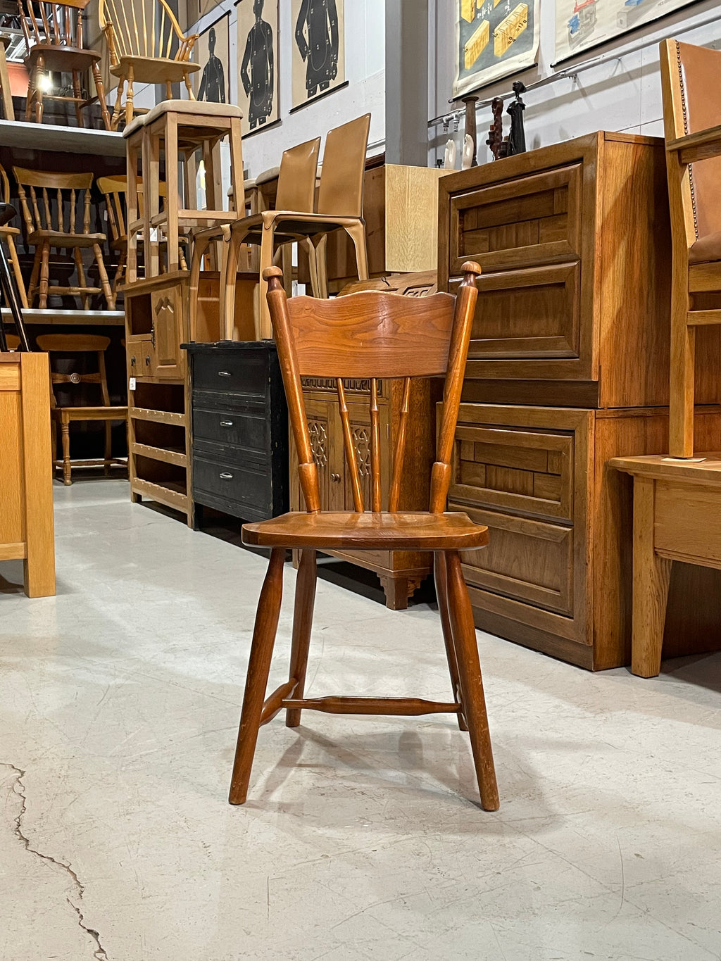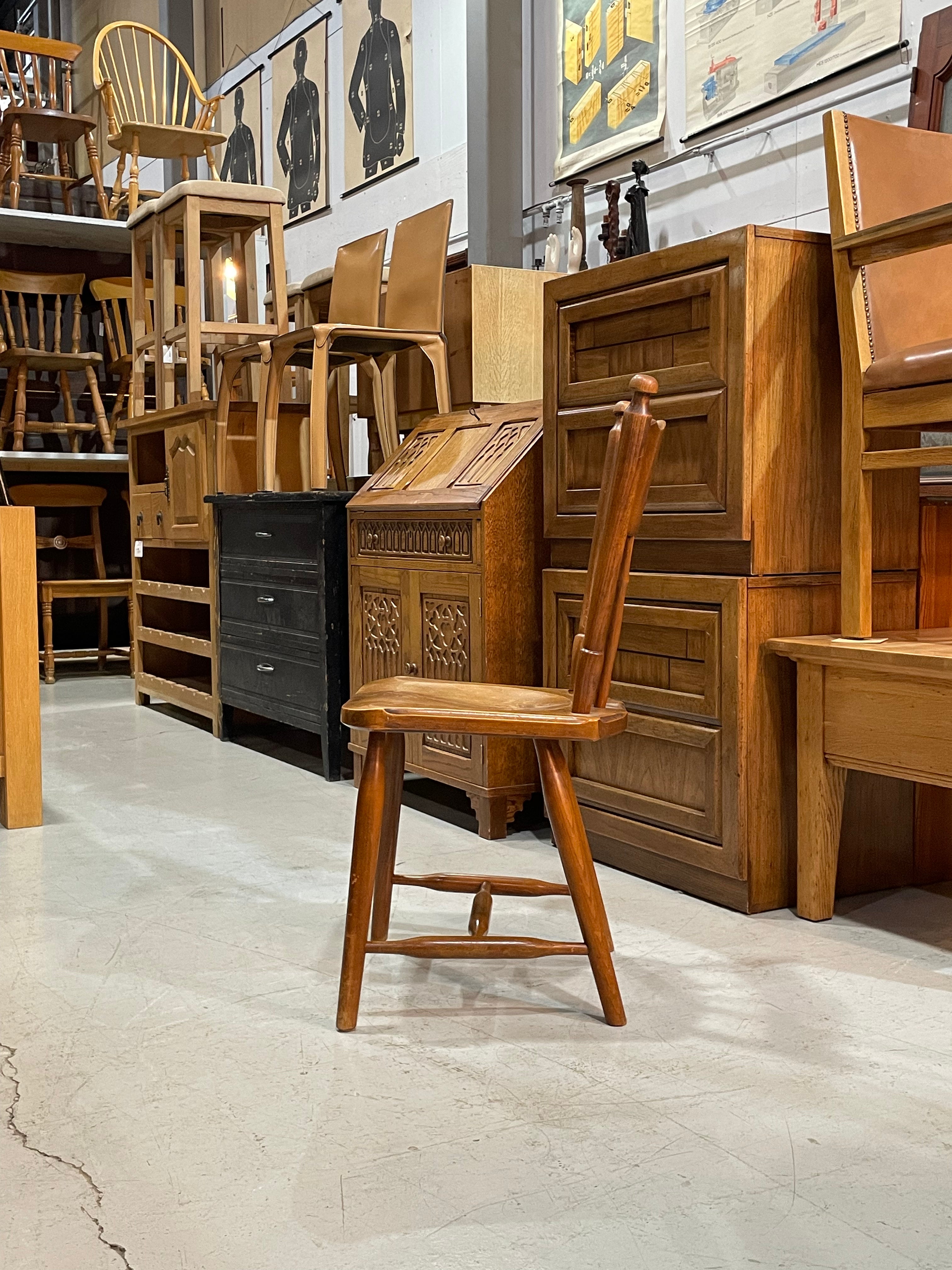 背もたれに縦に並ぶ繊細な挽物細工は、「スピンドル」と呼ばれ、イギリスの伝統的なウィンザーチェアの流れを汲む「スピンドルバックチェア」の特徴です。背もたれ上部は緩やかなカーブを描き、優しく背中を支えます。また、脚部や貫にも挽物加工が施され、素朴でありながらもクラシカルな雰囲気を醸し出しています。丸く象られた背柱の先端が愛らしいアクセントになっています。