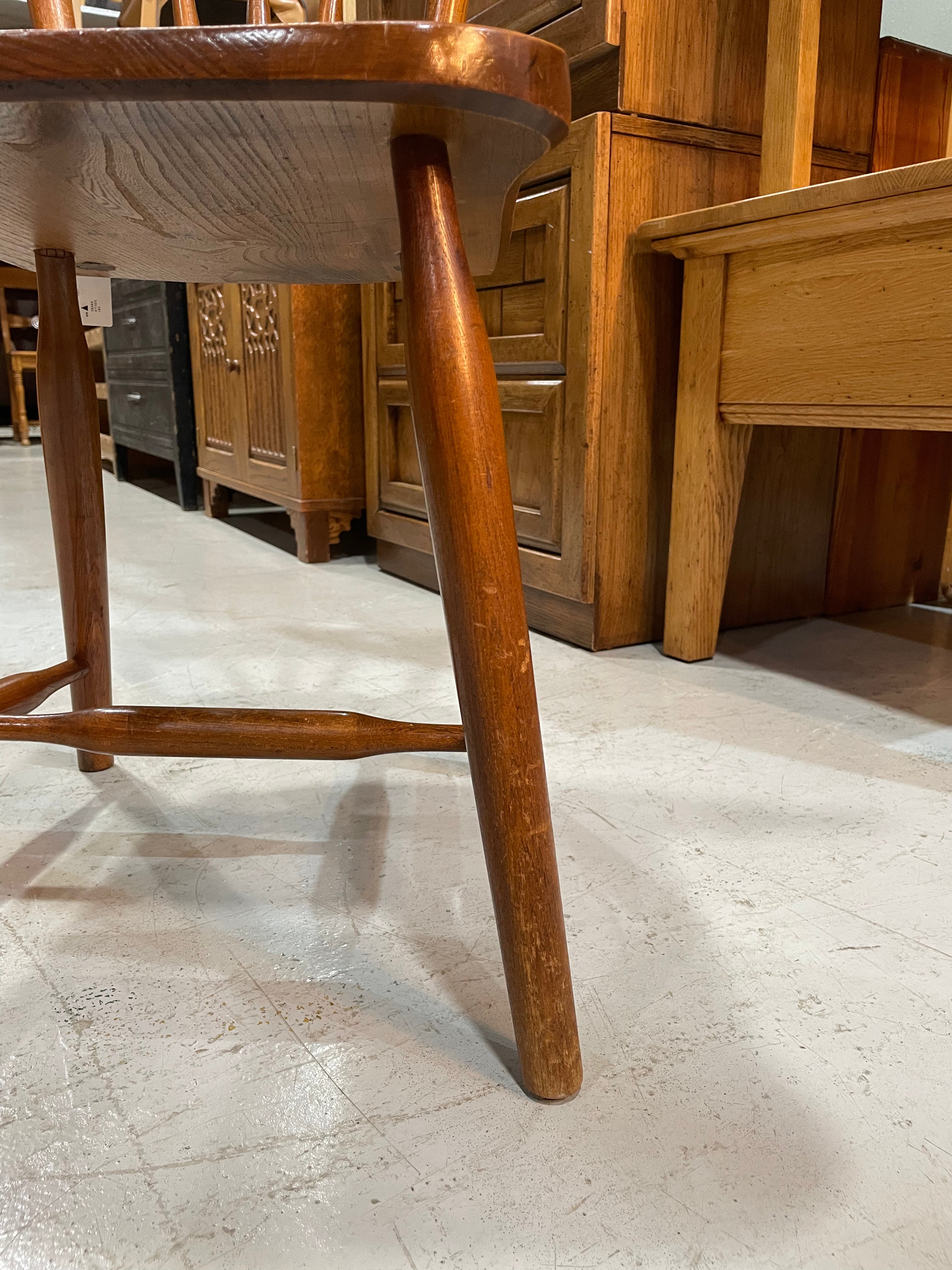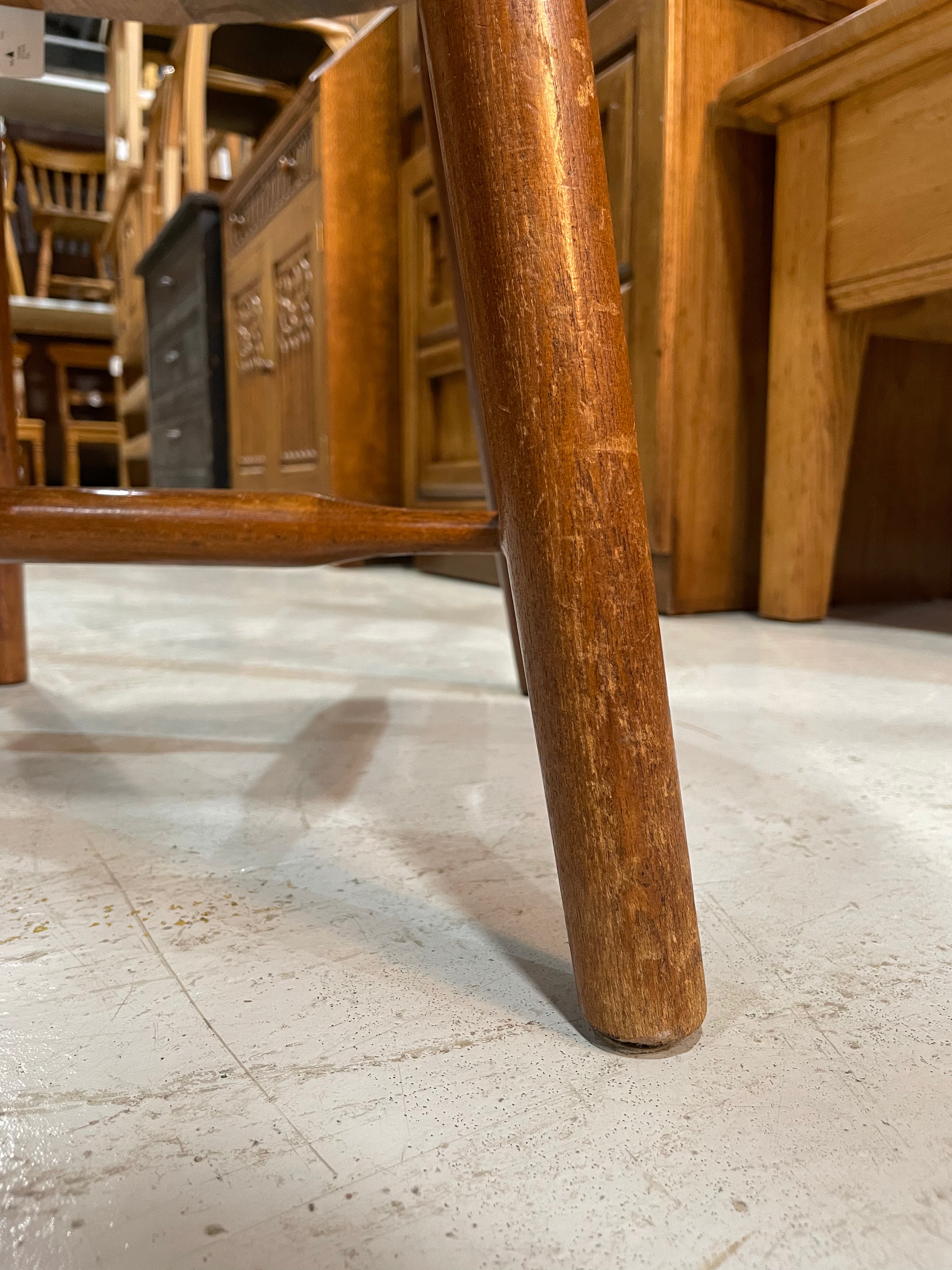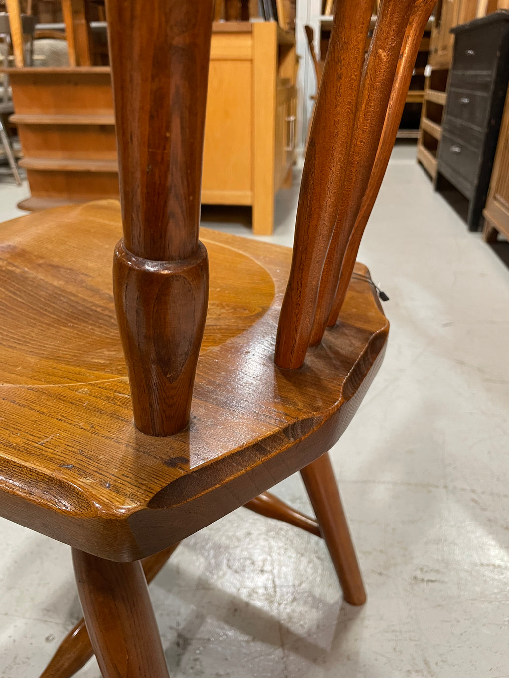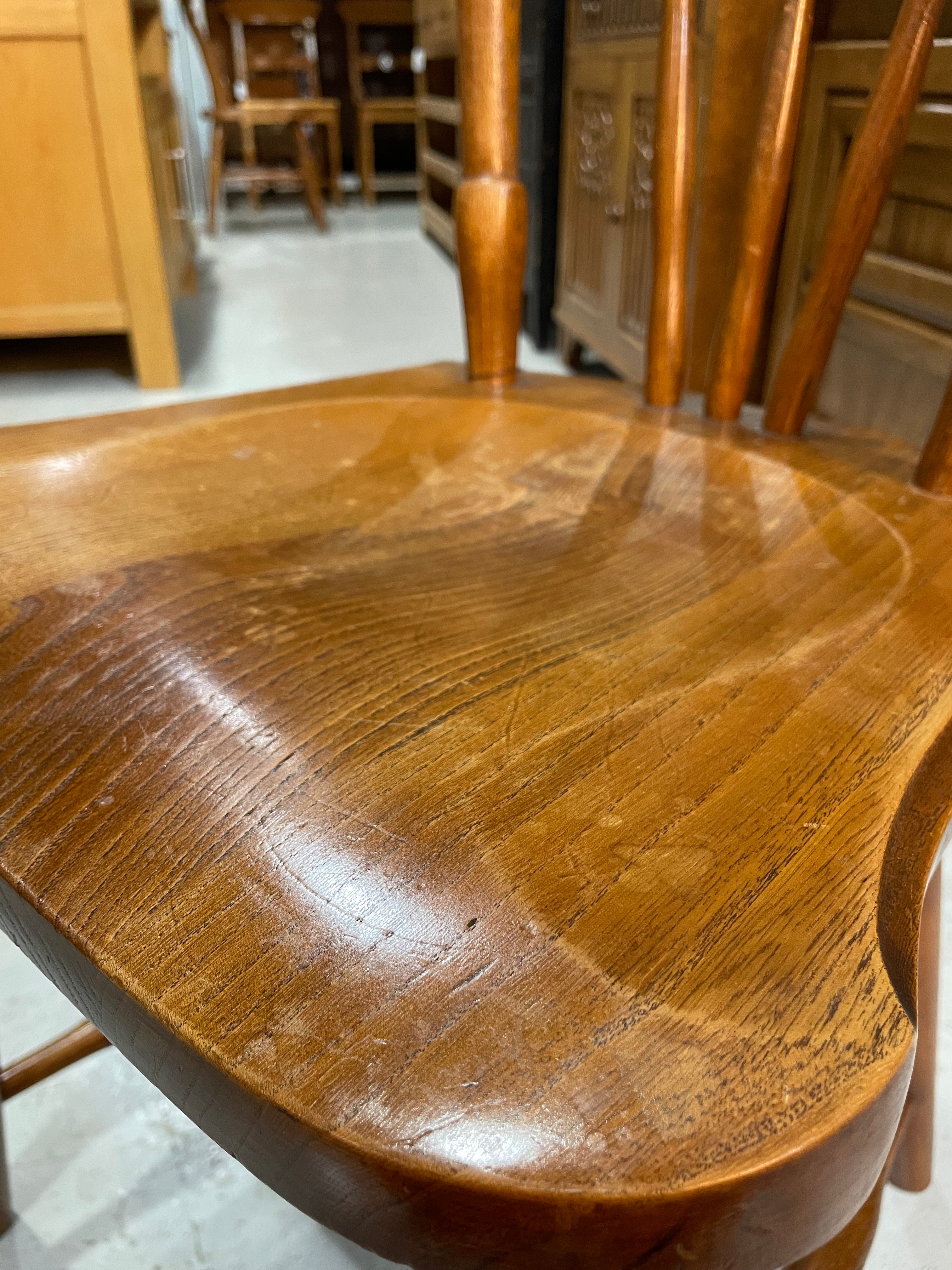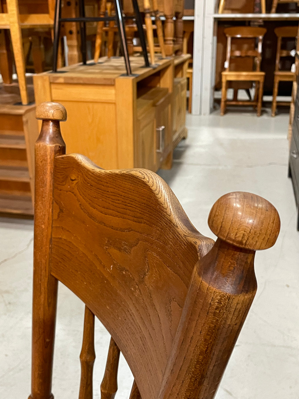 背もたれに縦に並ぶ繊細な挽物細工は、「スピンドル」と呼ばれ、イギリスの伝統的なウィンザーチェアの流れを汲む「スピンドルバックチェア」の特徴です。背もたれ上部は緩やかなカーブを描き、優しく背中を支えます。また、脚部や貫にも挽物加工が施され、素朴でありながらもクラシカルな雰囲気を醸し出しています。丸く象られた背柱の先端が愛らしいアクセントになっています。