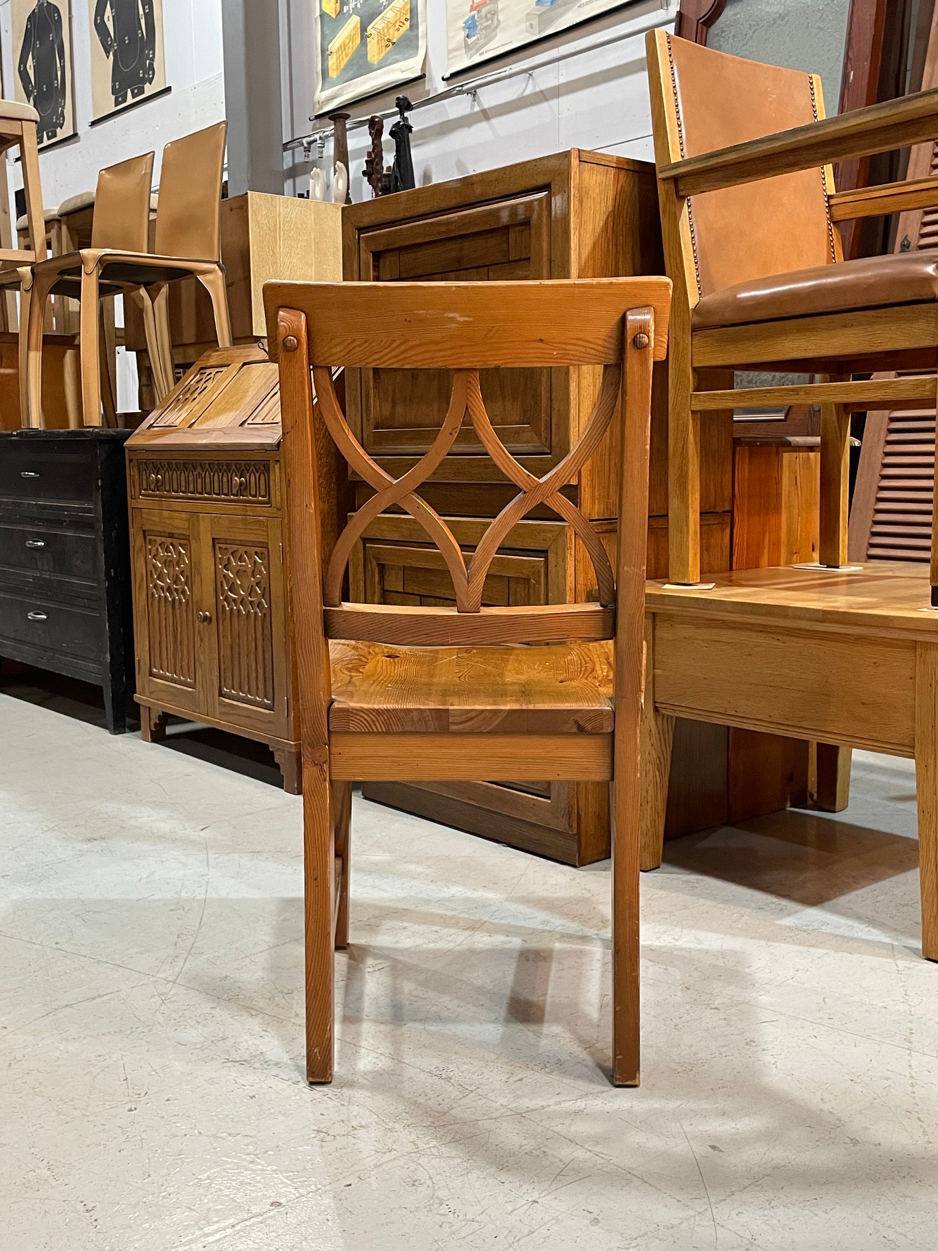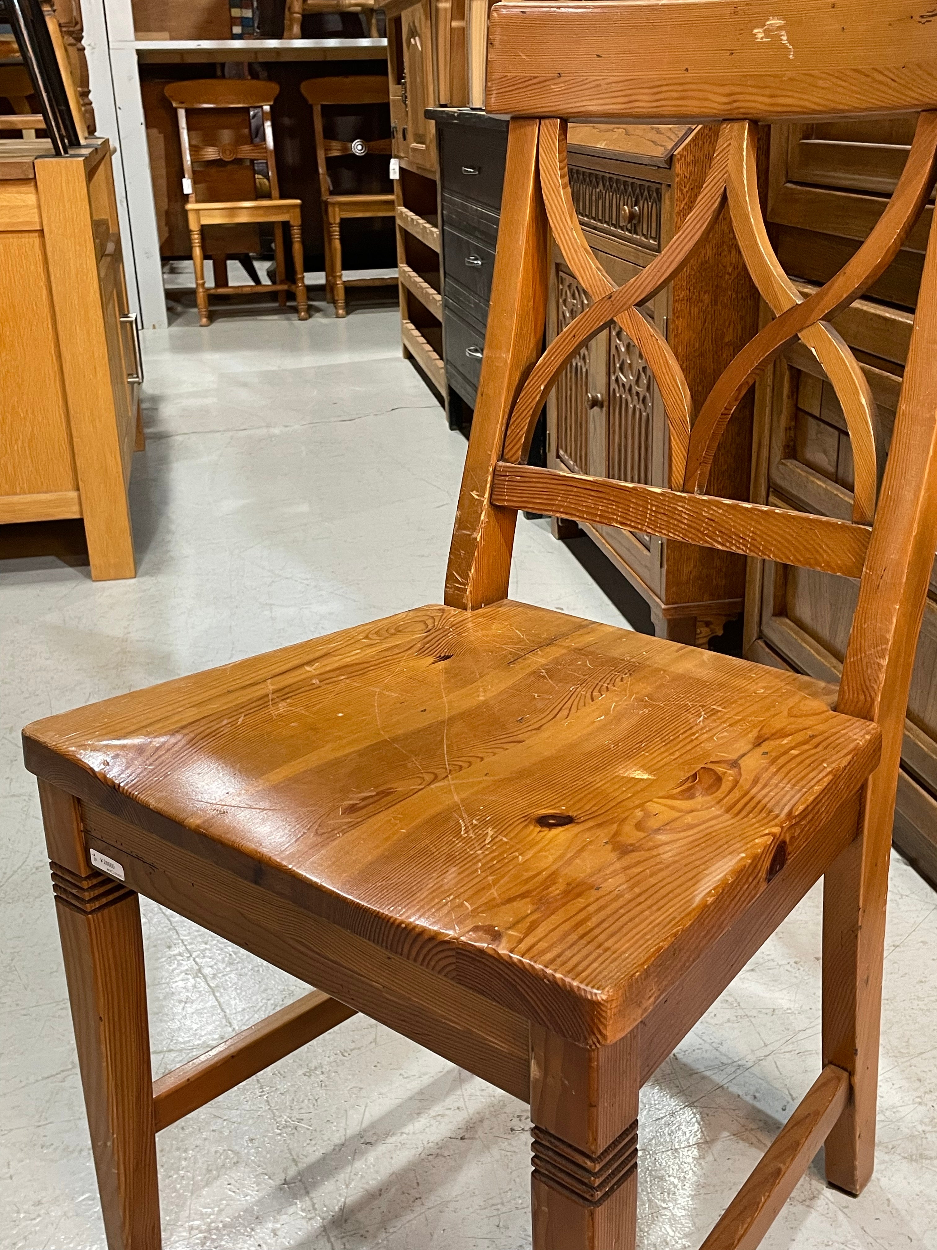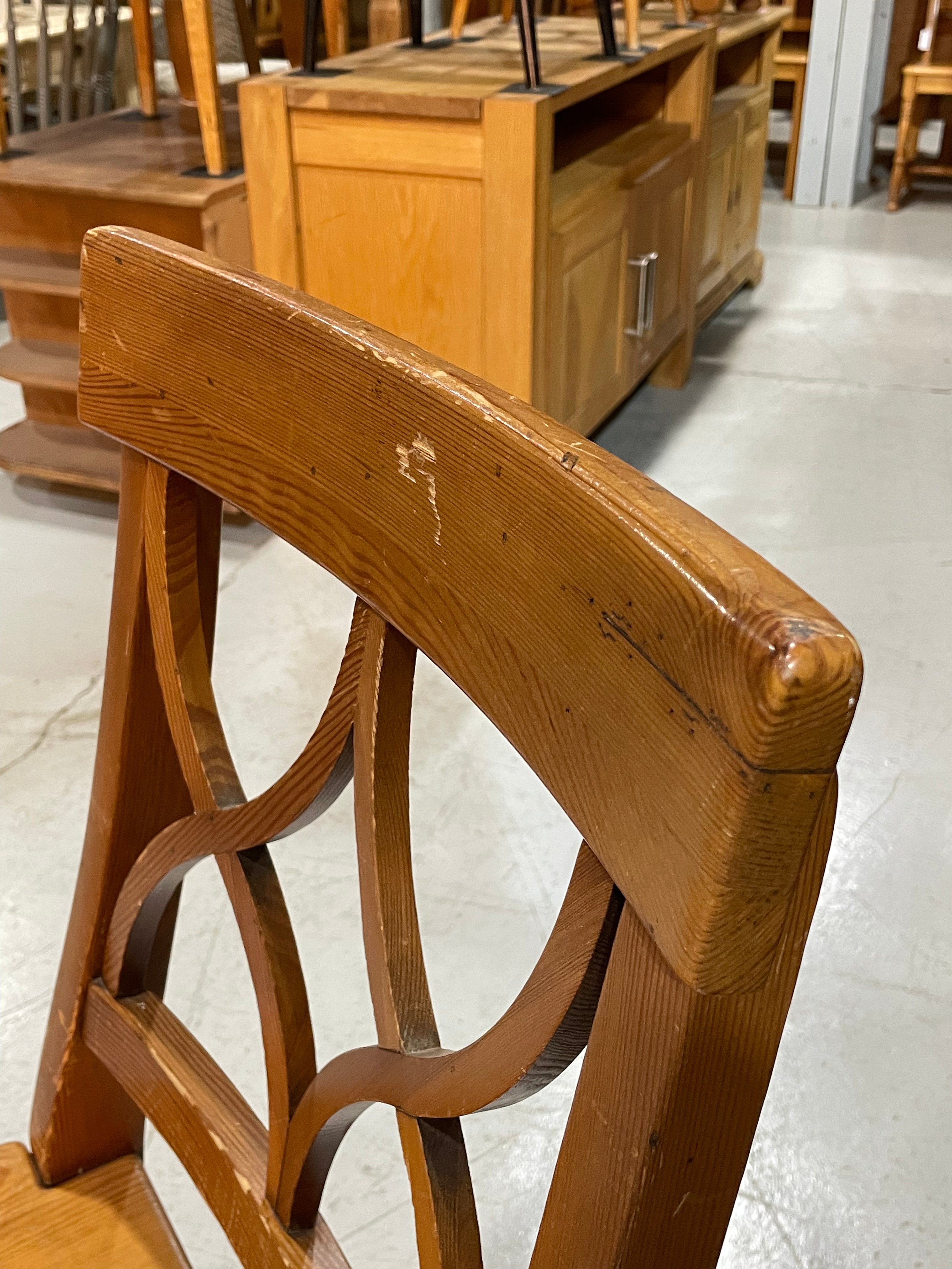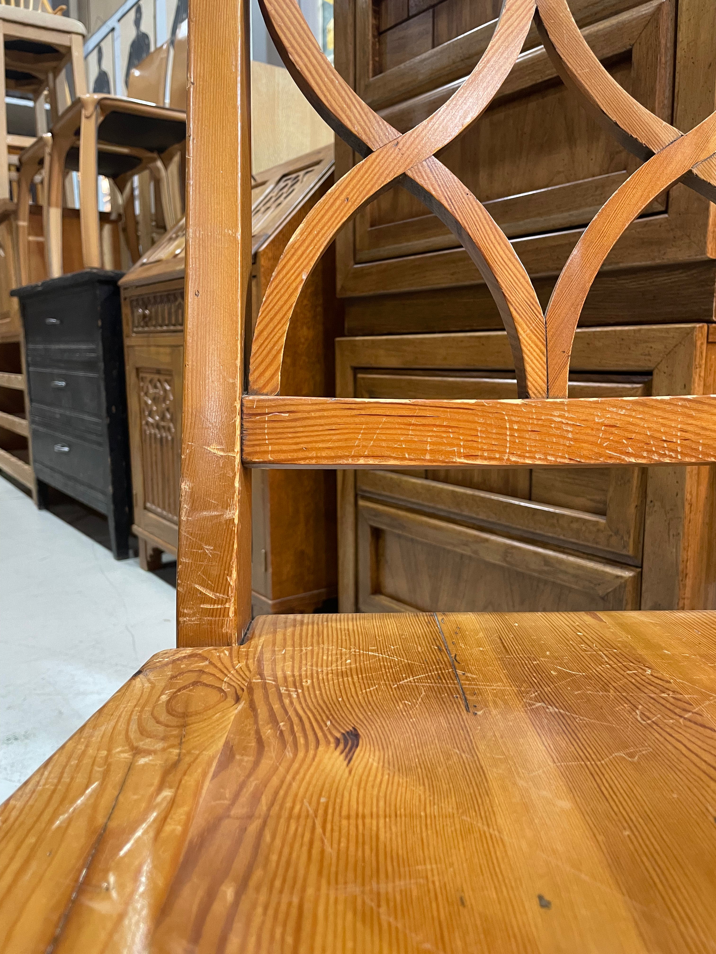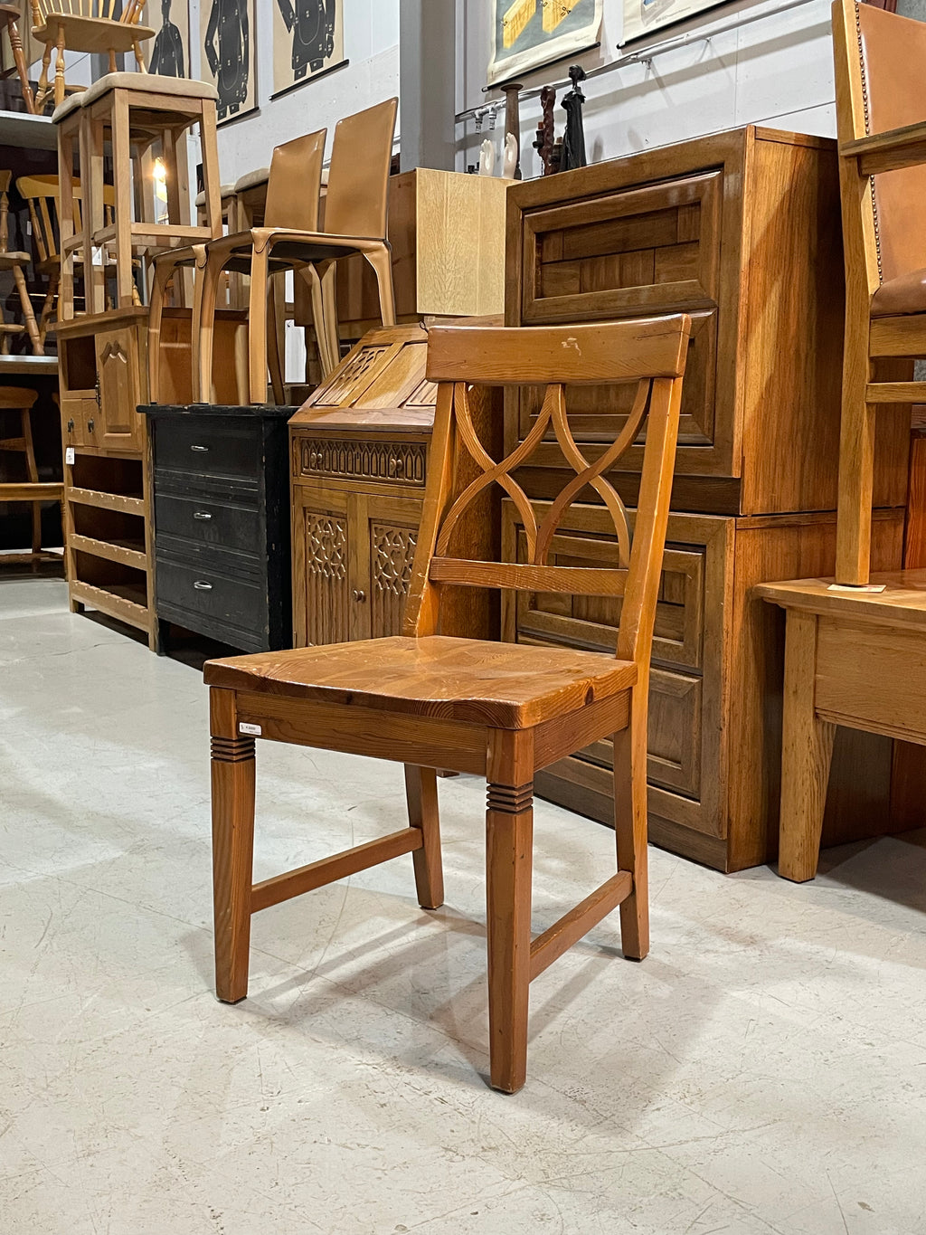 優美な曲線を描く背もたれの透かし彫りが目を引く、クラシカルなデザインの木製ダイニングチェアです。