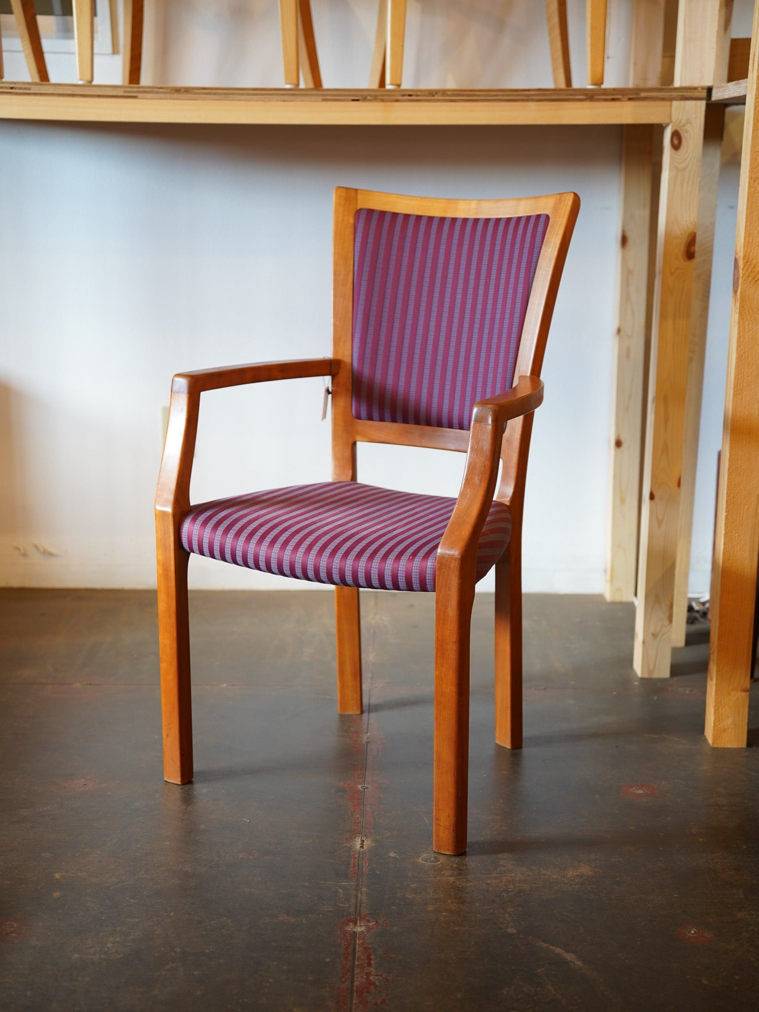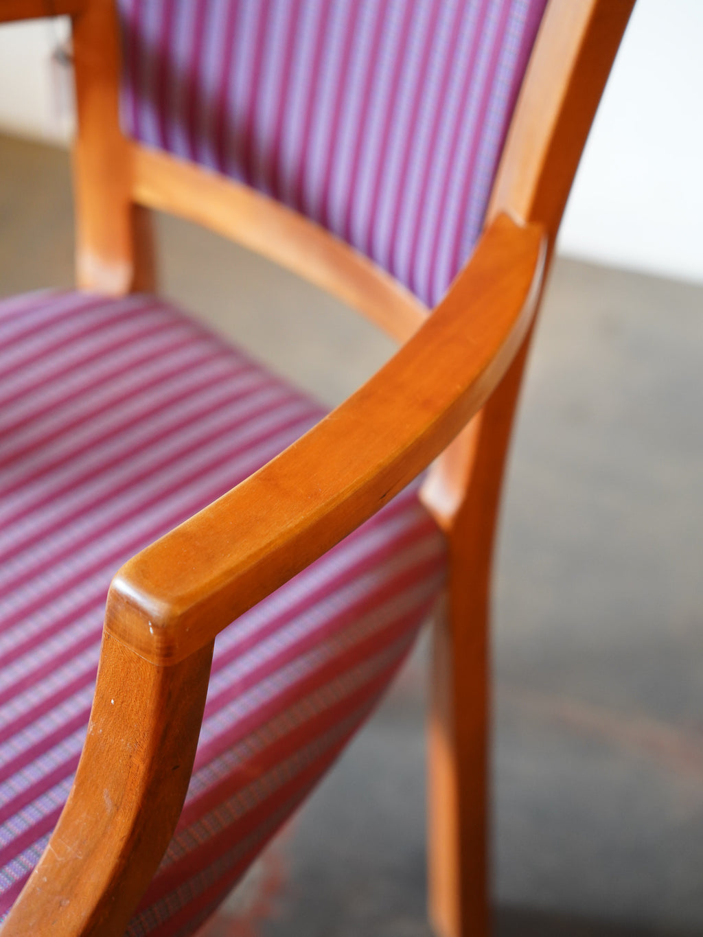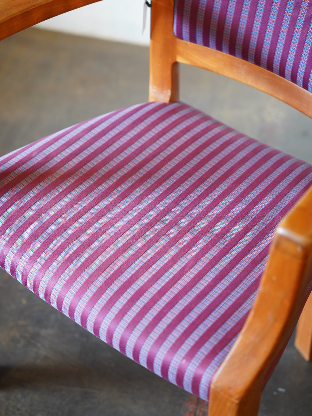 フレームは明るい木肌で、座面と背もたれには個性的で鮮やかな紫系のストライプファブリックが張られています。