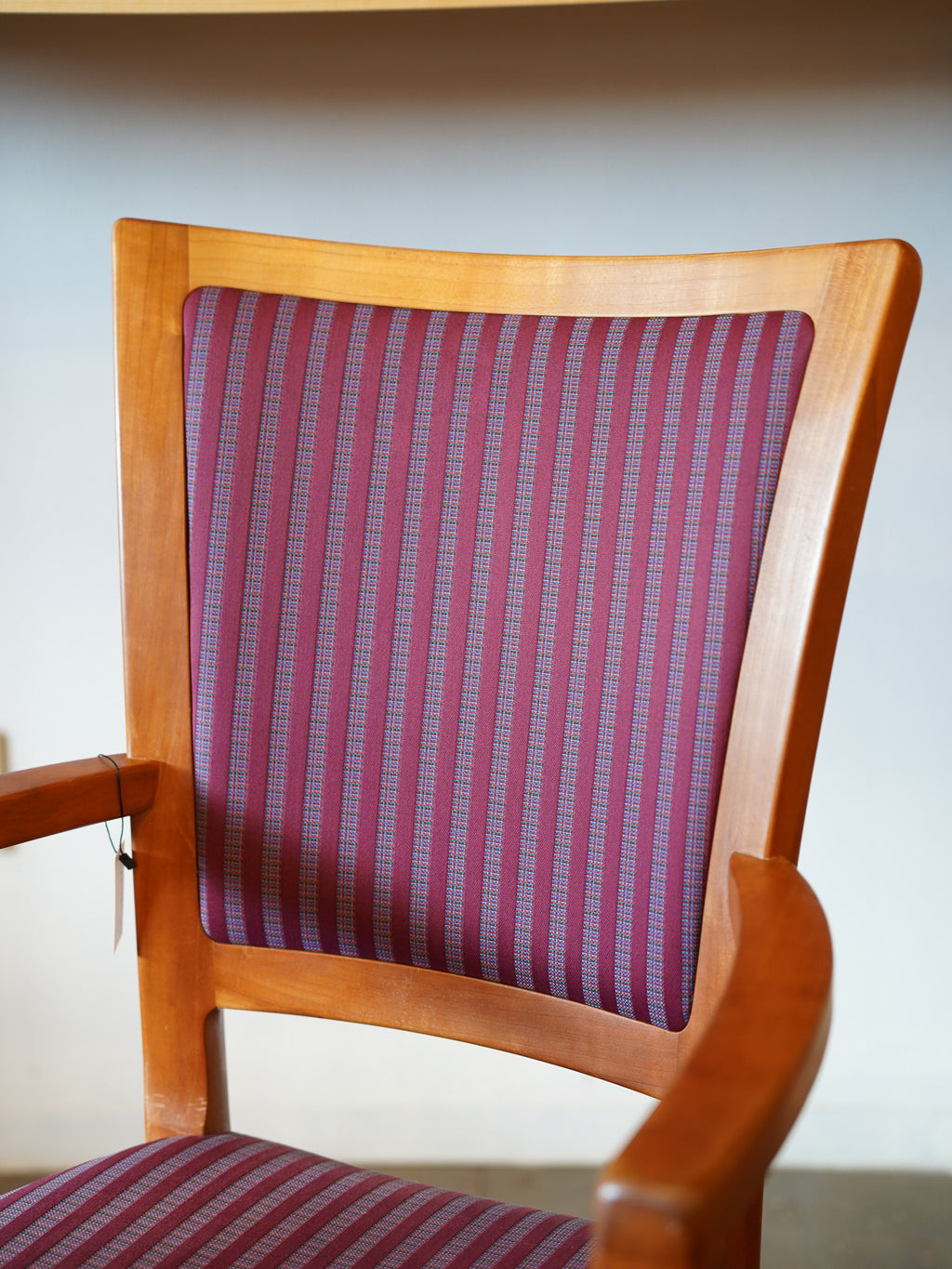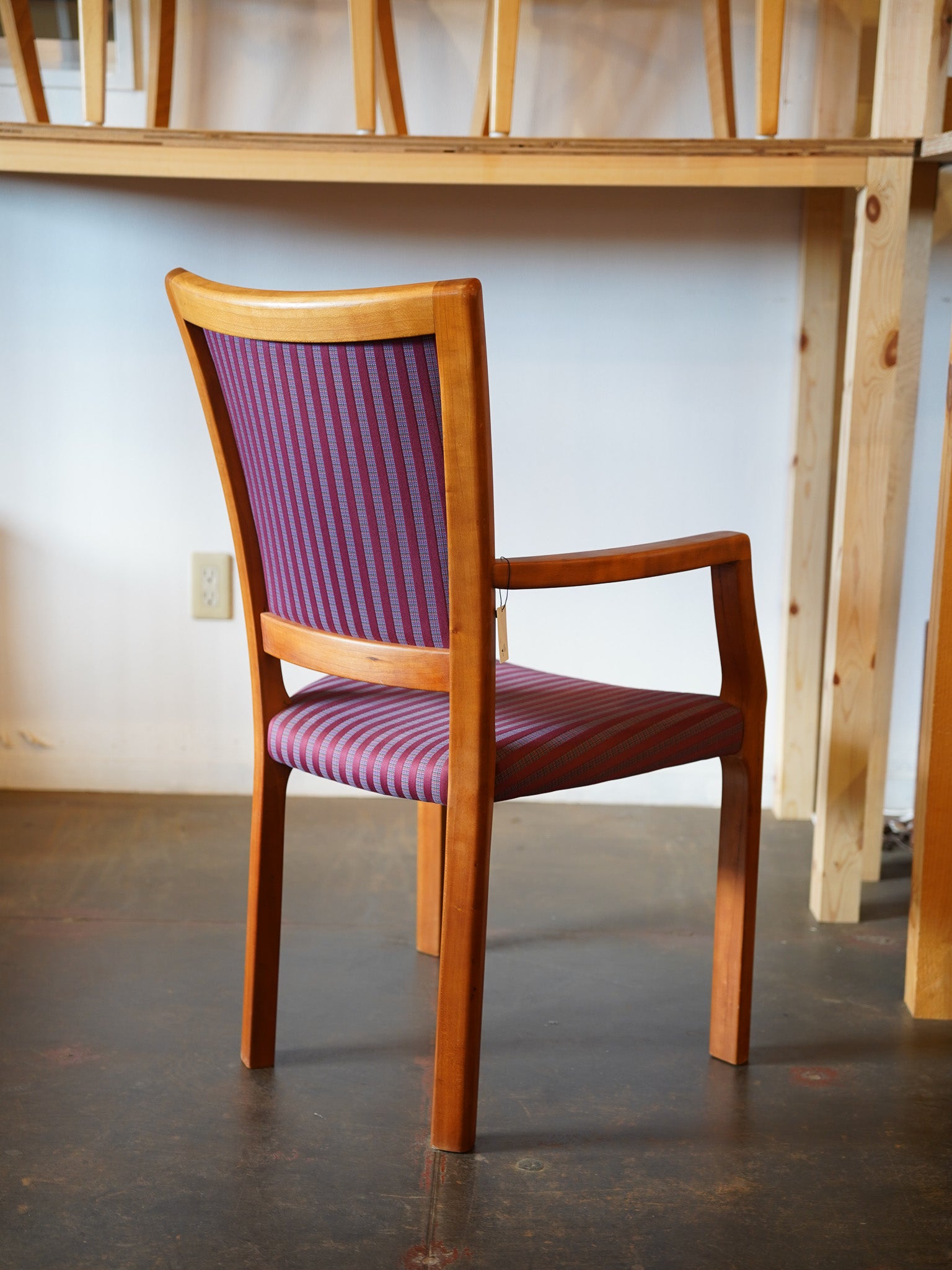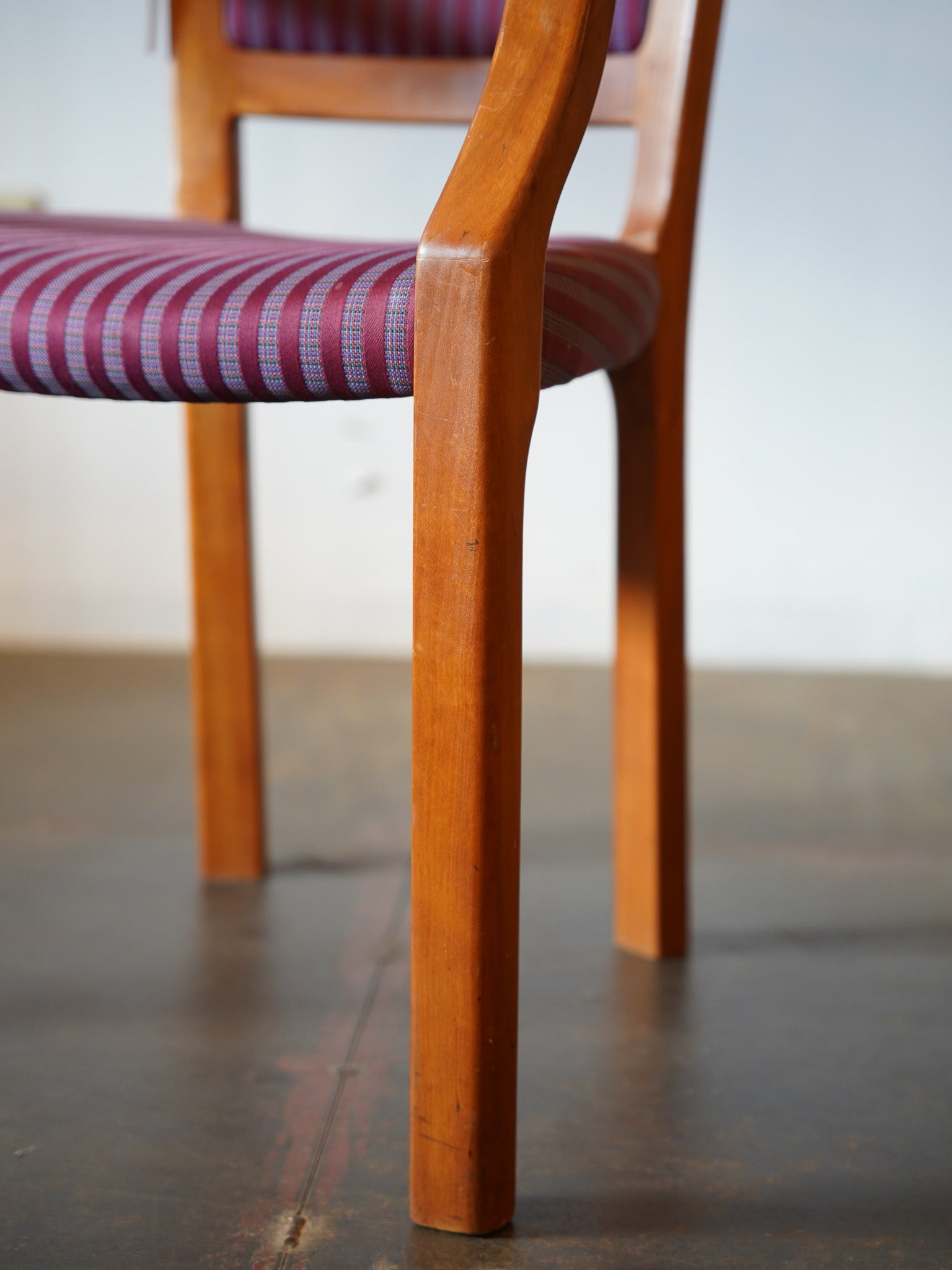 フレームは明るい木肌で、座面と背もたれには個性的で鮮やかな紫系のストライプファブリックが張られています。