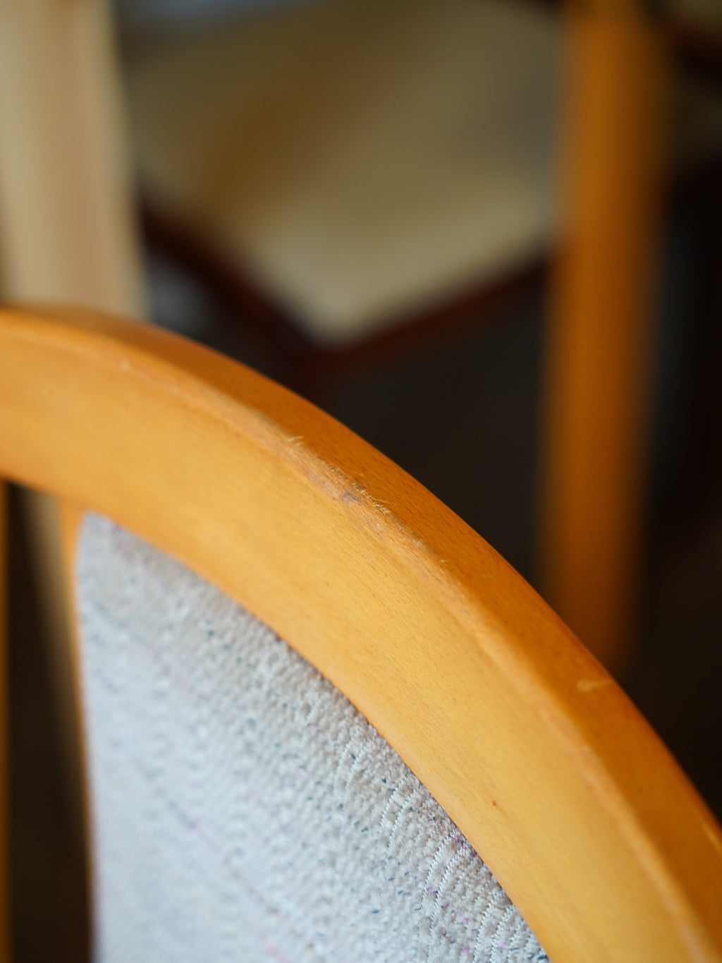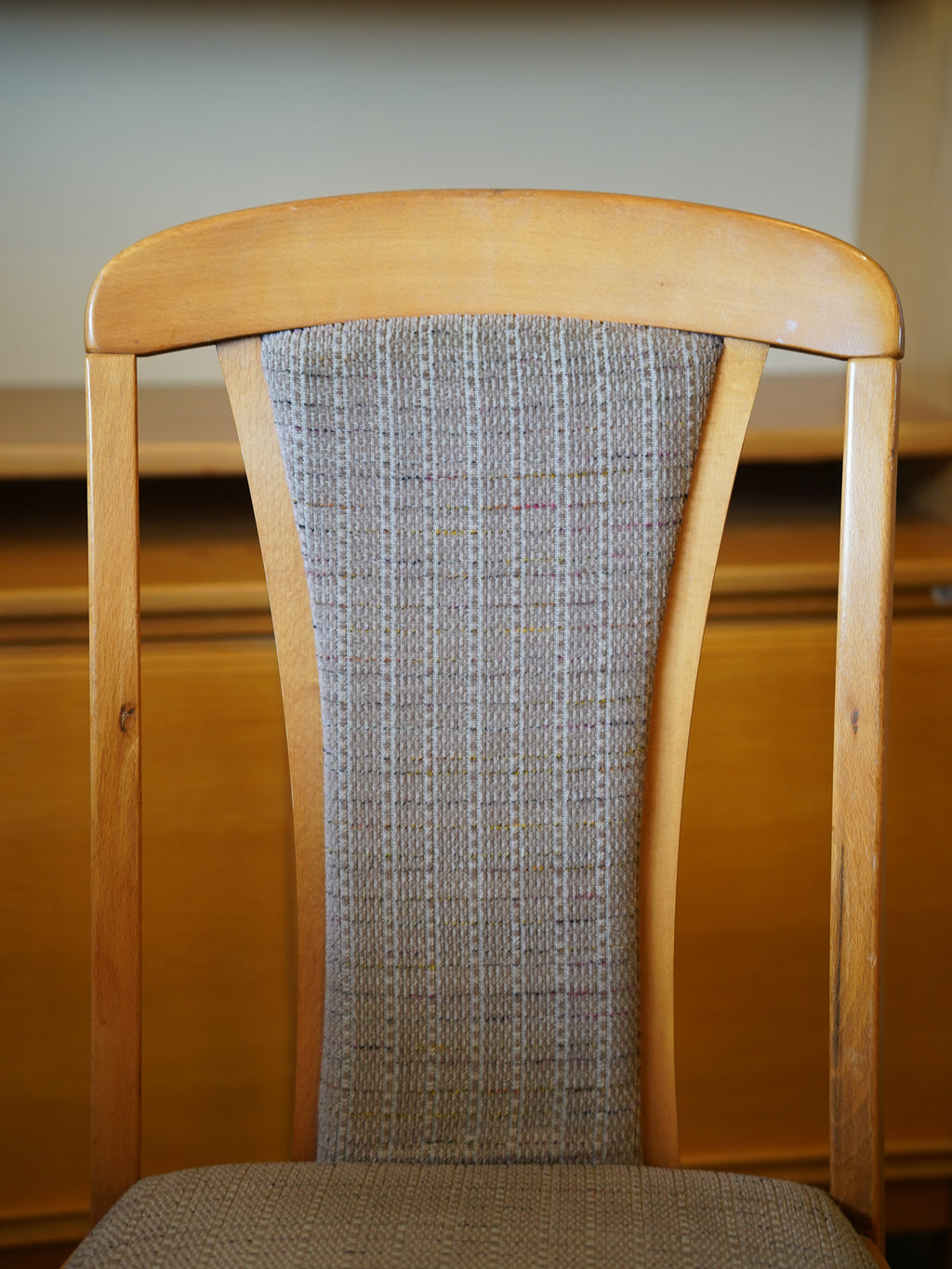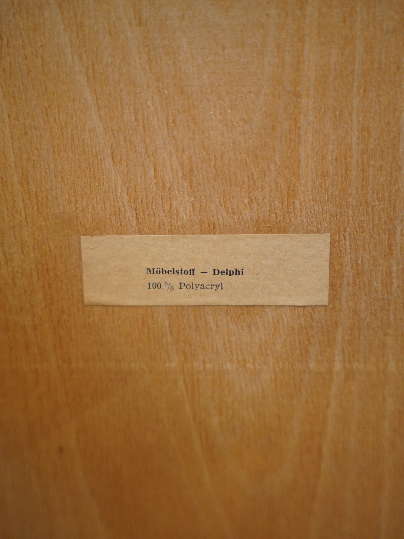 座面と背板には、ドイツ語表記のあるポリアクリル製(アクリル繊維)の耐久性の高いファブリックが張られており、淡いグレイッシュトーンの細かい柄が軽快な印象を与えます。