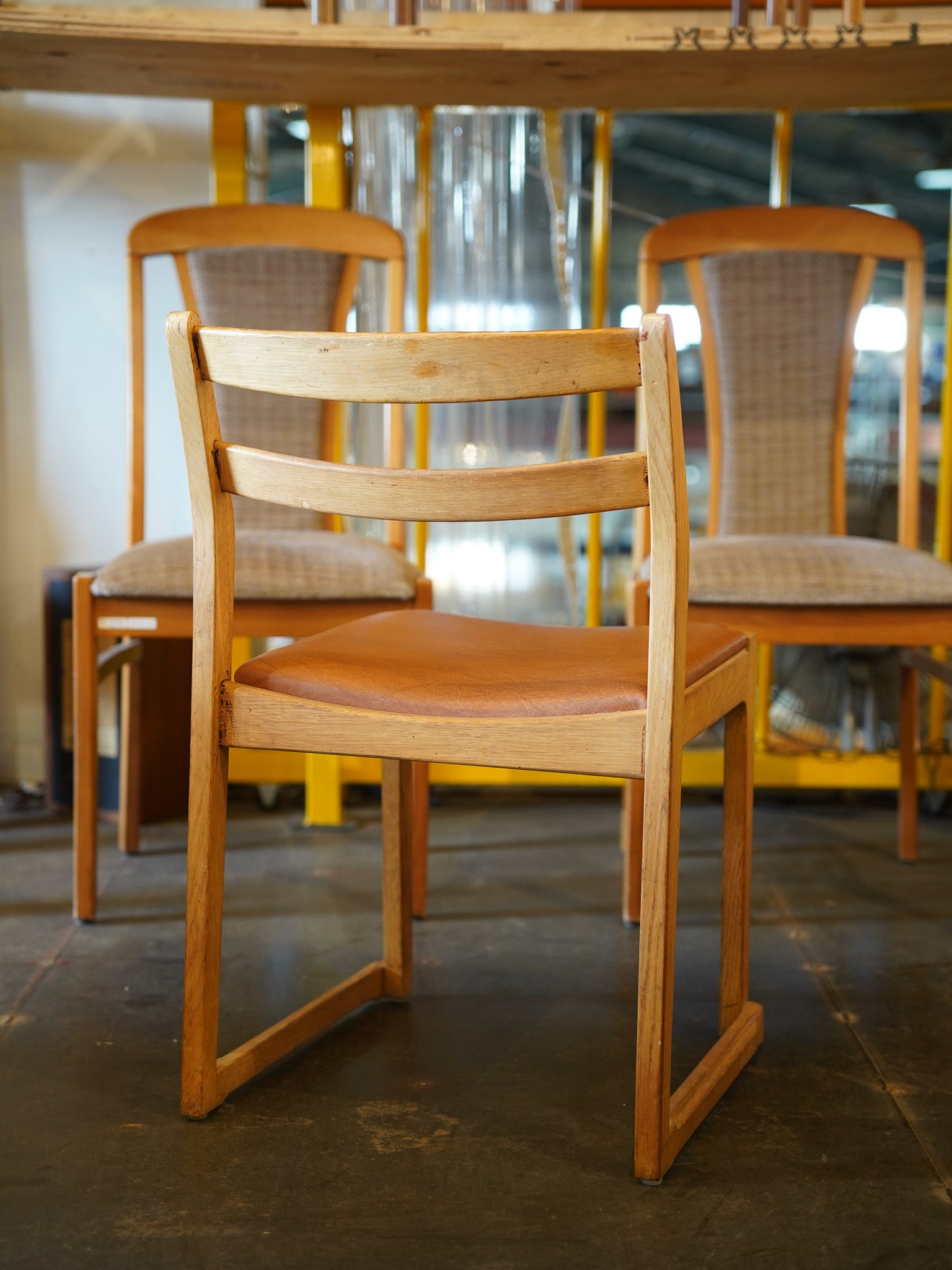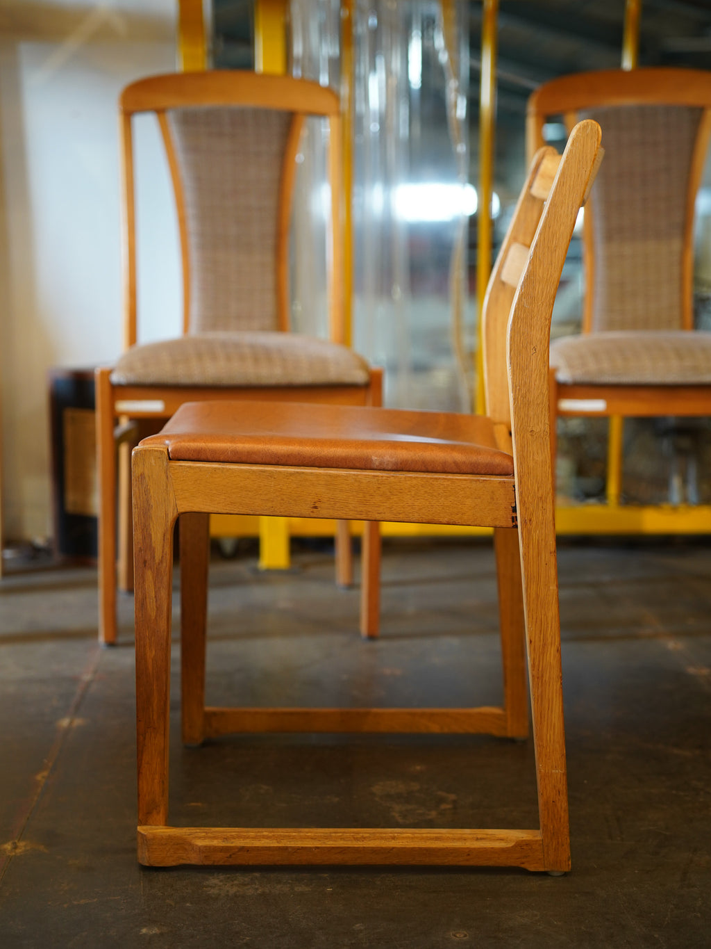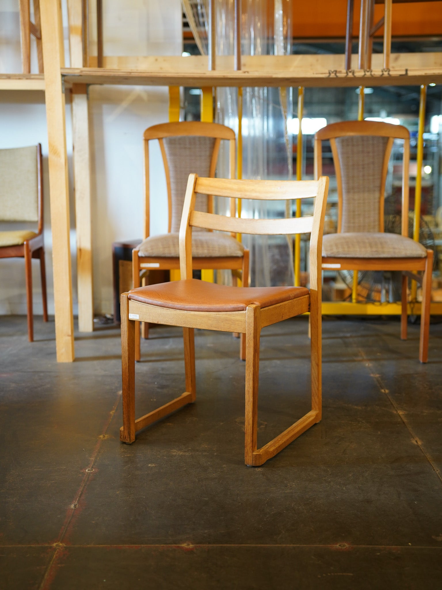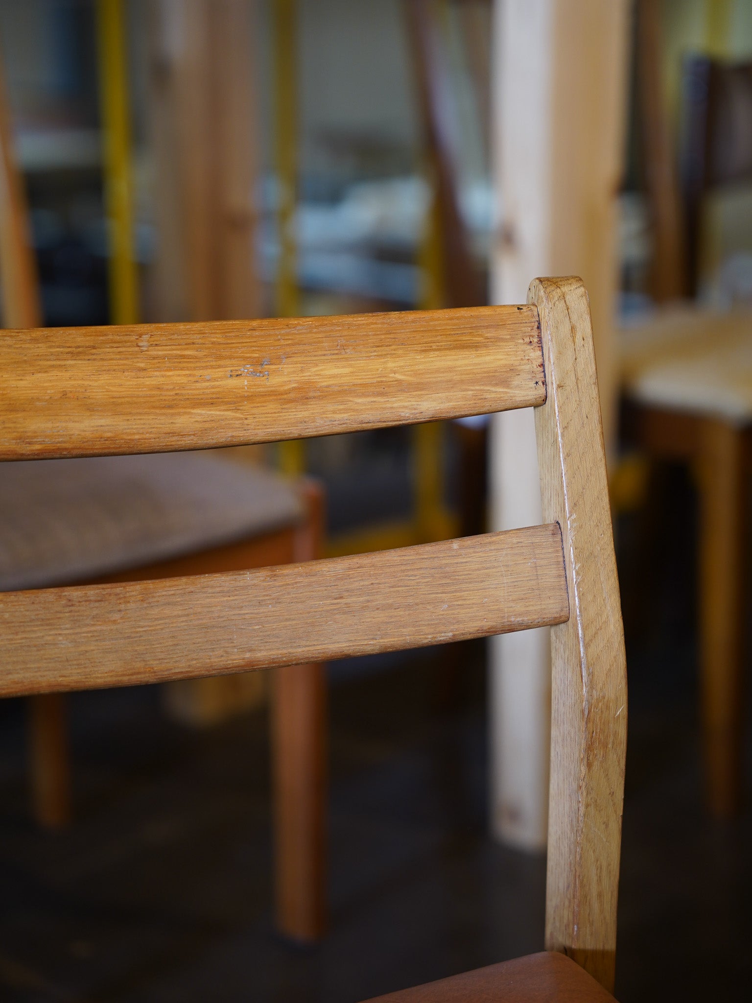 このダイニングチェアは、堅牢なオーク材のフレームが特徴的なヴィンテージ品です。