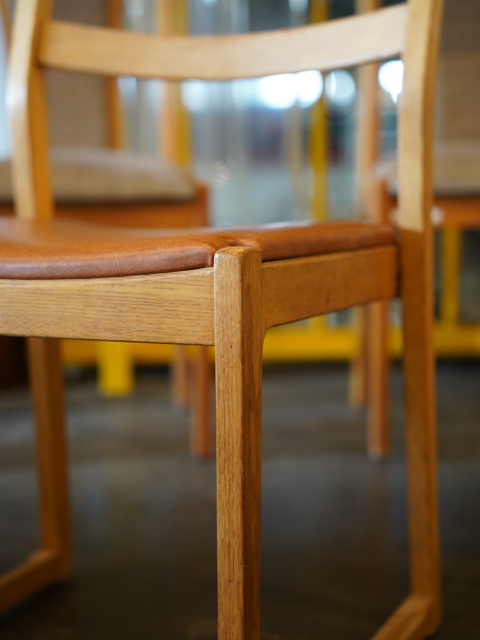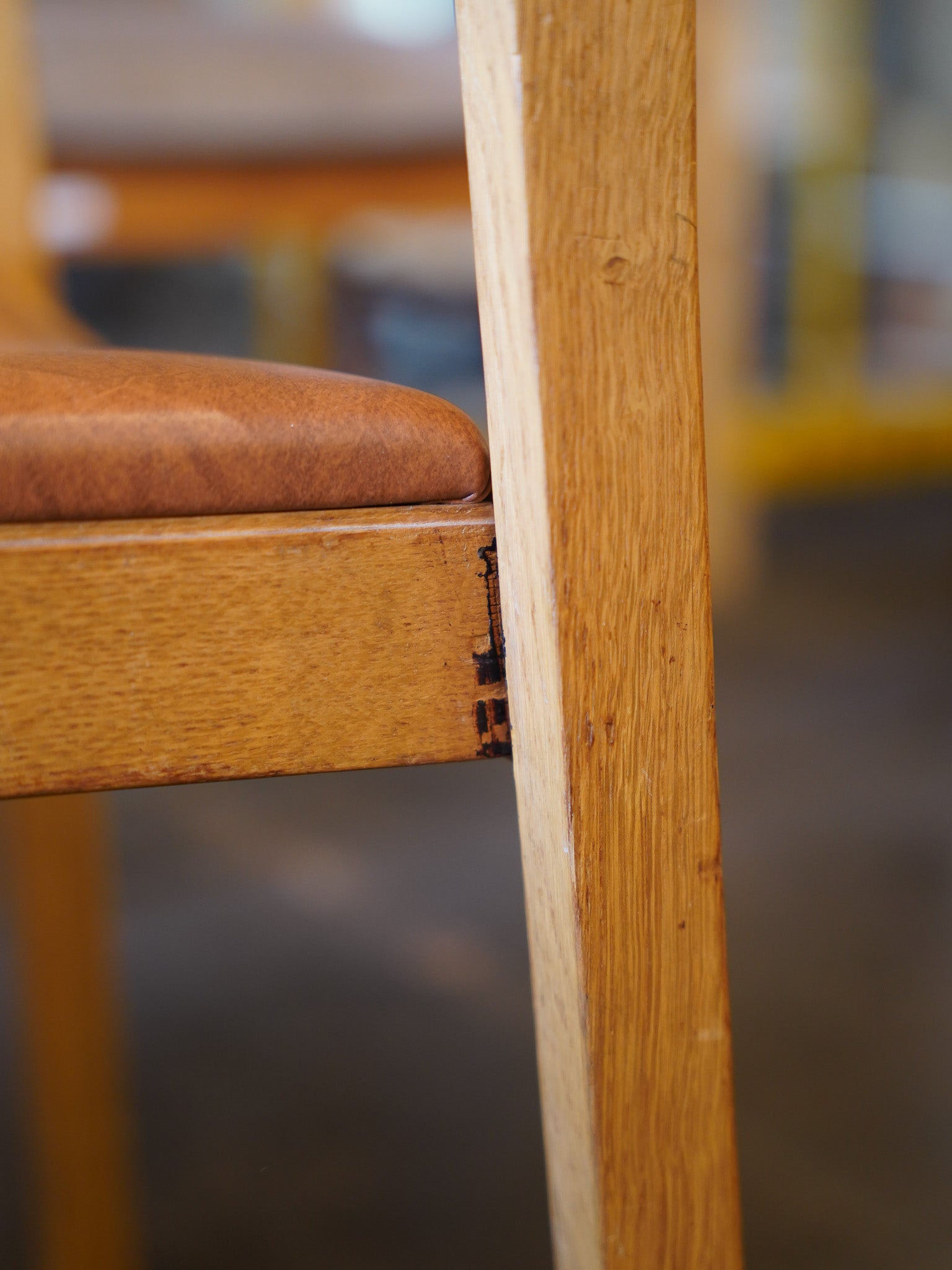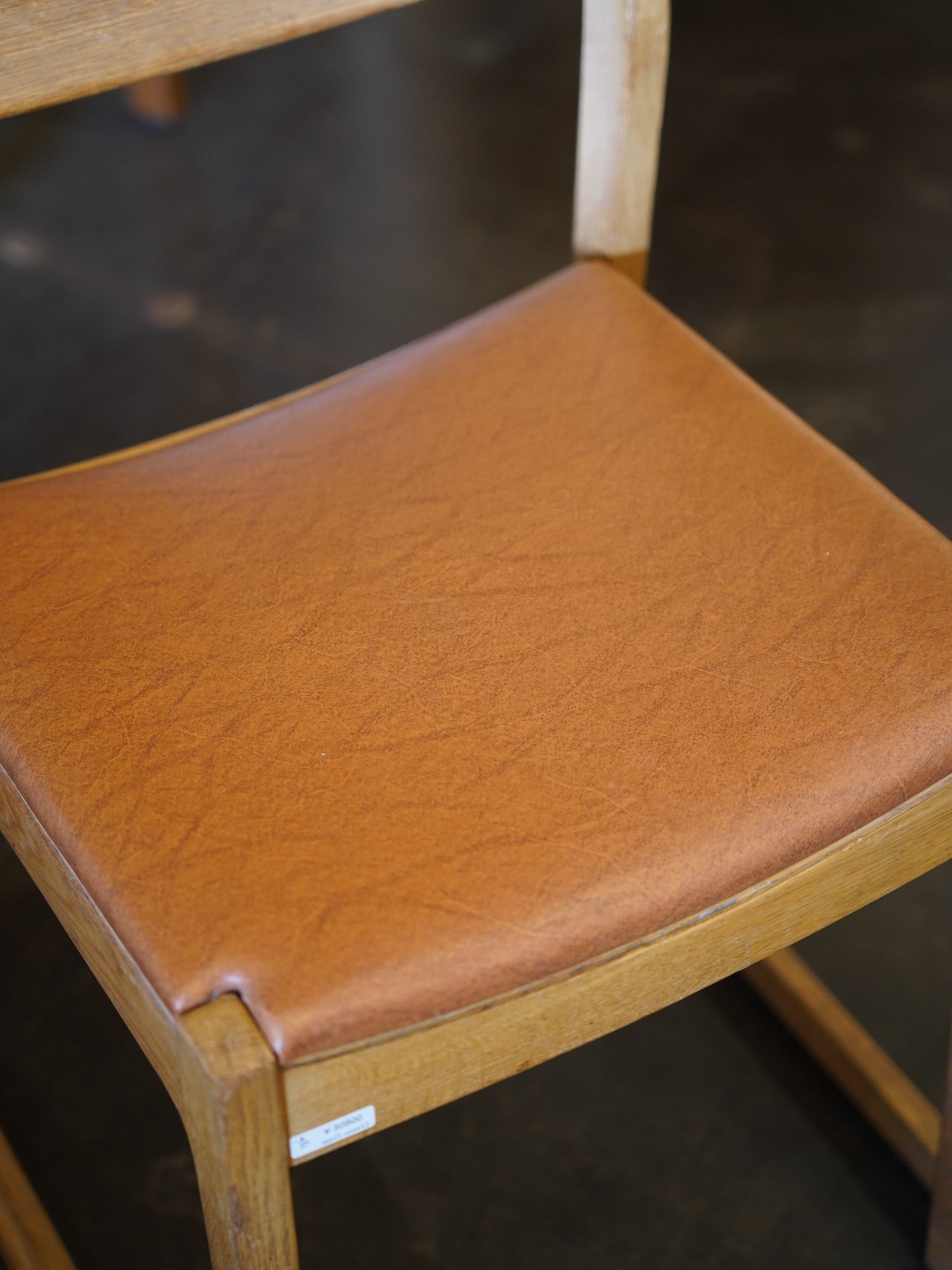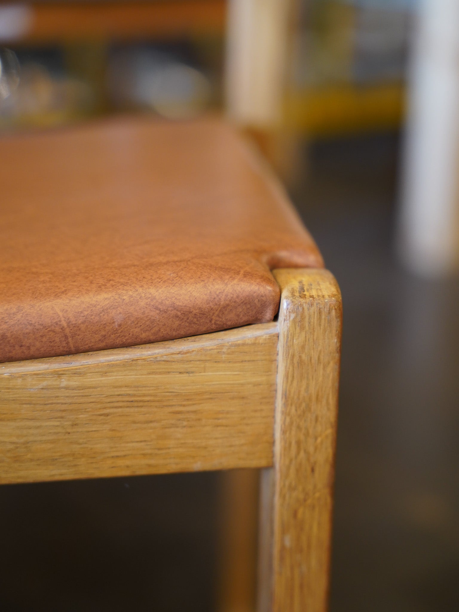 座面はコニャックカラーのレザーで張られ、オーク材の明るい色調とのコントラストがモダンで温かみのある印象を与えます。