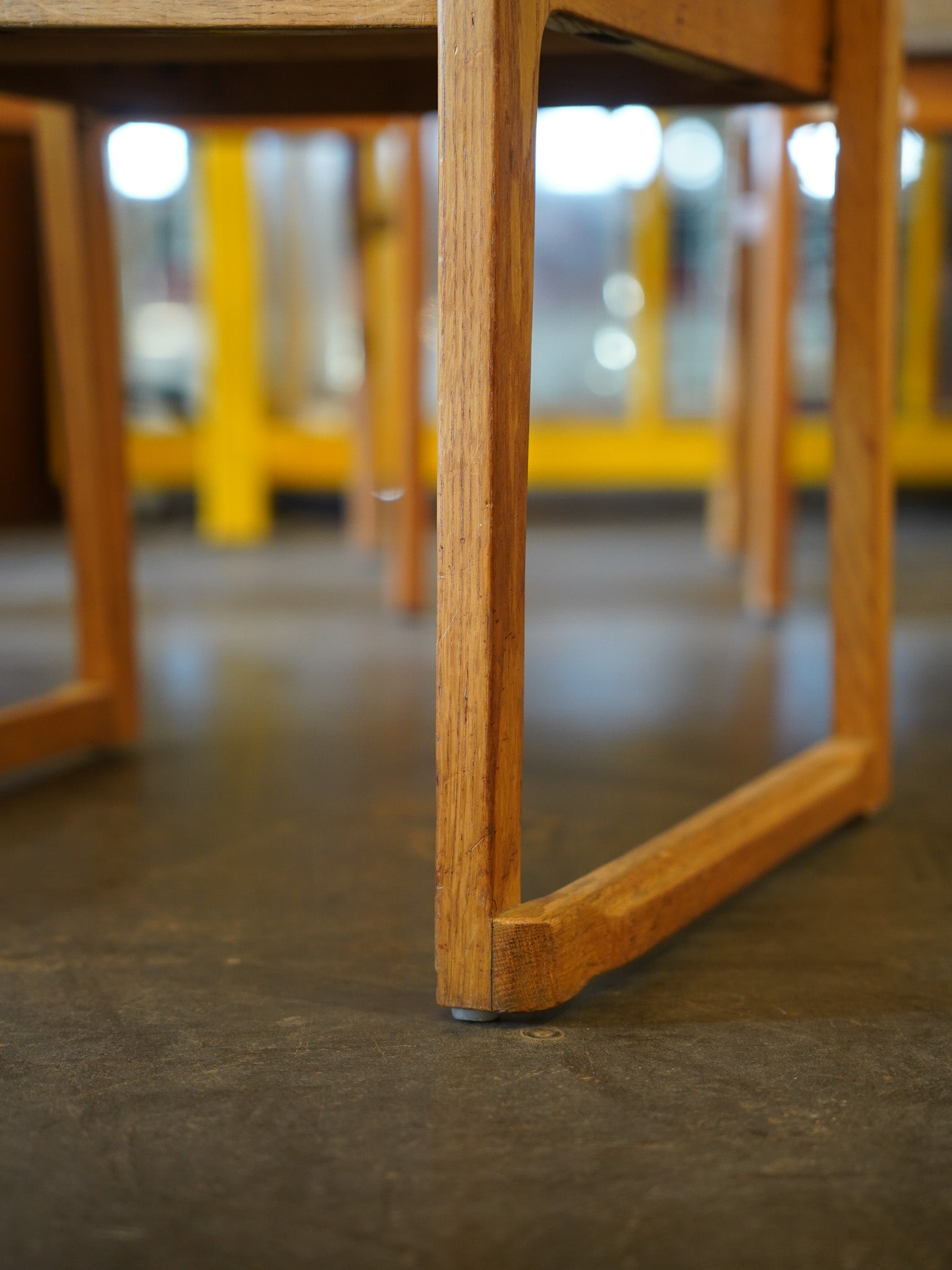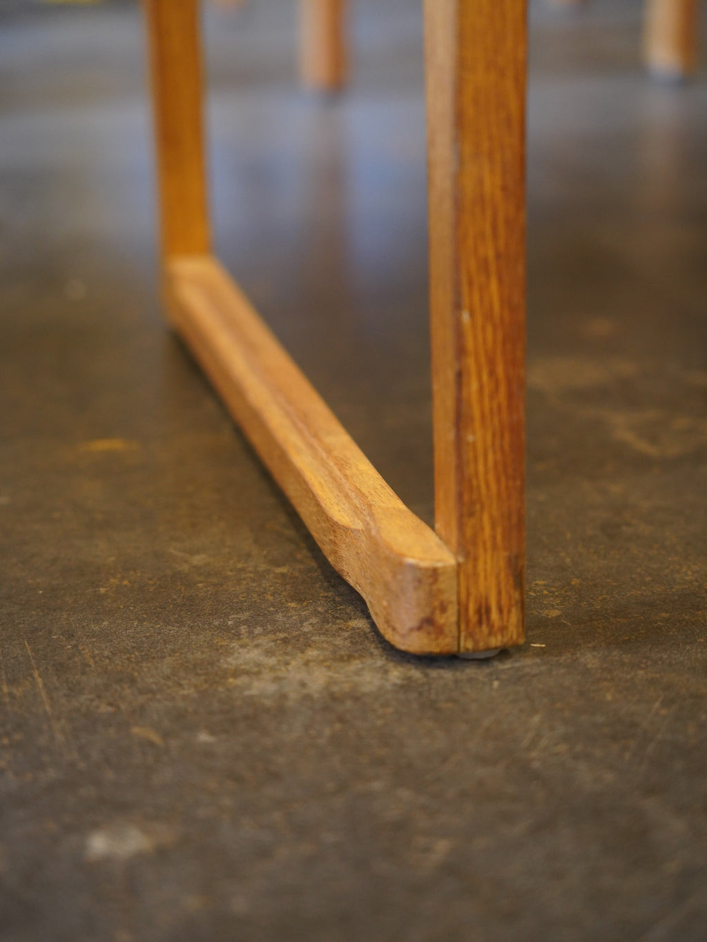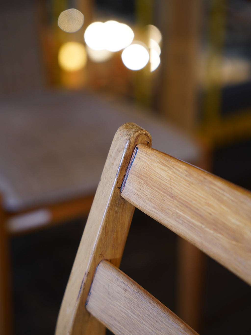背もたれはシンプルな二本のスラットで構成されており、1960年代から1970年代のスカンジナビアデザインらしい、素材を活かしたミニマルな美しさが際立ちます。