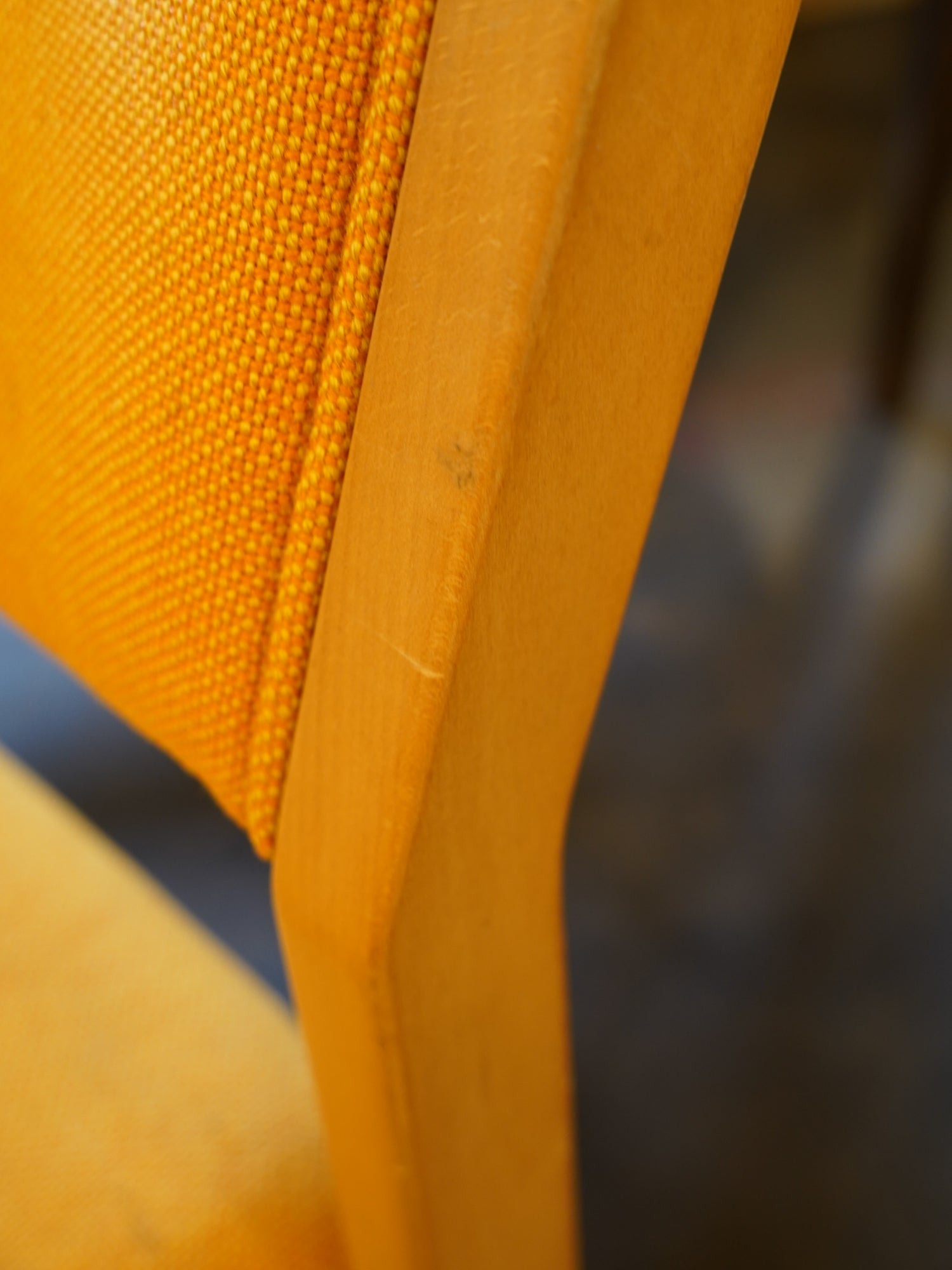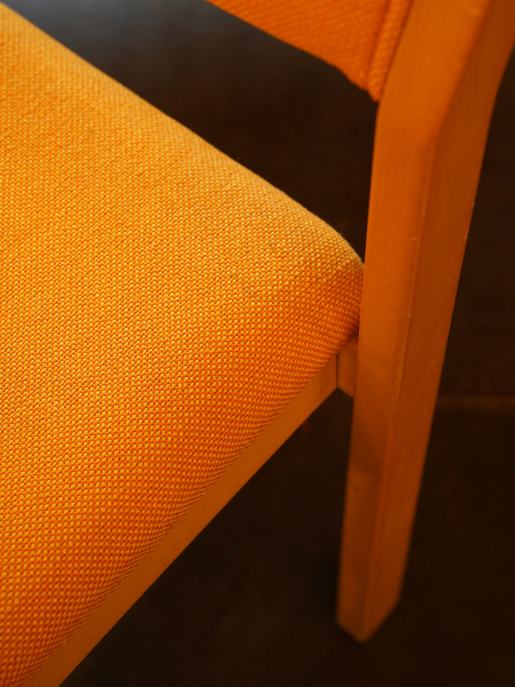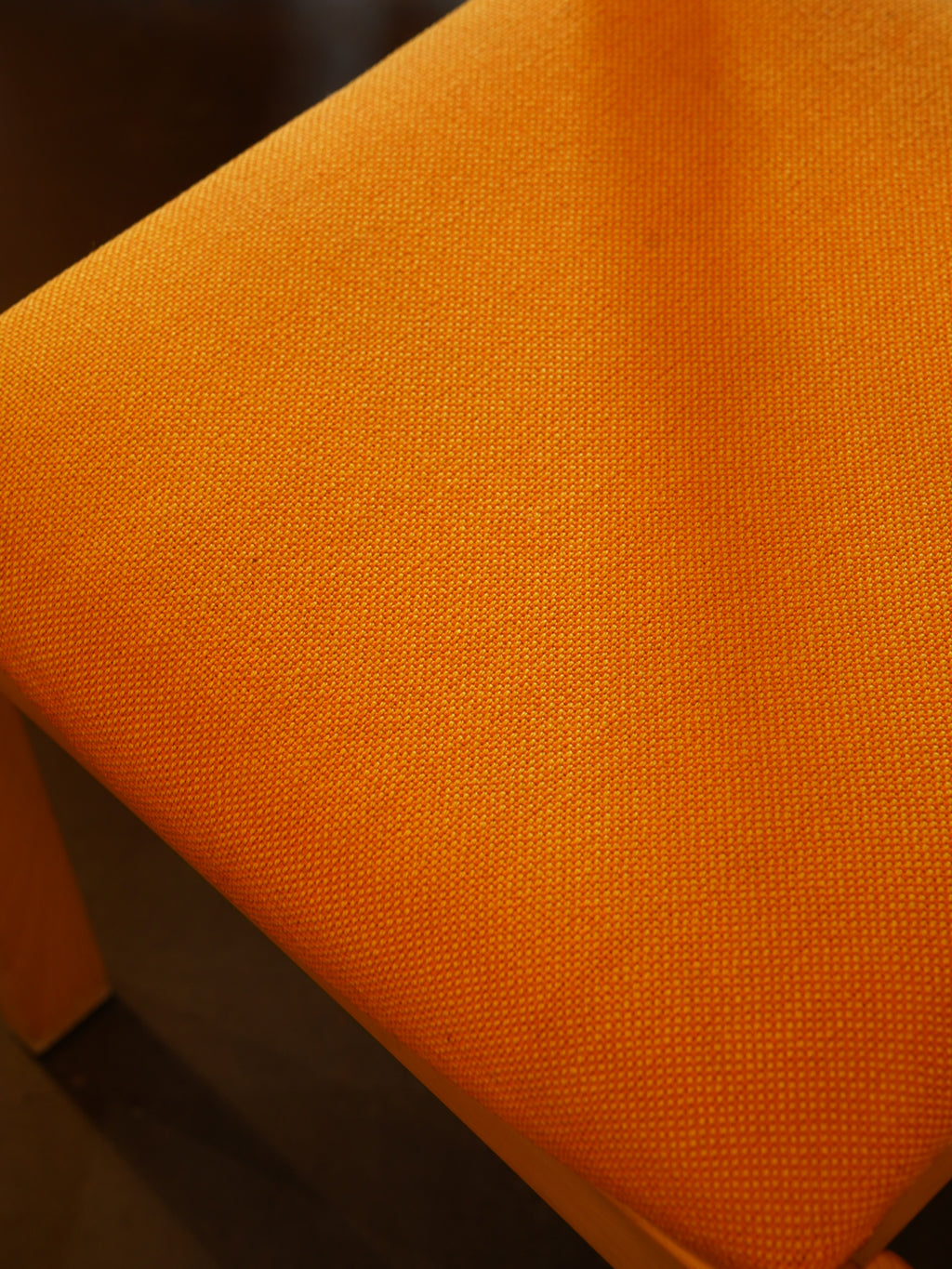 明るい木肌のフレームと、視覚的な暖かさを持つ鮮やかなオレンジ色のファブリックが特徴。
