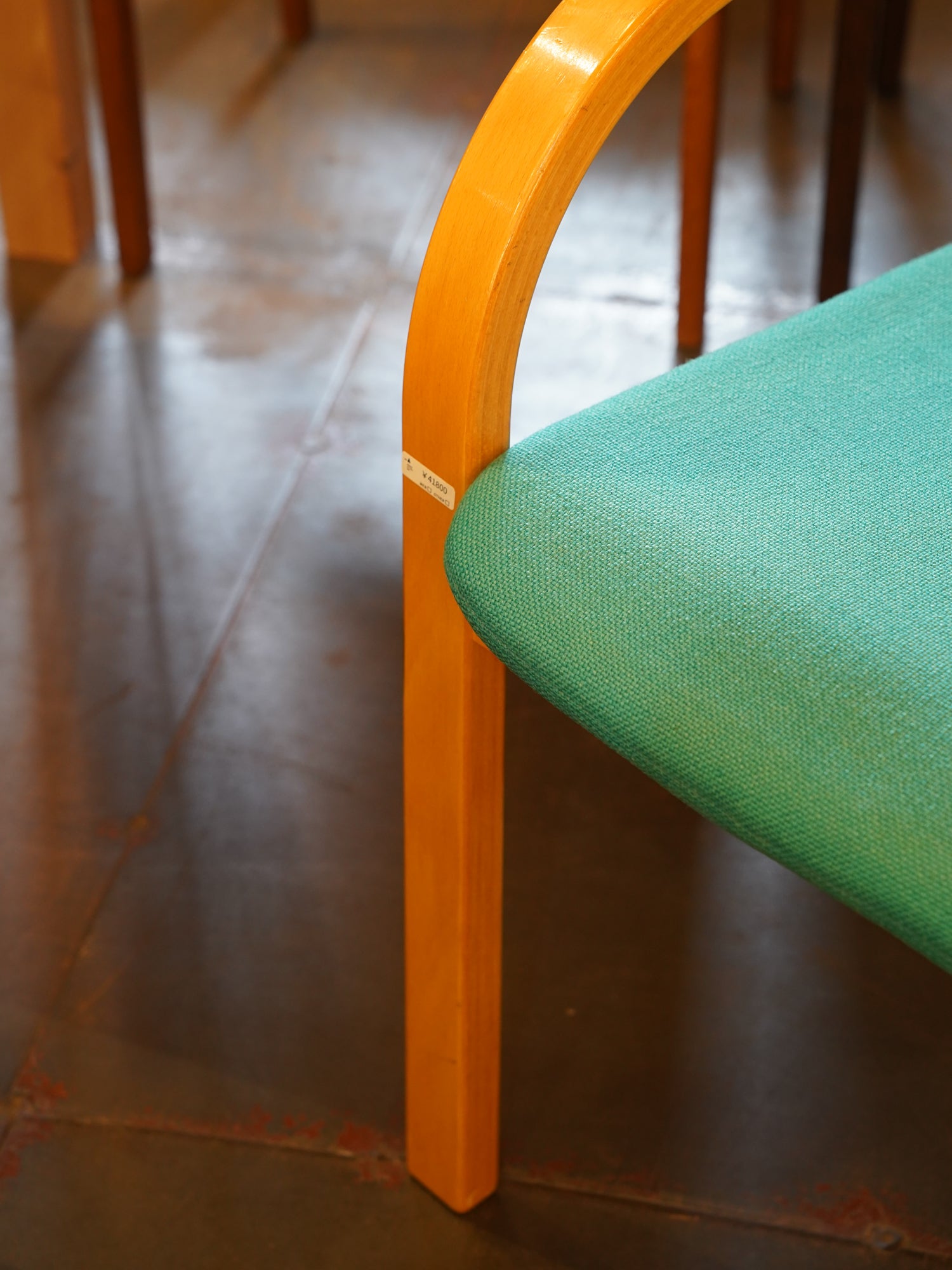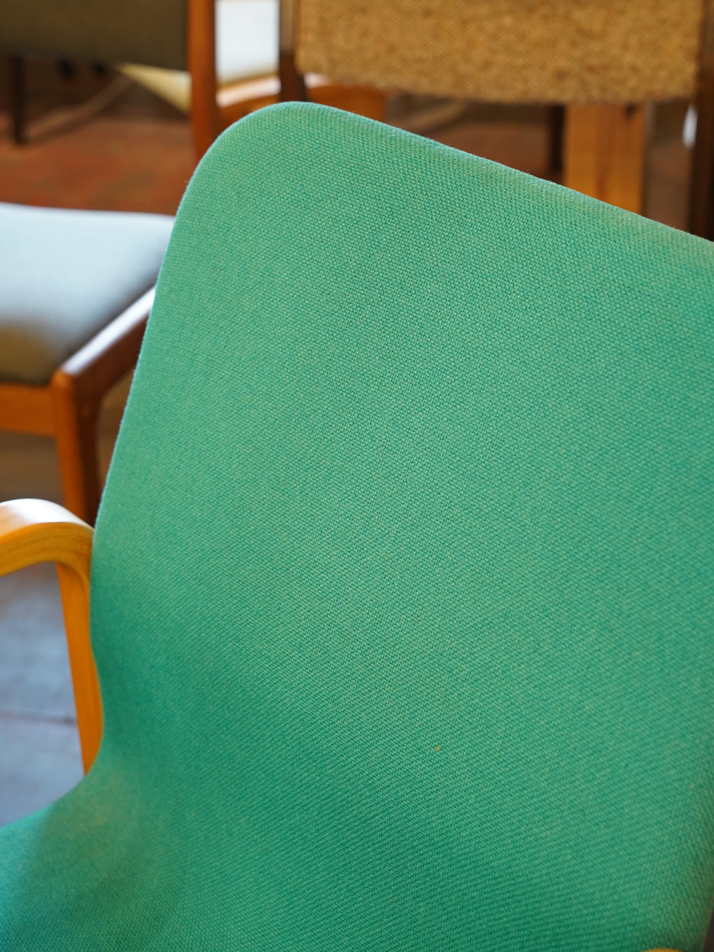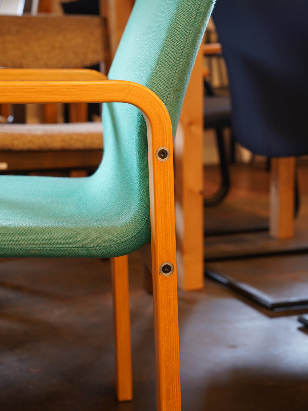 明るい木肌と、ターコイズグリーンのファブリックが特徴で、フレームからアームにかけて描かれる美しい曲線が、座る人を優しく包み込みます。