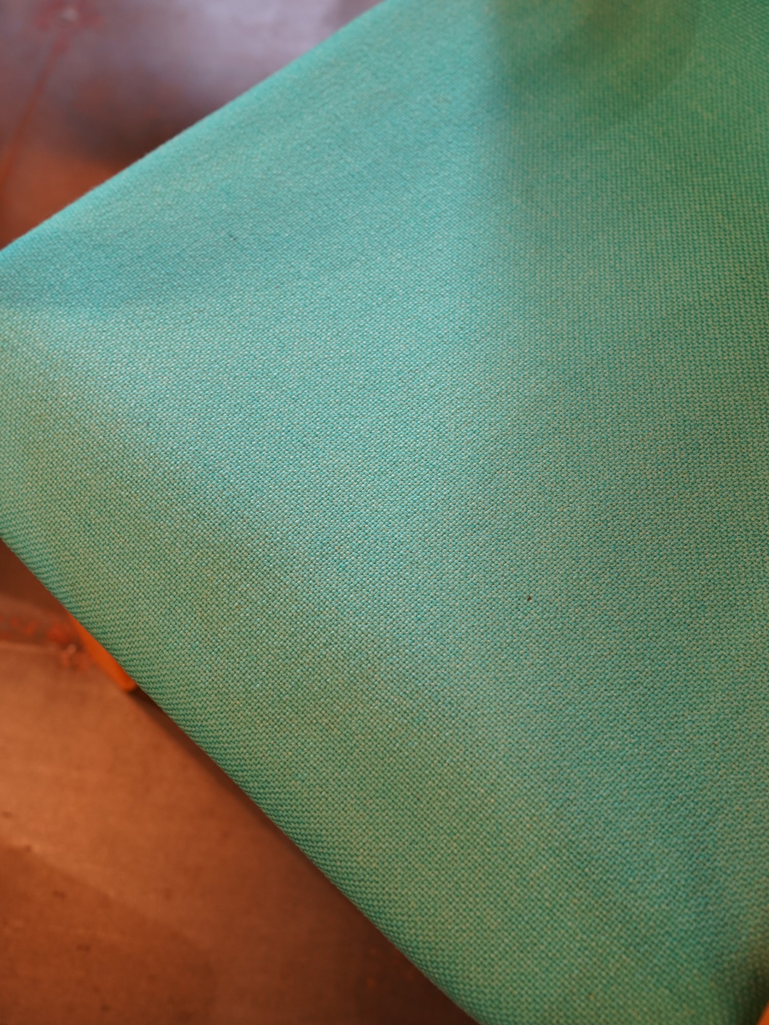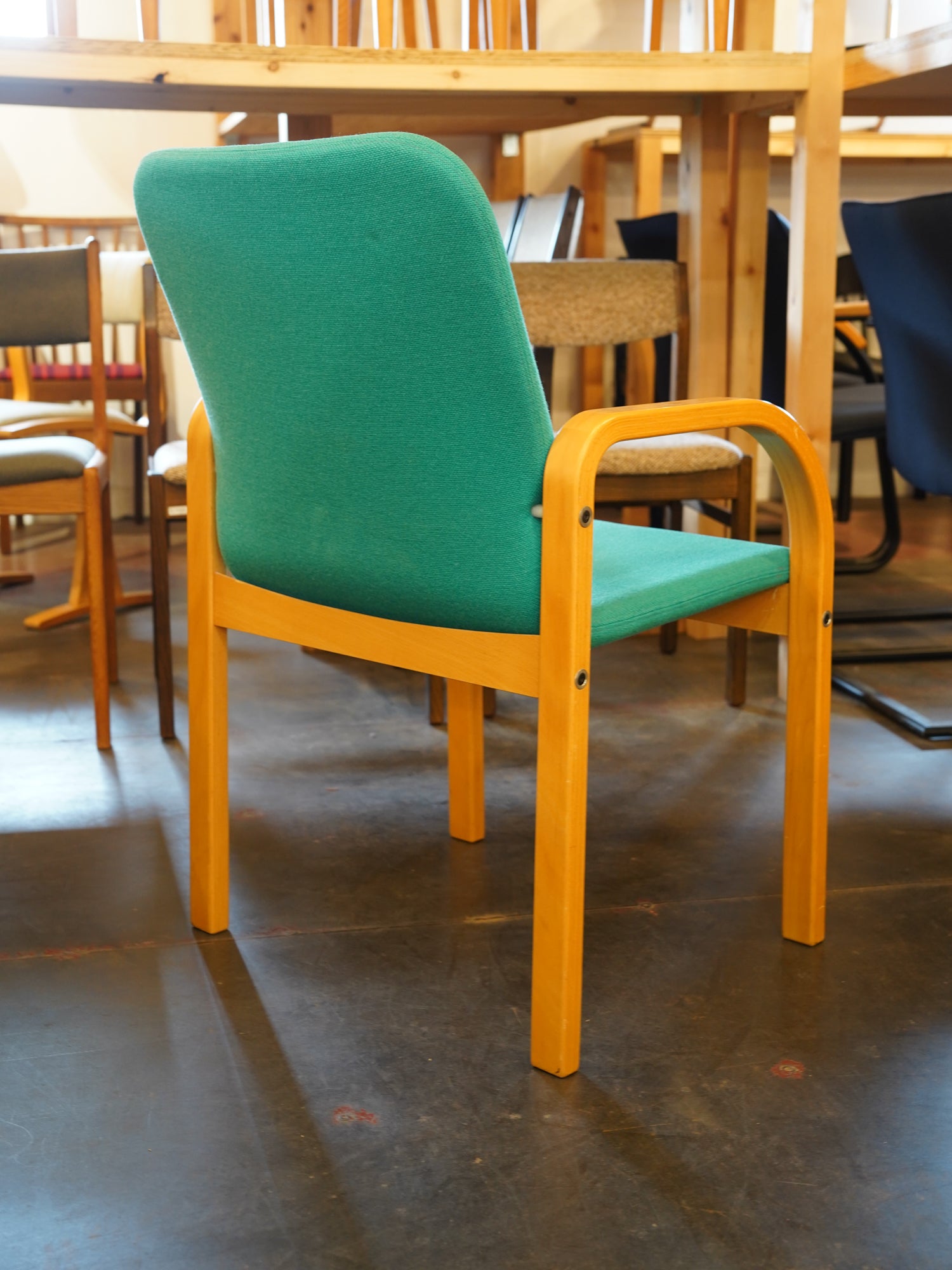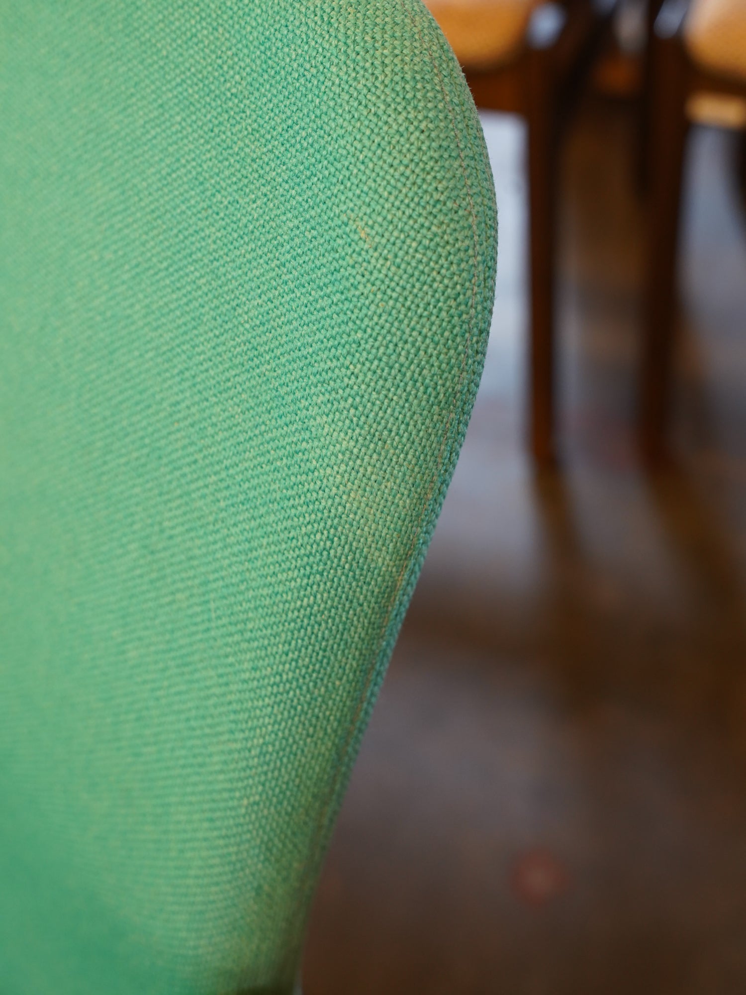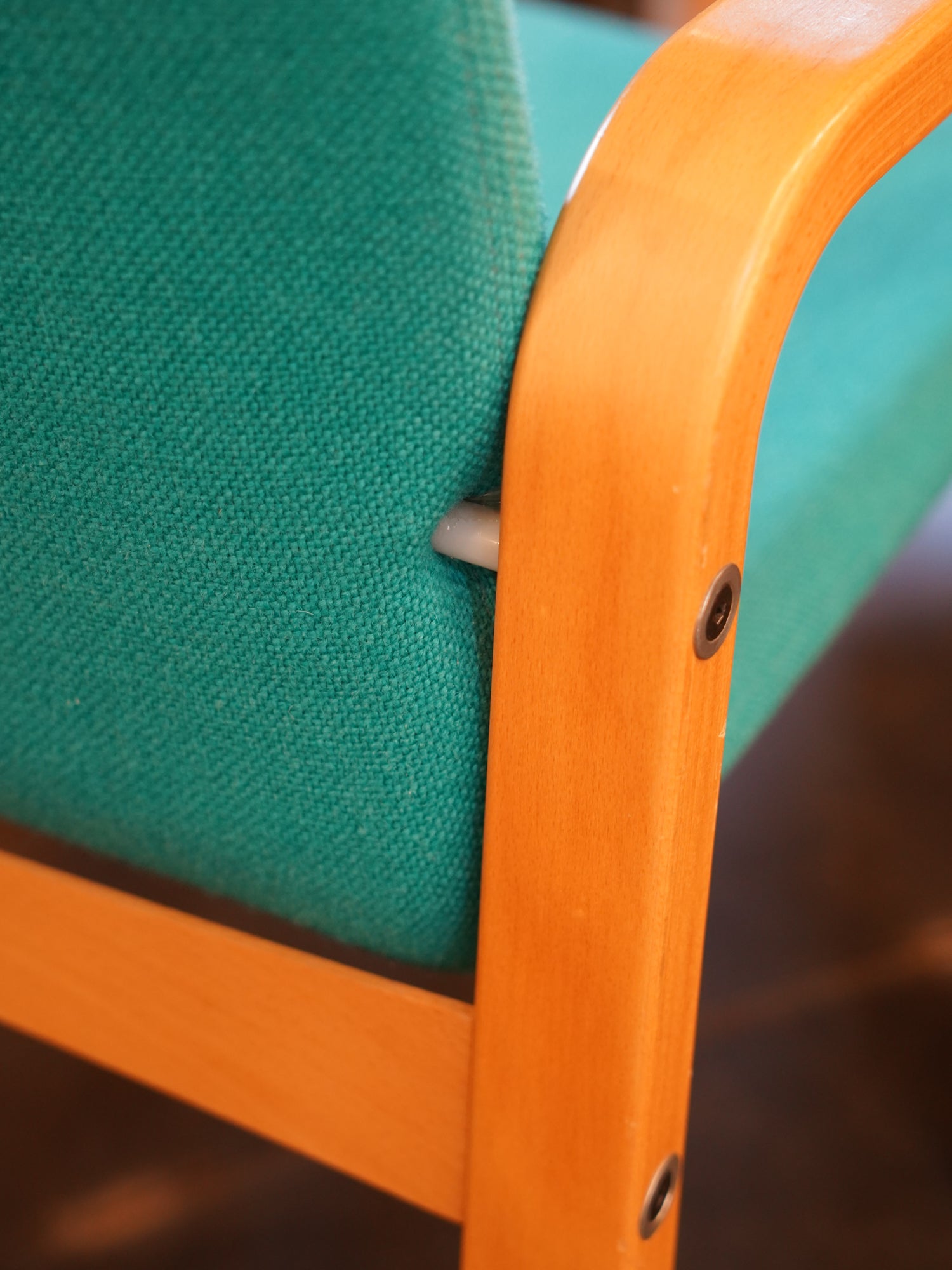 明るい木肌と、ターコイズグリーンのファブリックが特徴で、フレームからアームにかけて描かれる美しい曲線が、座る人を優しく包み込みます。