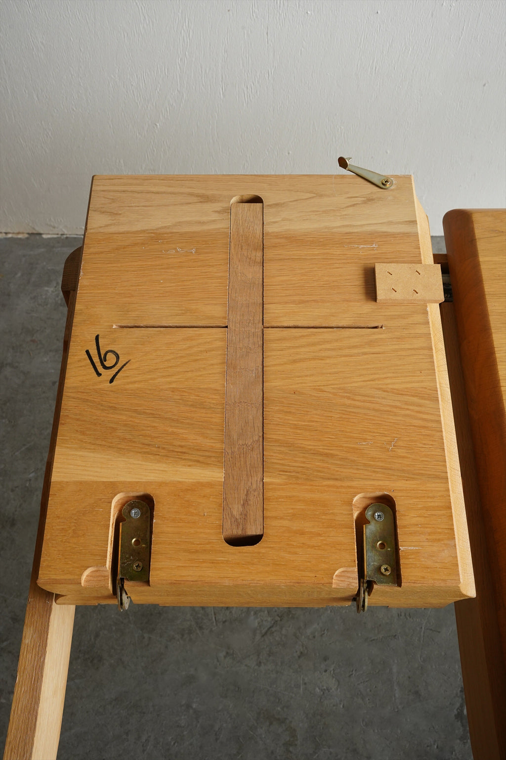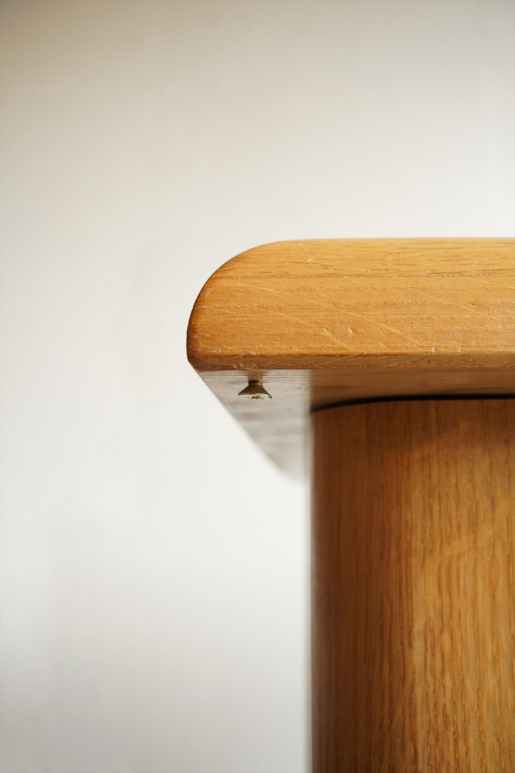 片側の太い脚と、もう一方のT字型の脚が、シンプルな中にユニークなアクセントを生み出しています。また、安定感のある構造で、食事や作業など様々なシーンで活躍します。