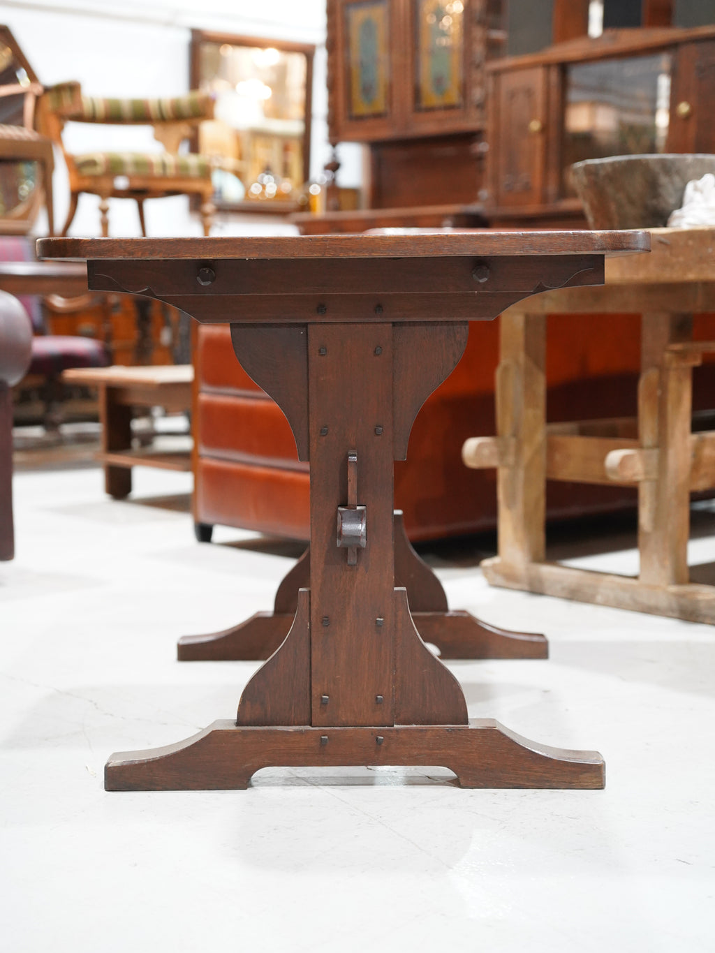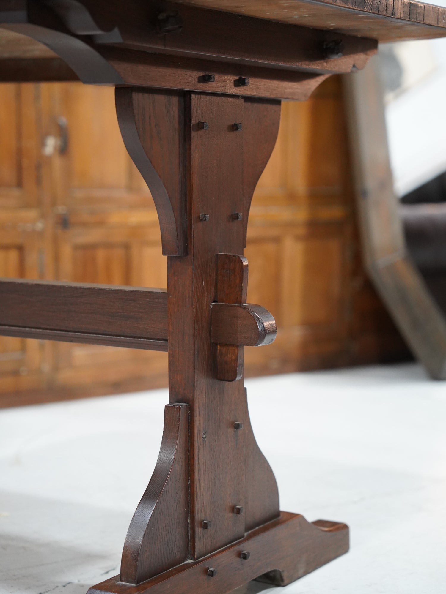 脚部は貫(ぬき)でがっちりと固定されており、安定感は抜群。古風な木釘のようなディテールも、デザインに深みを与えています。
