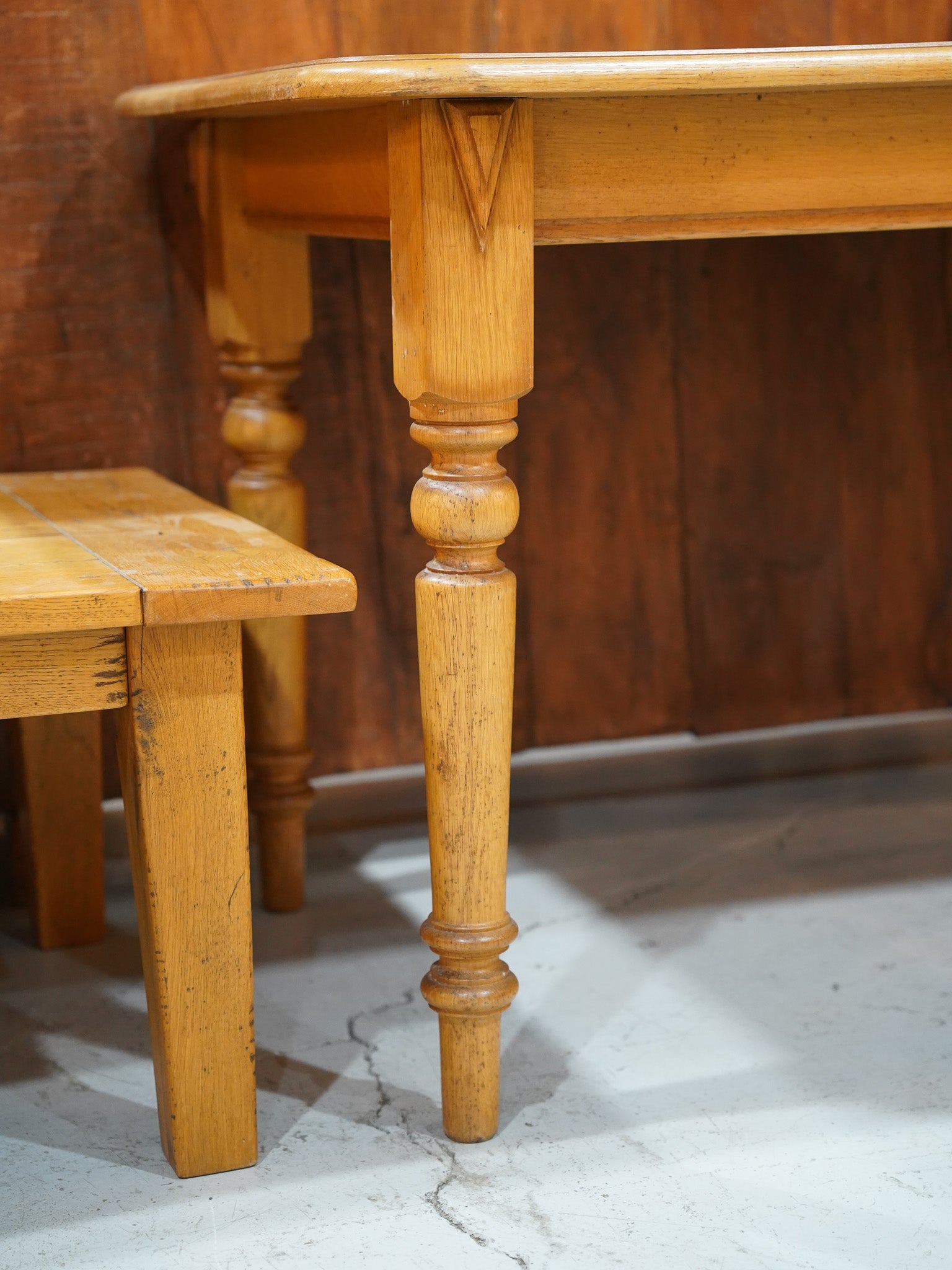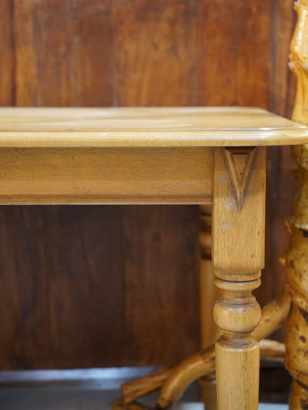 天板と脚を繋ぐ幕板部分には、アクセントとなるV字の彫刻が施されています。細部にまで施された伝統的な装飾が、このテーブルの品質と個性を高めています。