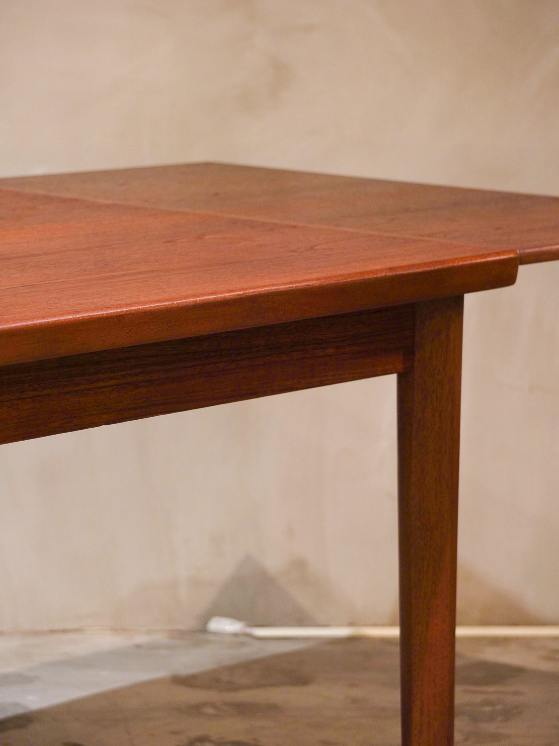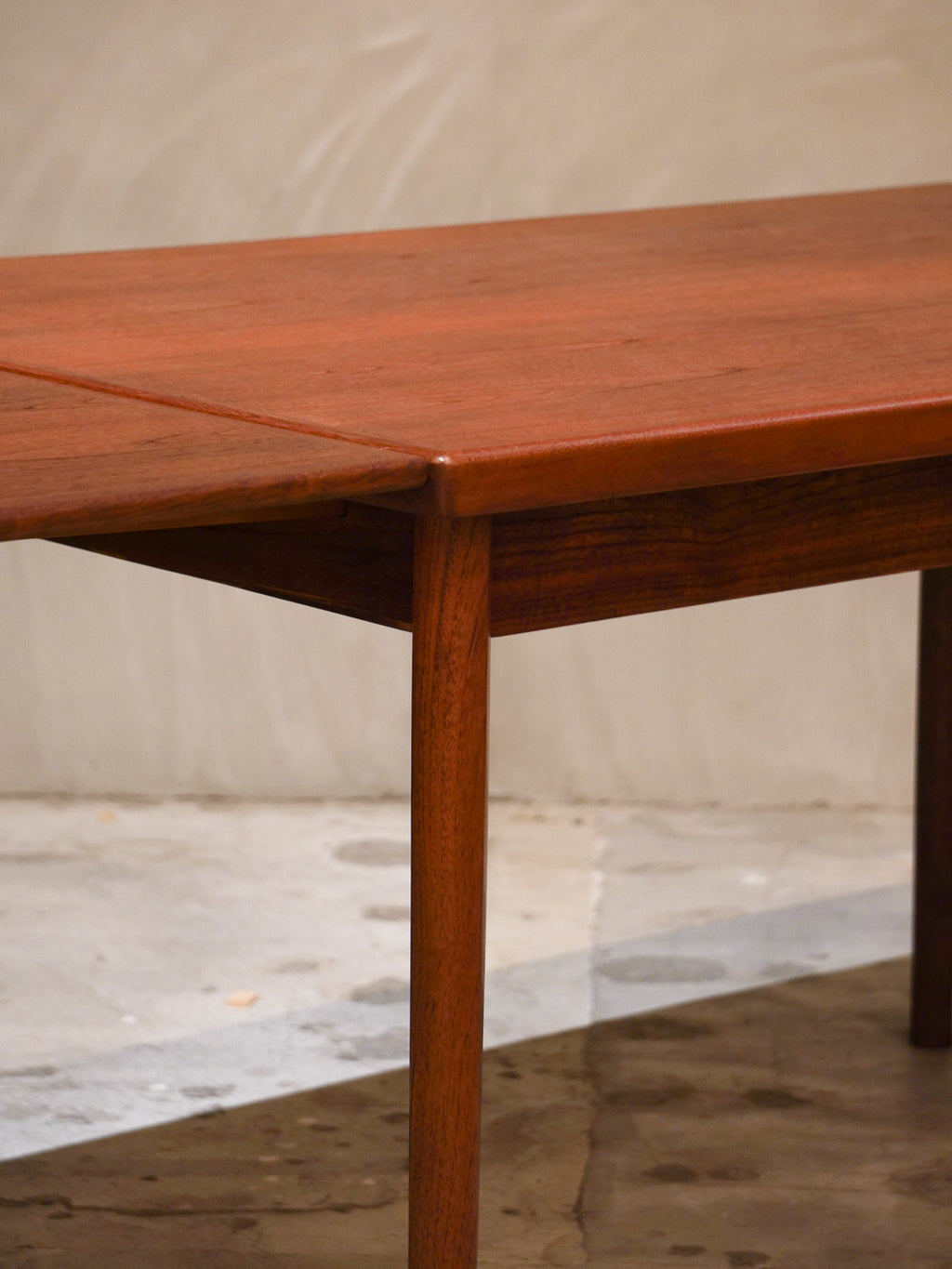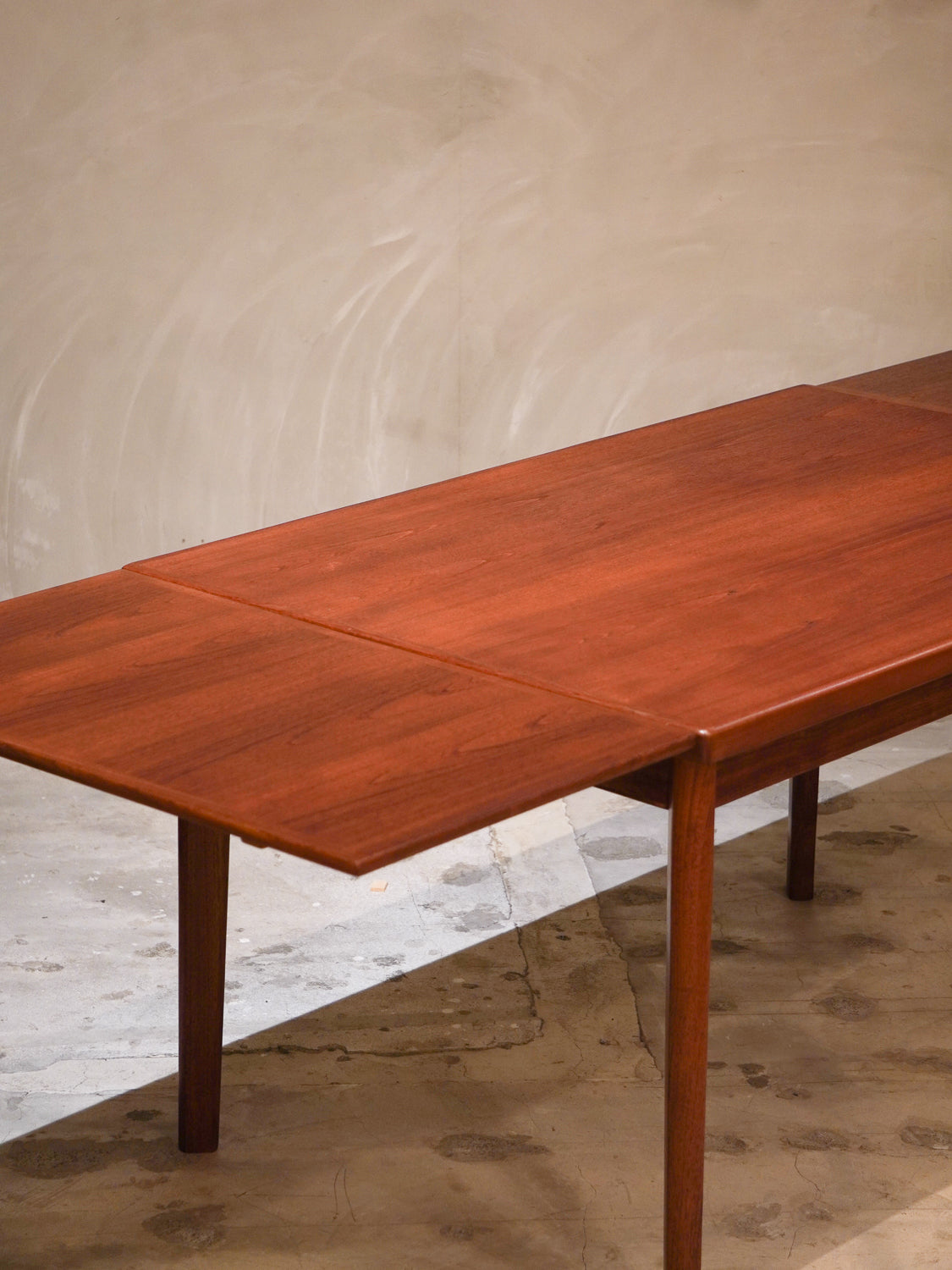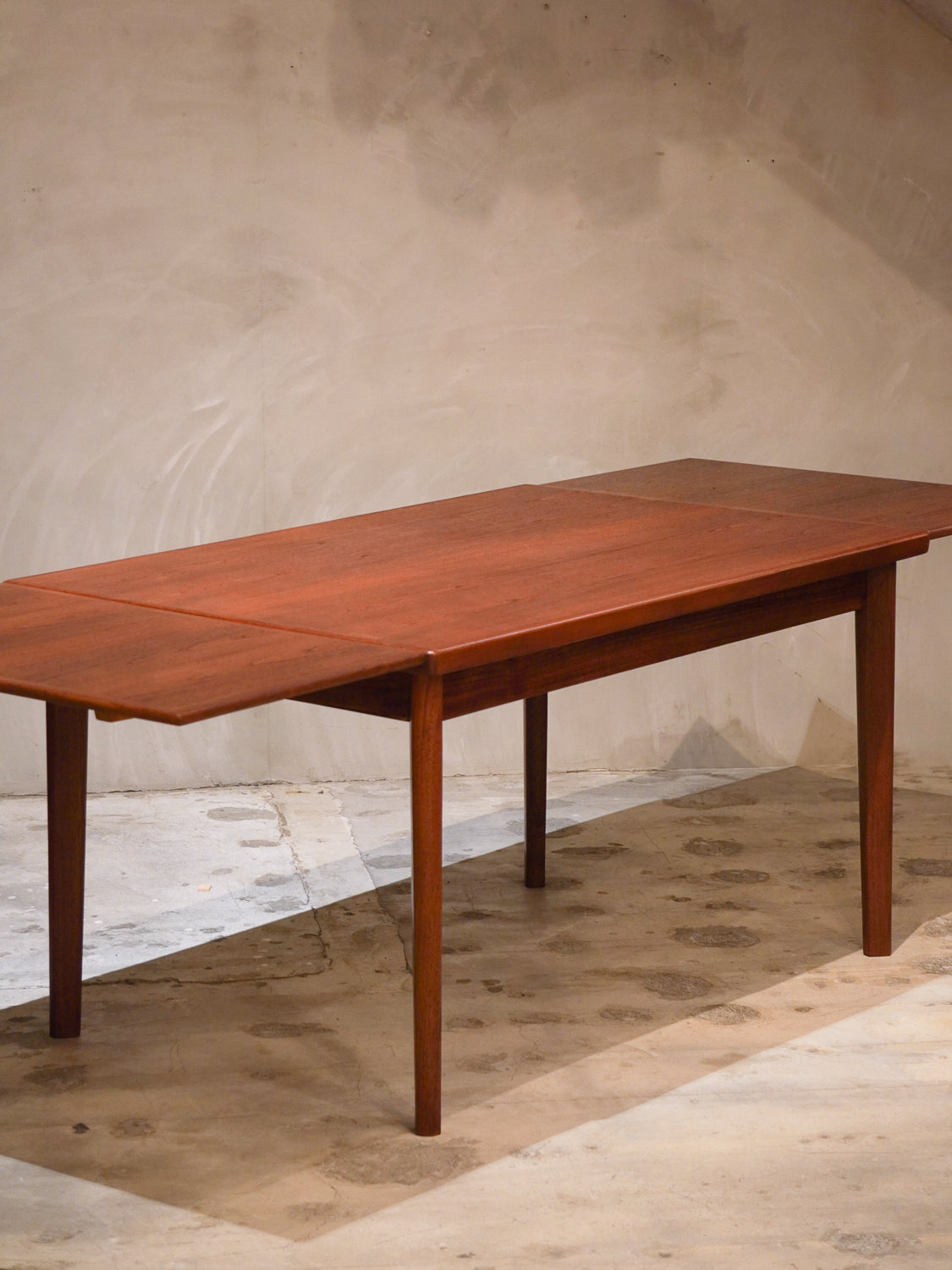 普段は4人掛けとしてコンパクトに使用し、必要に応じて天板を伸長させることで6人、あるいはそれ以上の人数にも対応できます。デザイン面では、床に向かって細くなるテーパードレッグを採用しており、重厚な木製テーブルでありながら、軽快で洗練された印象を与えます。