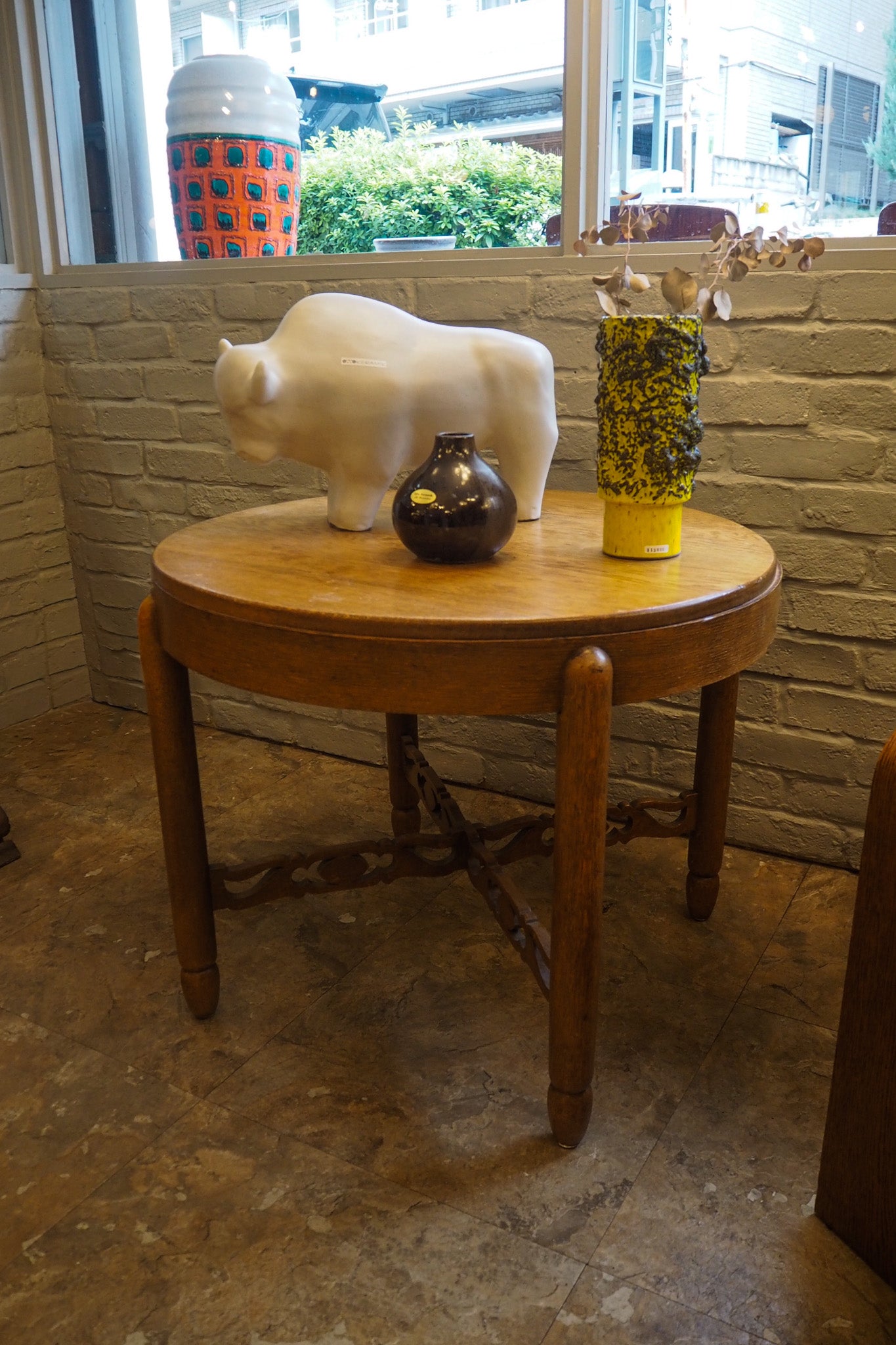 木の温もりを感じる、装飾が美しいラウンドテーブル