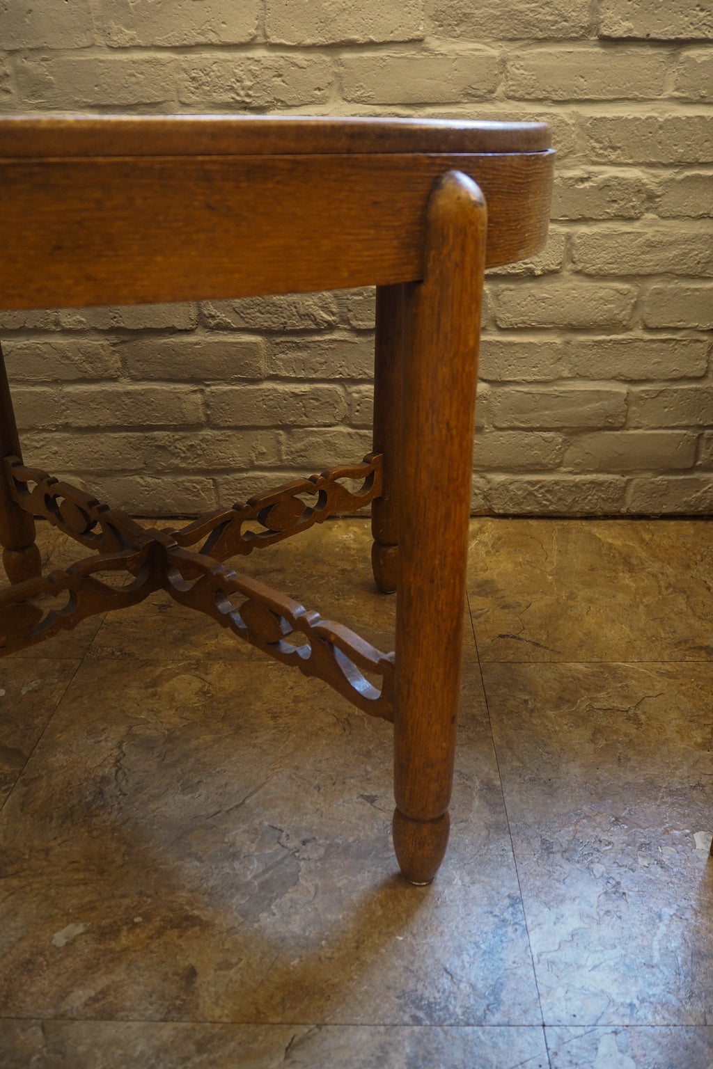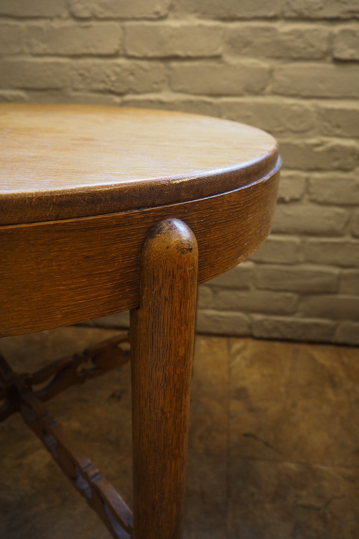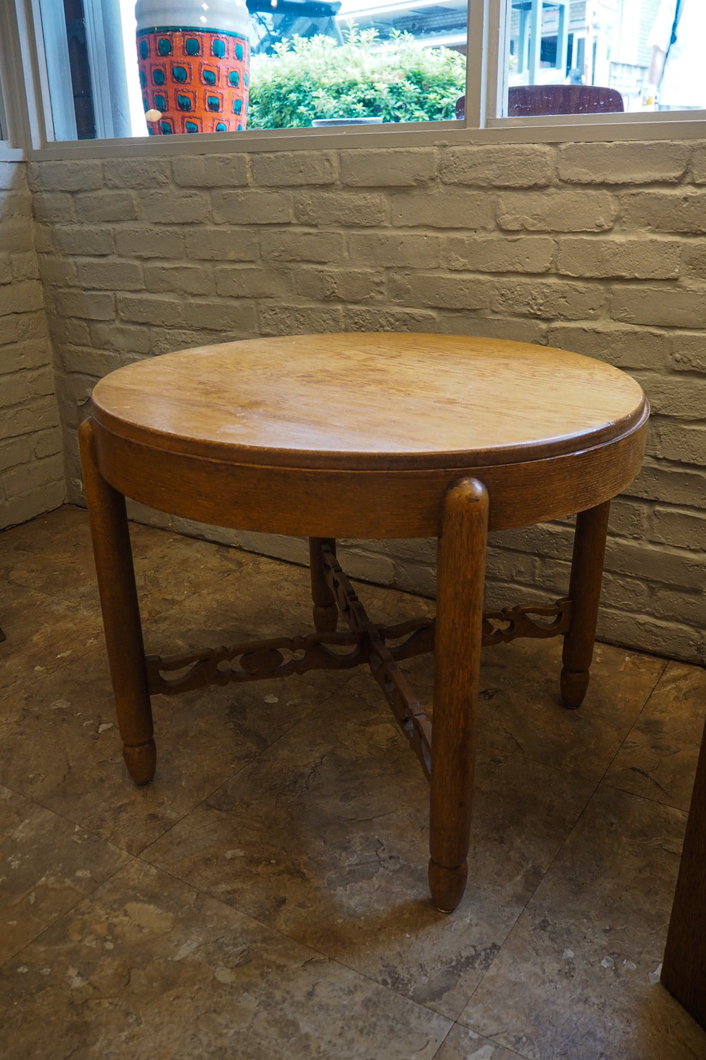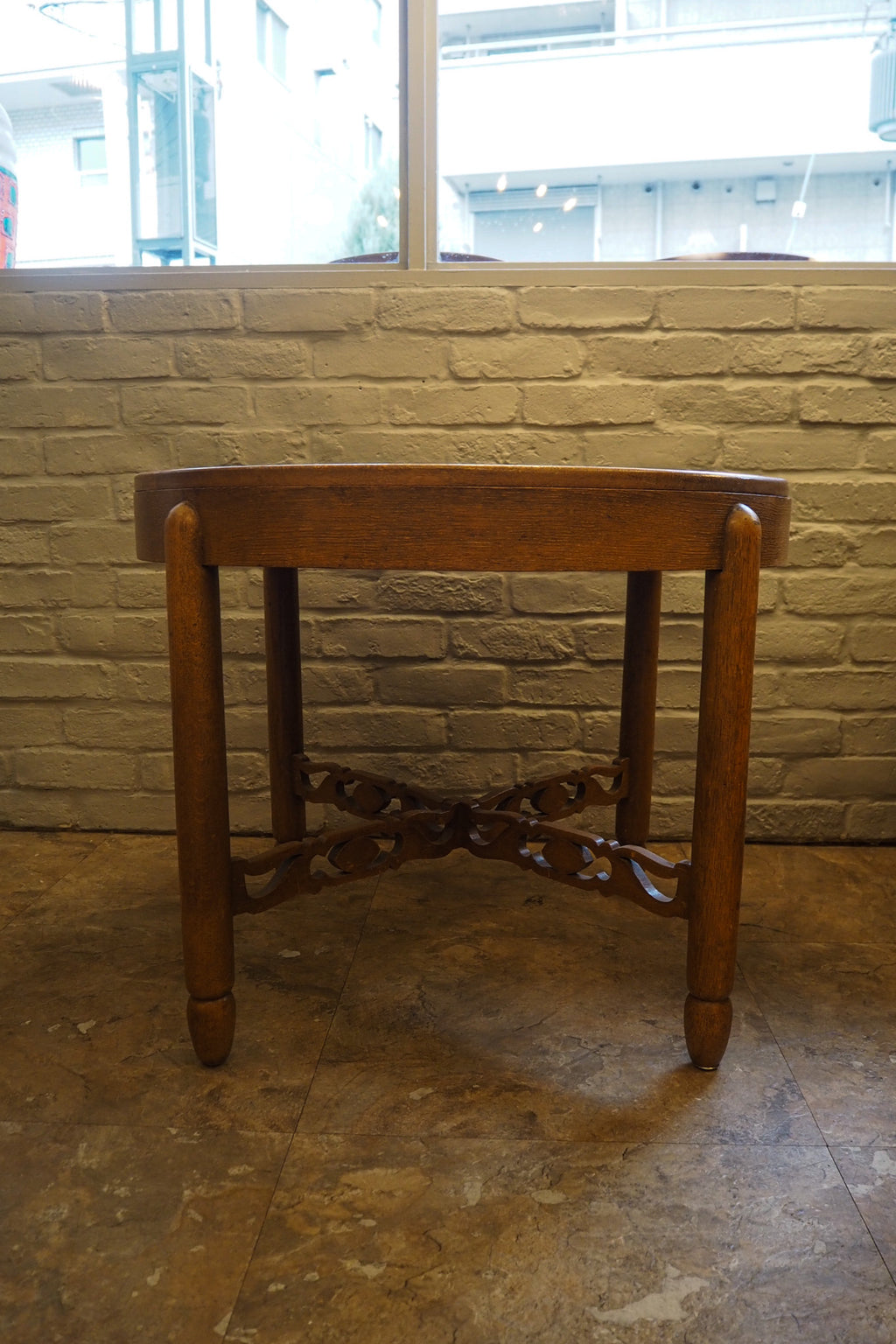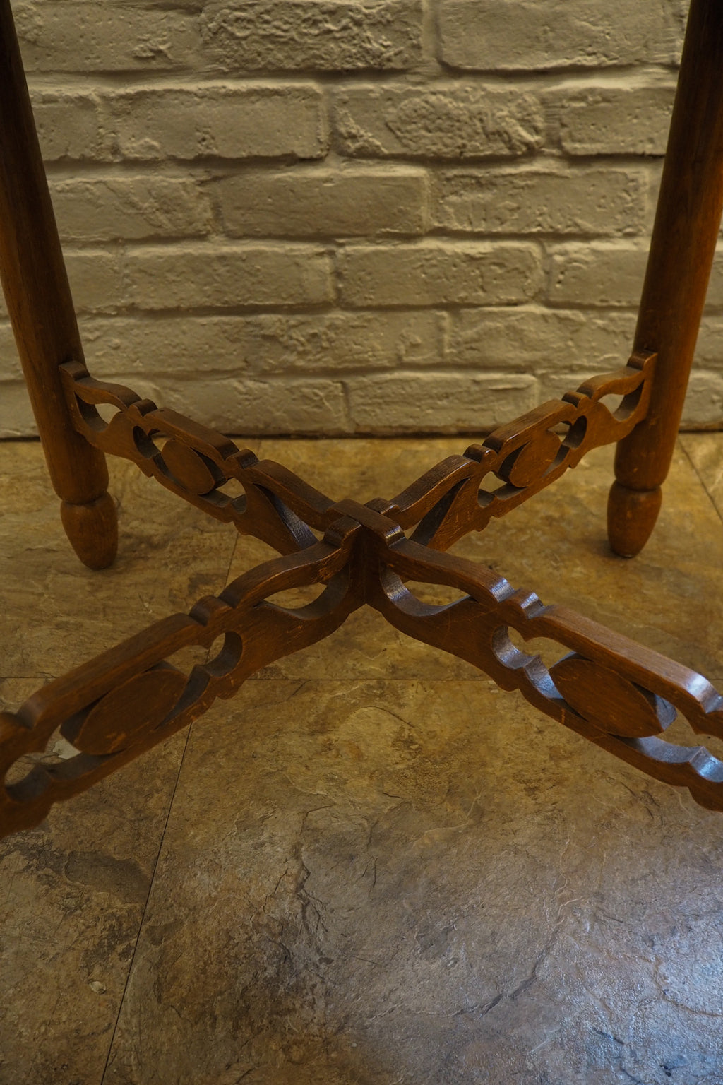 4本の丸みを帯びた脚の間には、繊細な透かし彫りが施された美しいクロスバーが組まれています。この細工が、シンプルな形状にアンティークやクラシカルな雰囲気を加えています。