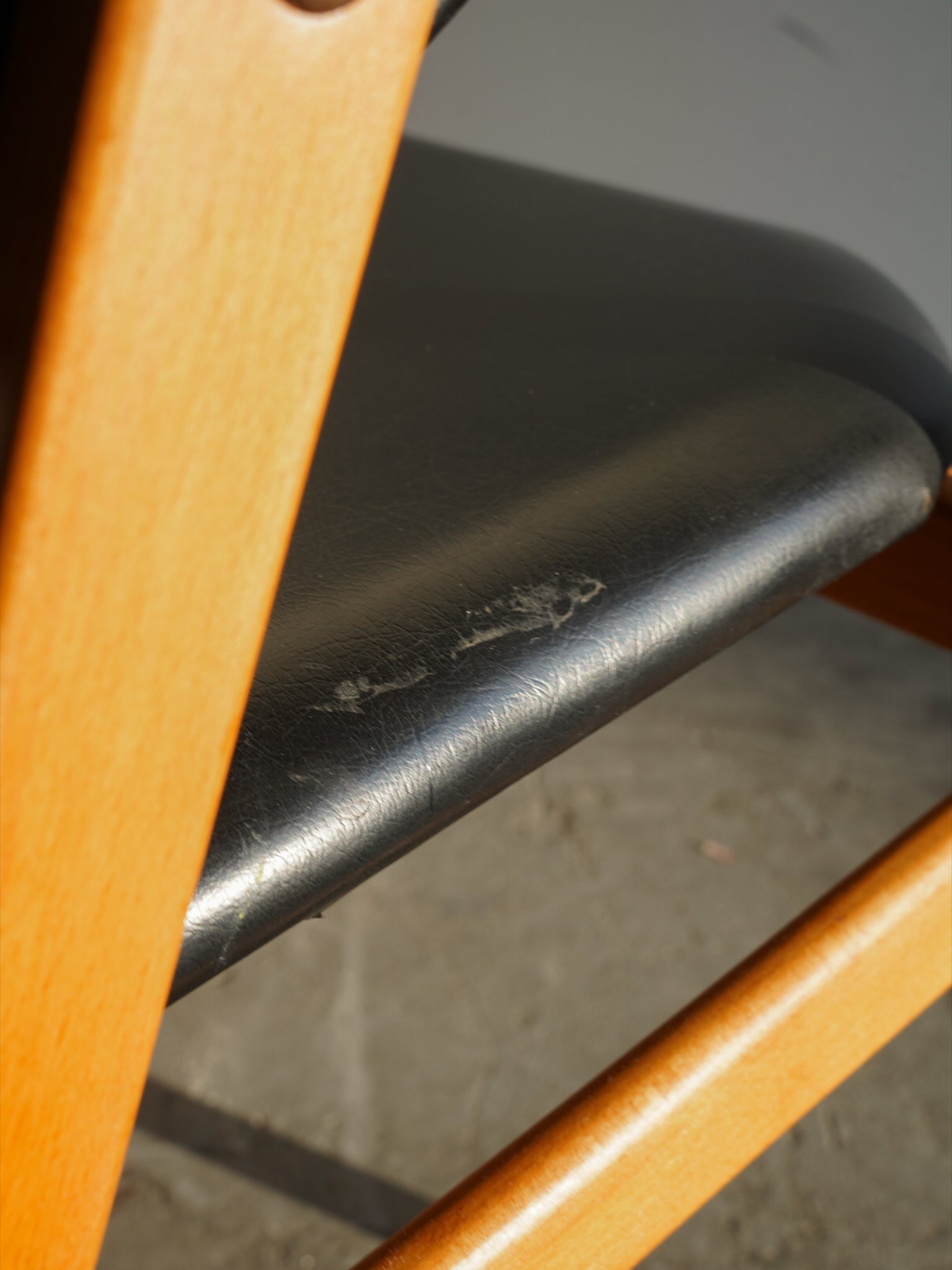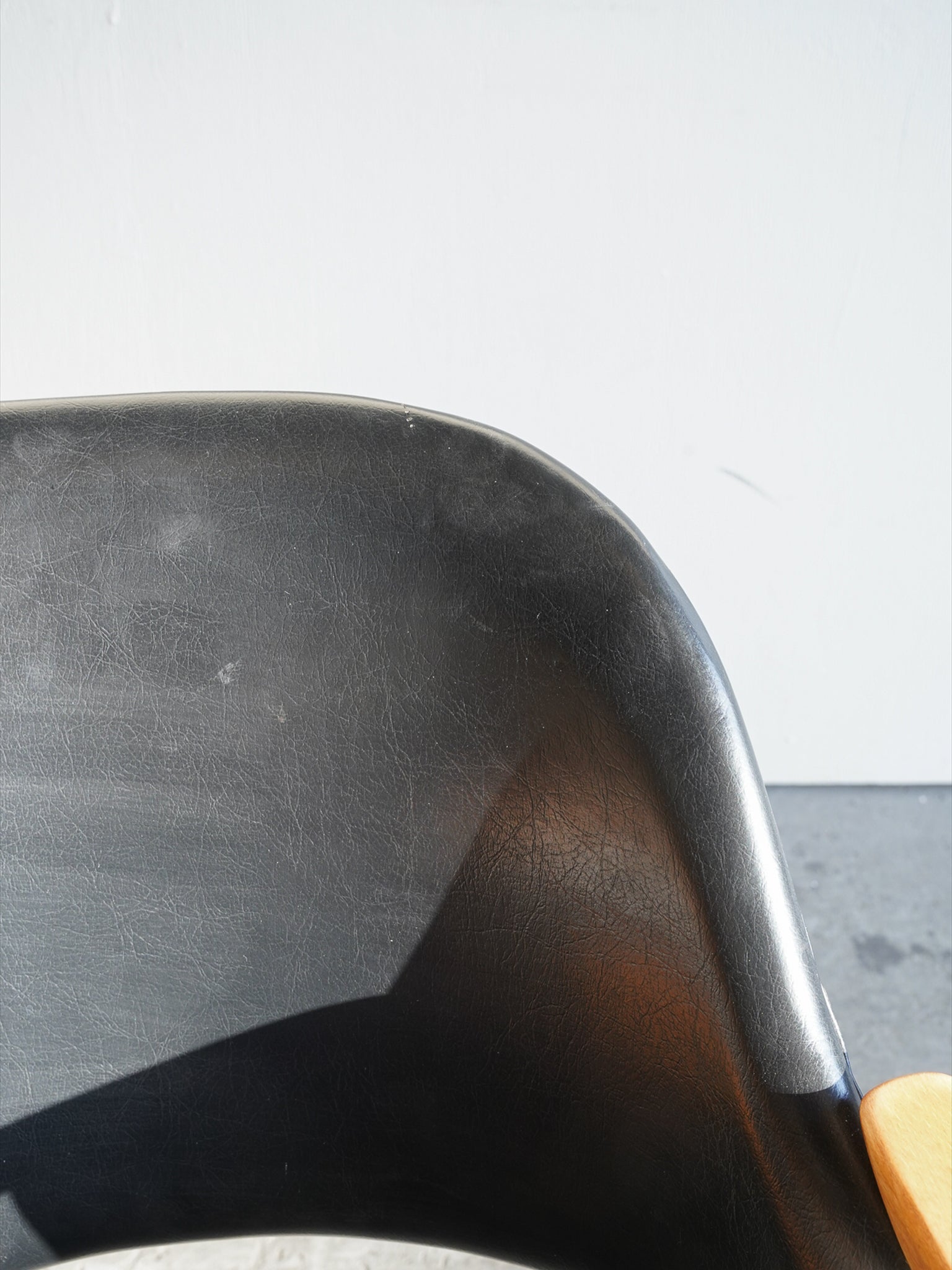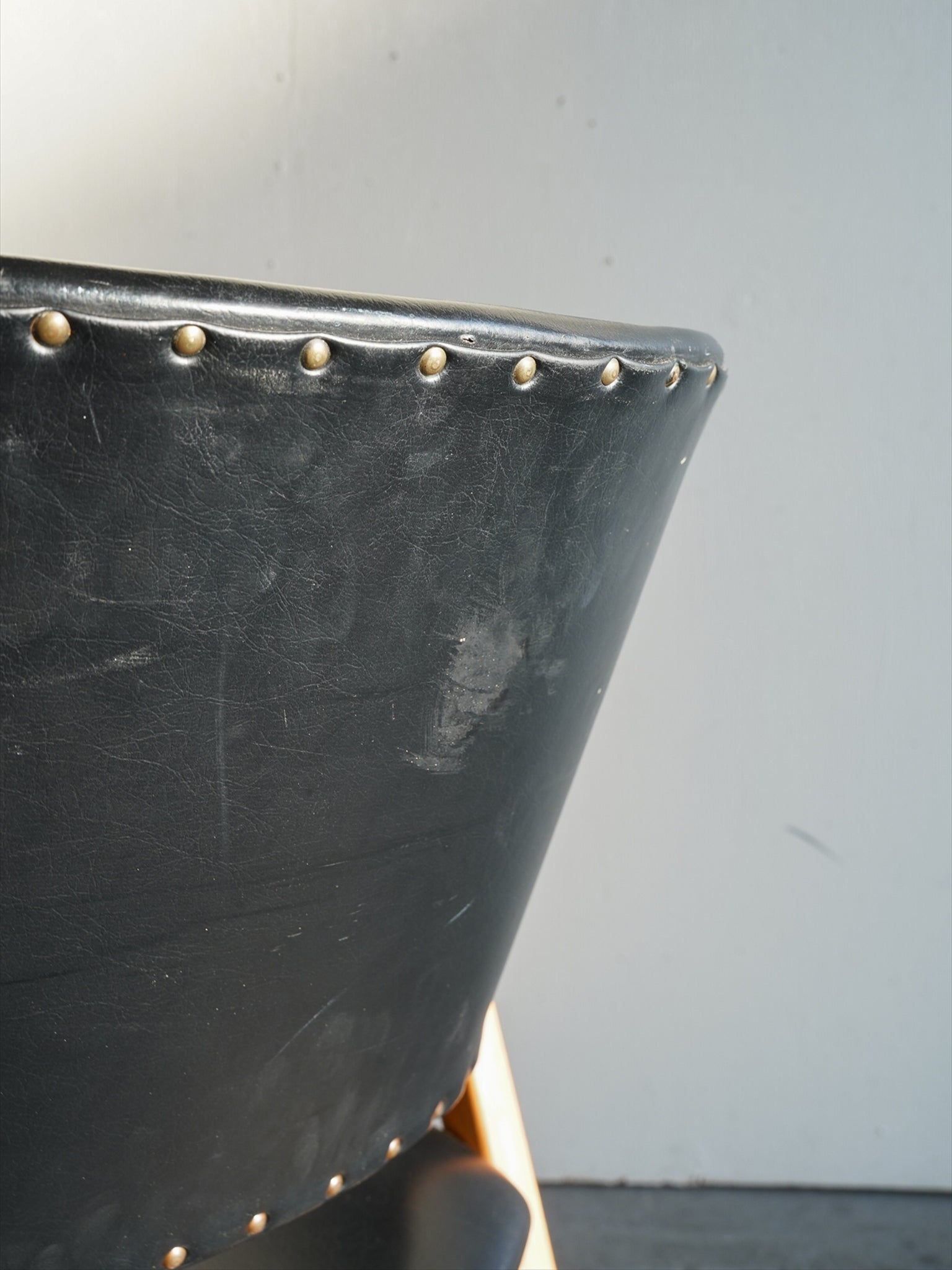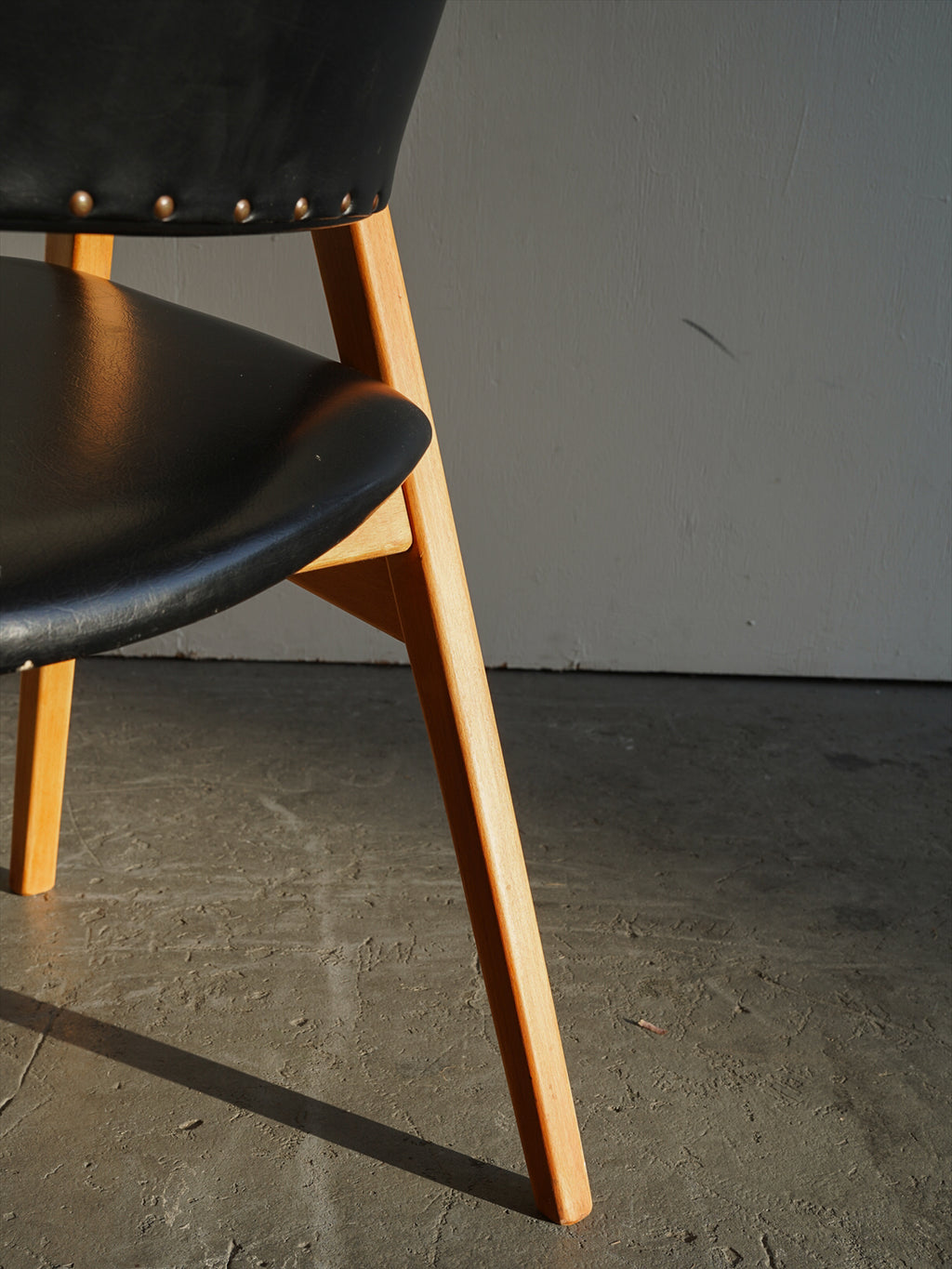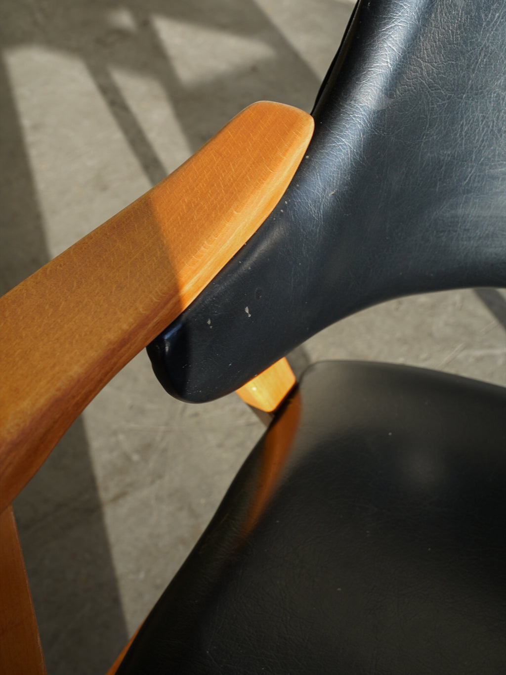座面と背もたれには、張りのあるレザーが使用されており、木材の温かみとモダンなコントラストを生み出しています。ミッドセンチュリー・モダンのエッセンスを色濃く残すデザインは、ダイニングチェアとしてはもちろん、書斎やリビングでパーソナルチェアとしても活躍します。