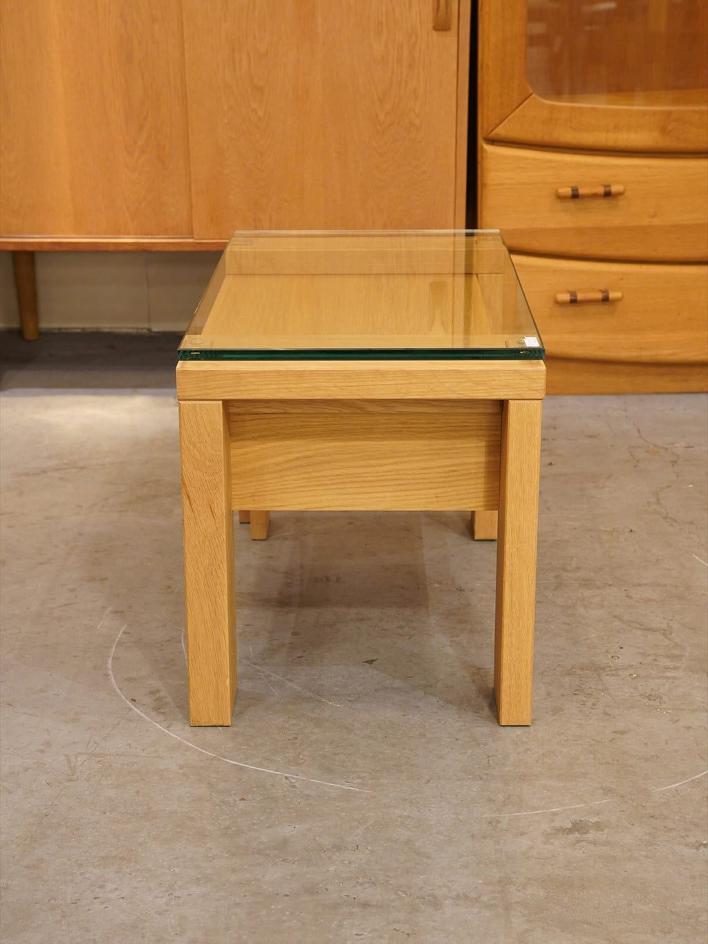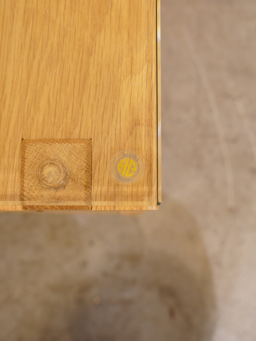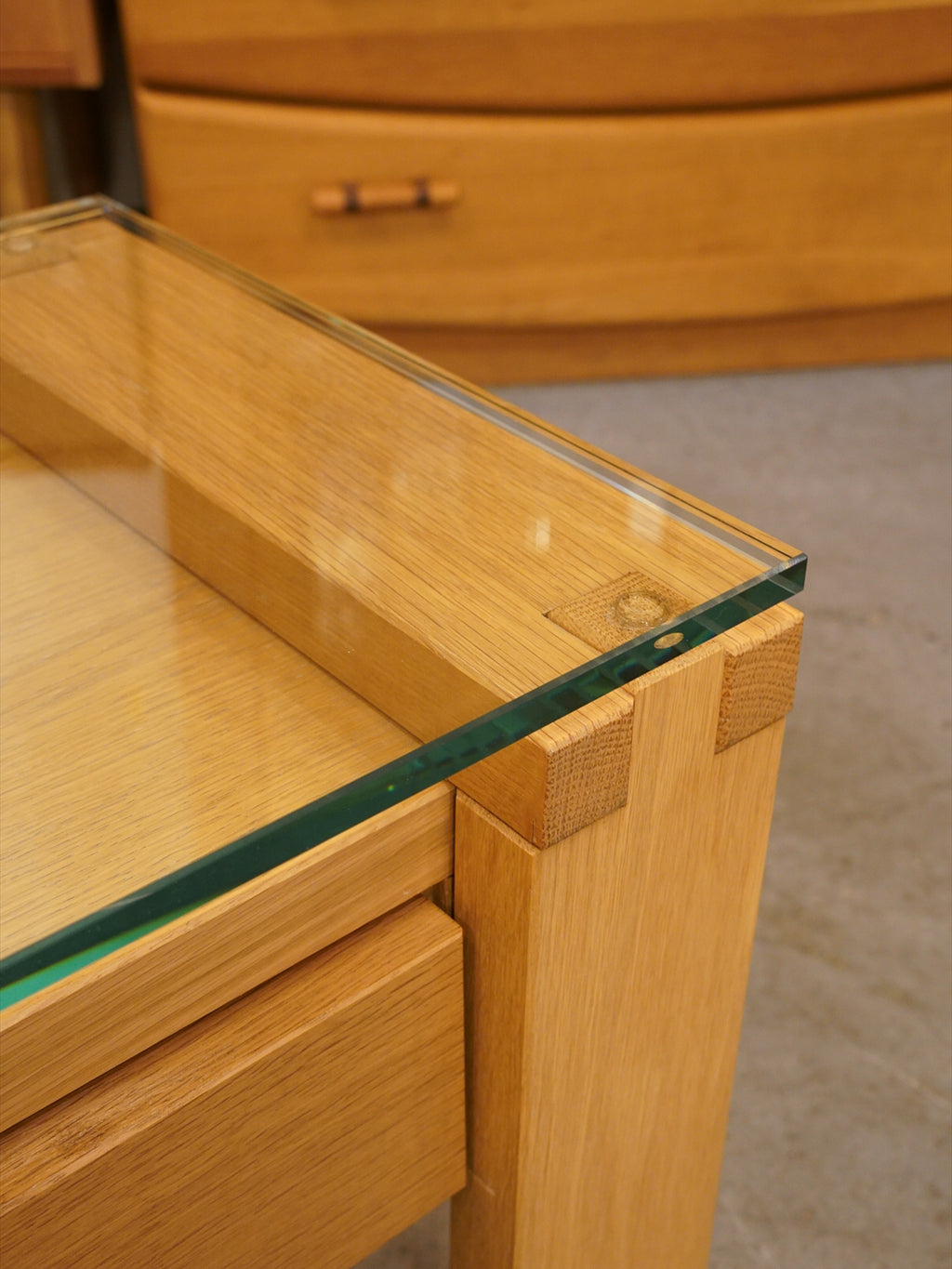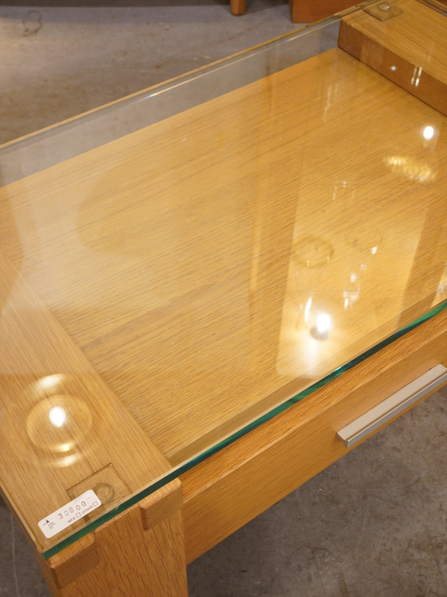 厚みのあるクリアガラス天板と、オーク材を組み合わせた、端正で実用性の高い一台です。