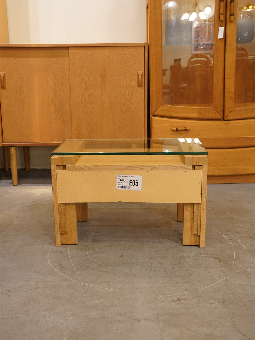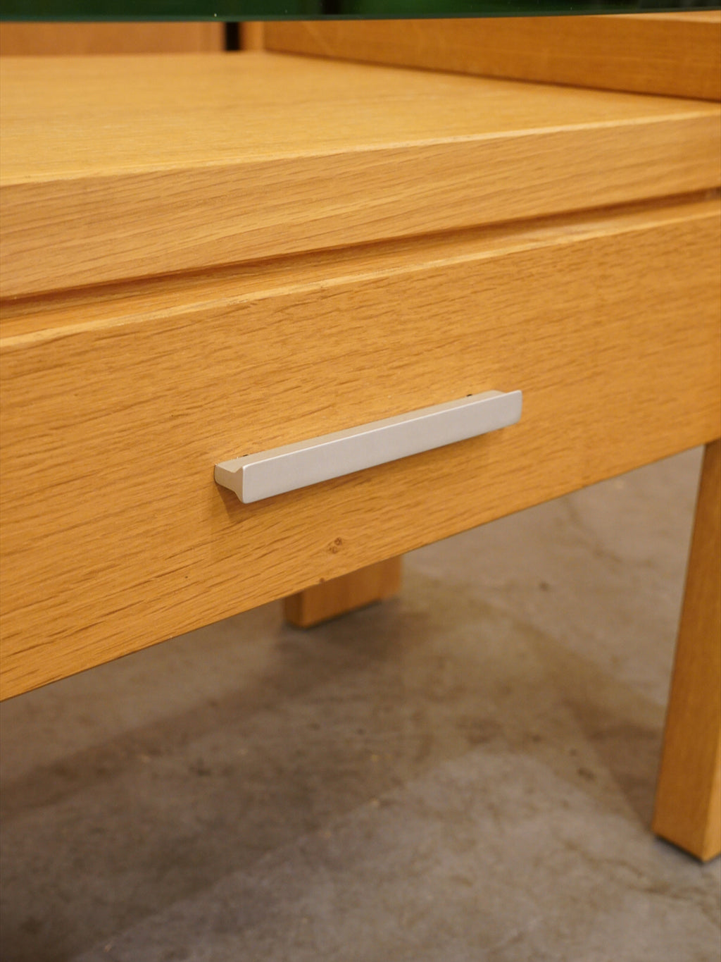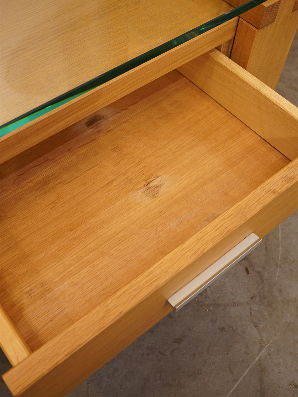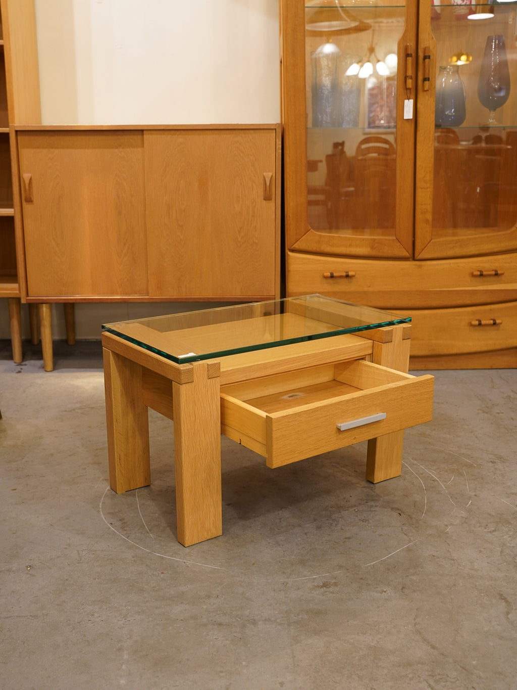 厚みのあるクリアガラス天板と、オーク材を組み合わせた、端正で実用性の高い一台です。