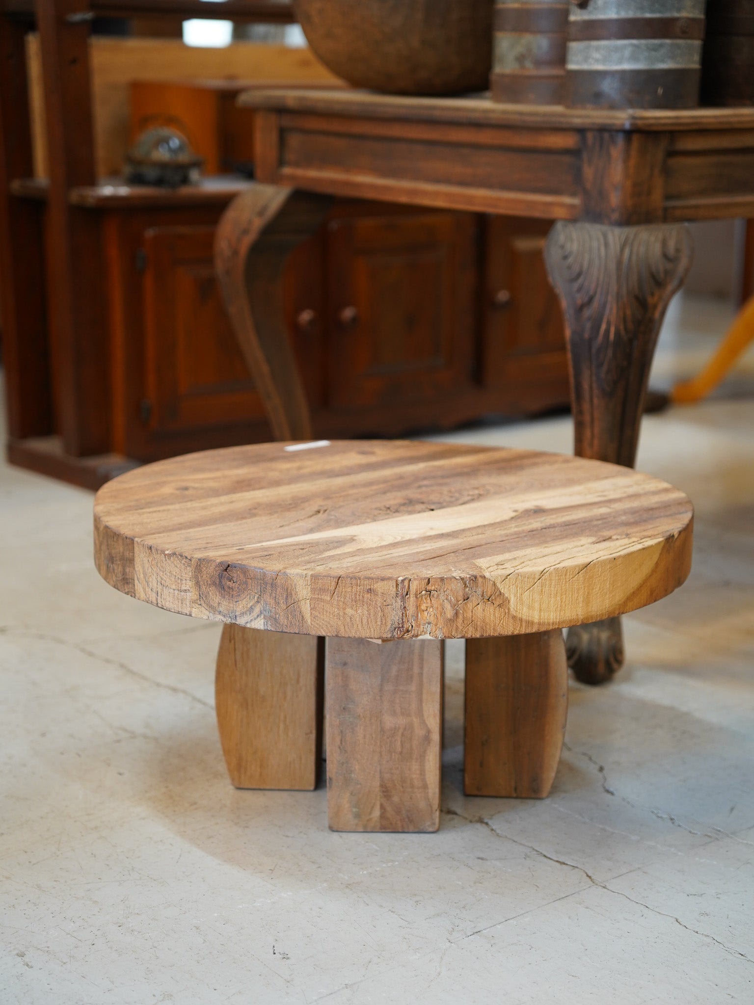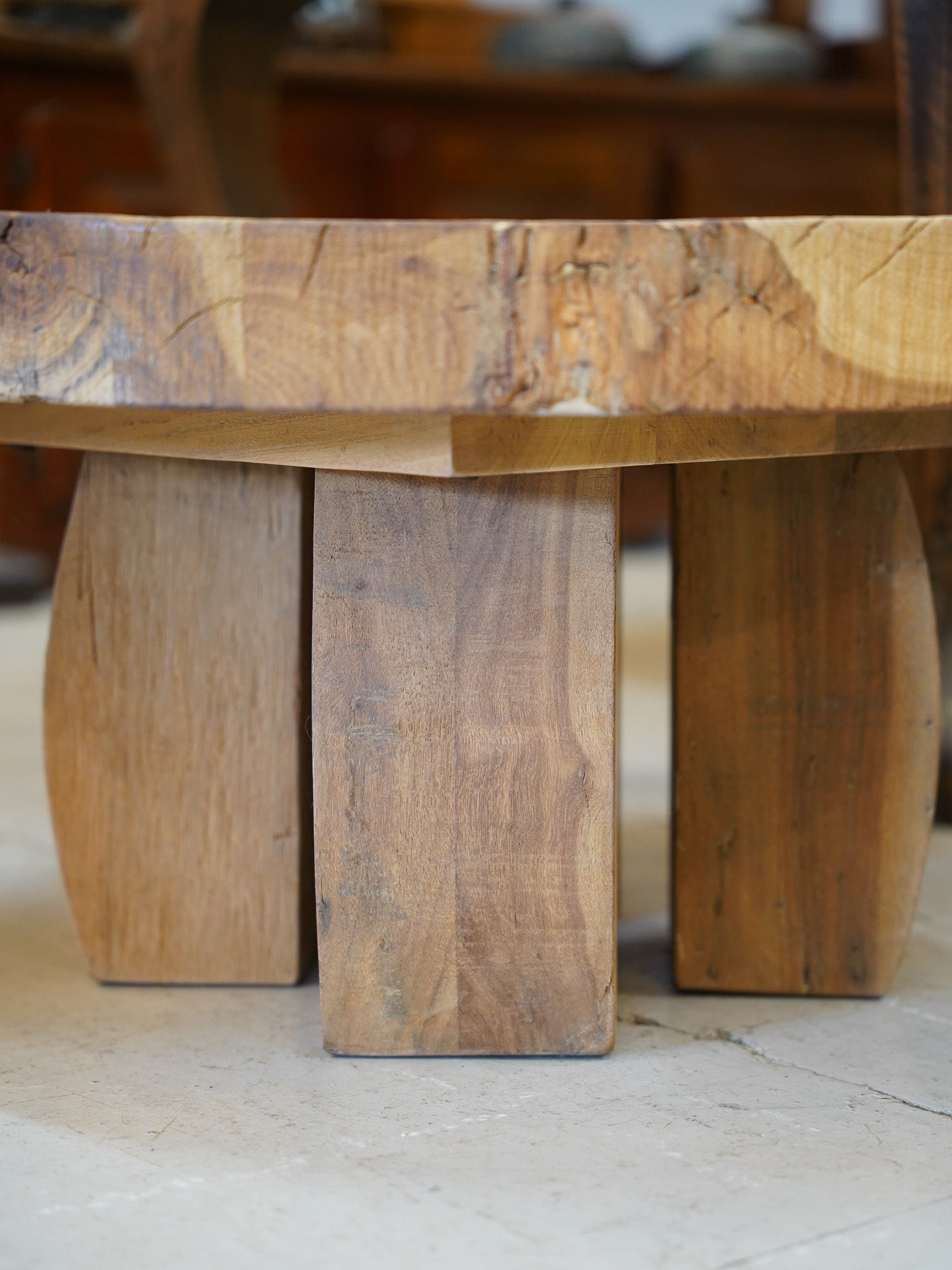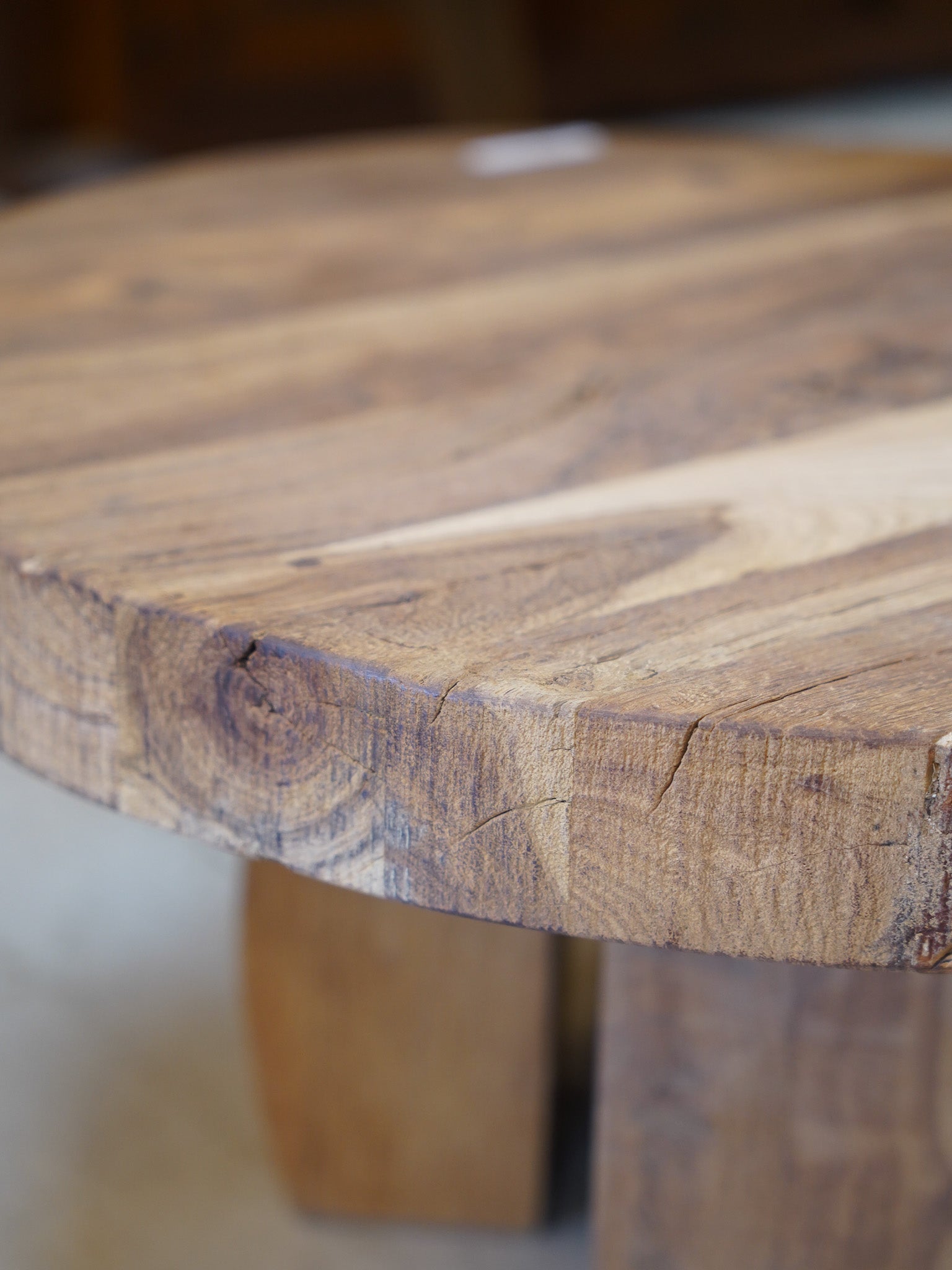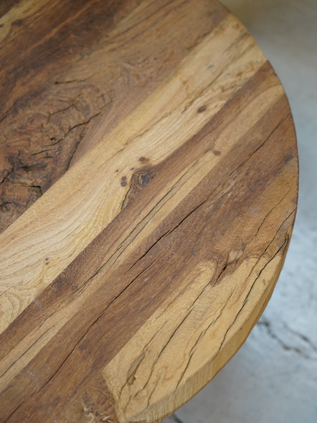 木材の輪郭をあえて残したり、ひび割れや節などの自然な表情がそのまま活かされたラスティックな雰囲気のローテーブル。