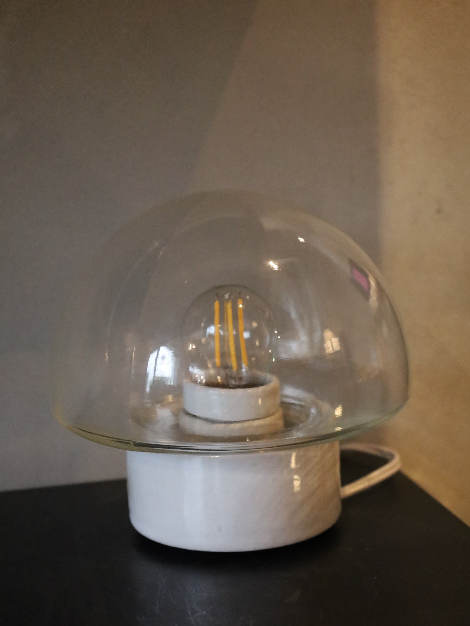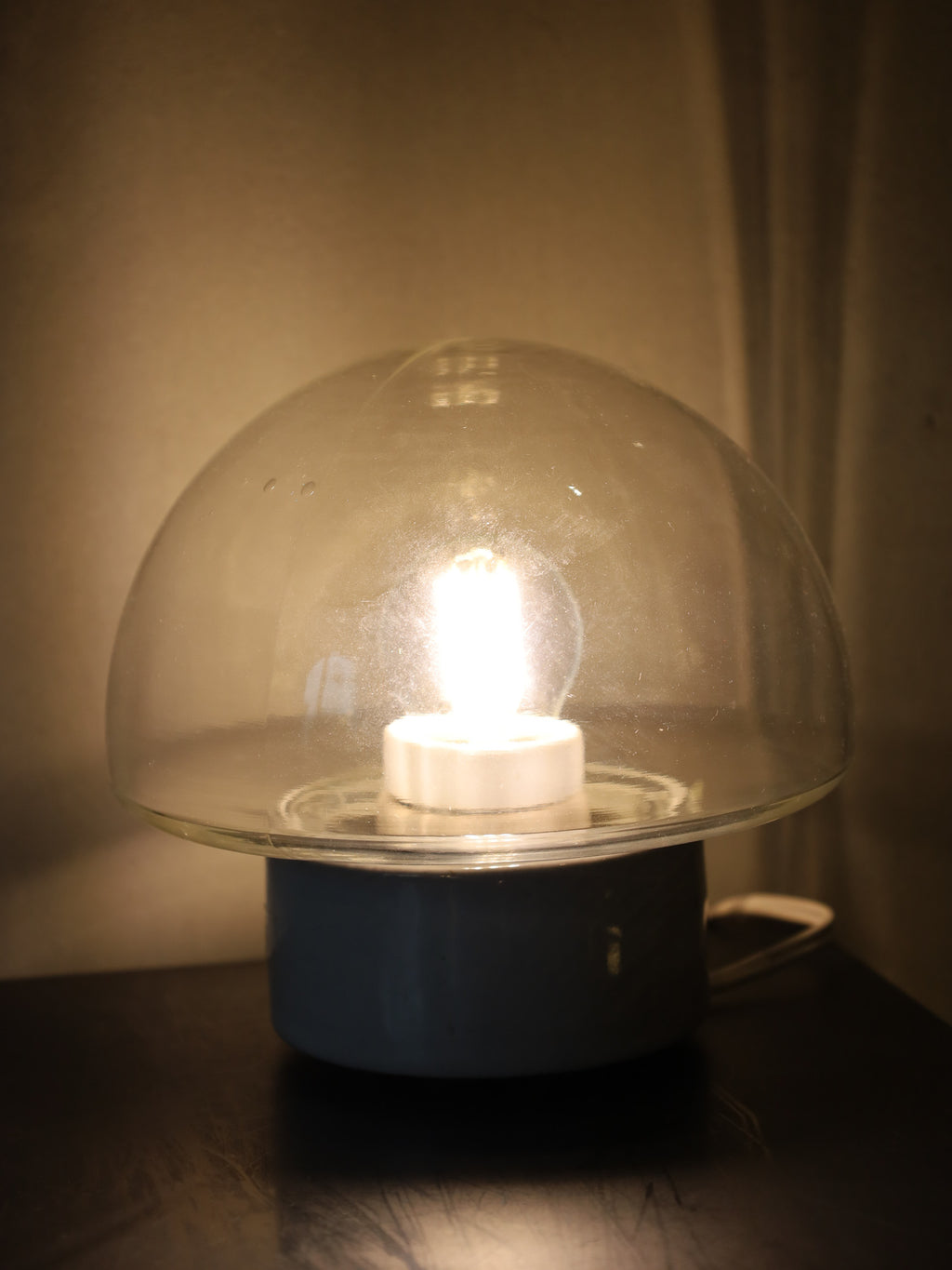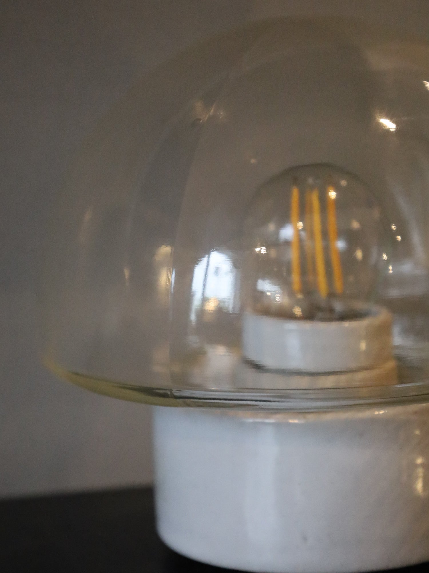 カプセル状の厚みのあるクリアガラスガラスシェードが付いたシンプルなデザイン。