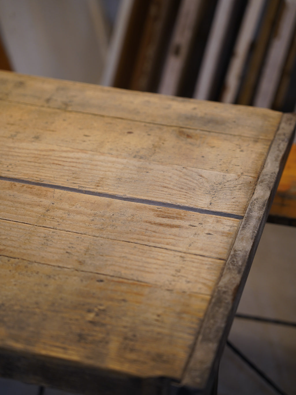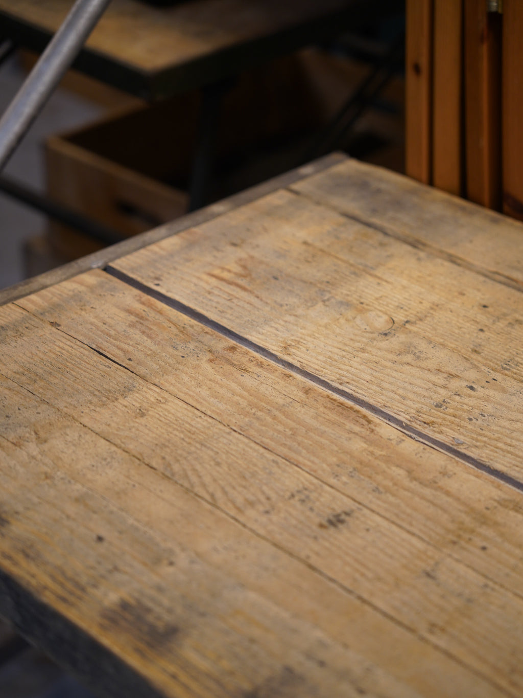 素朴な質感の天板にアイアンの脚を組み合わせた、シンプルで実用性の高いワークテーブル。