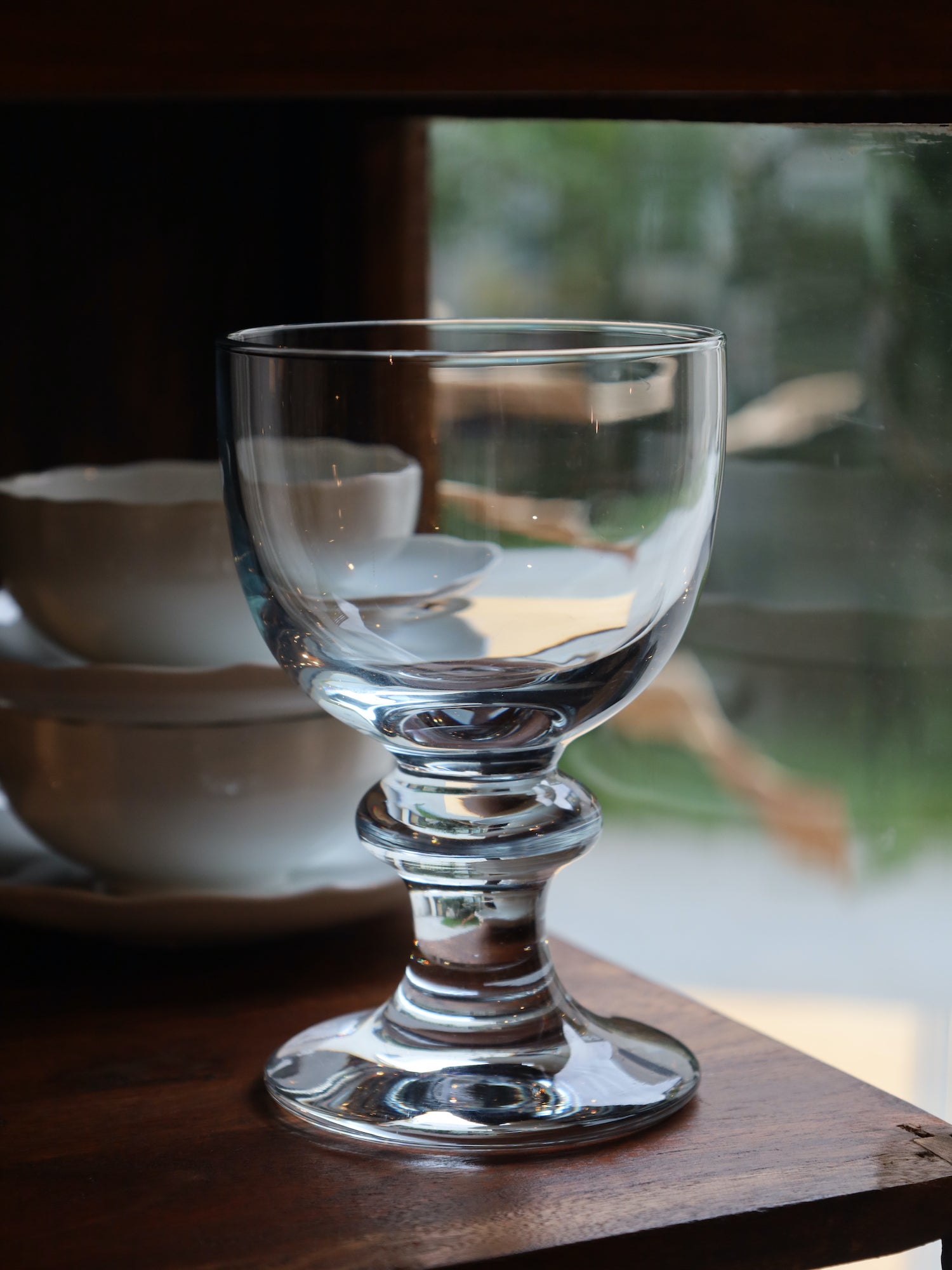 このクラシカルなステムのデザインと、分厚いガラスの質感は、1950年代から1970年代にかけてのヨーロッパ、特にビストロやカジュアルダイニングで愛用されたグラスウェアの様式を反映しています。