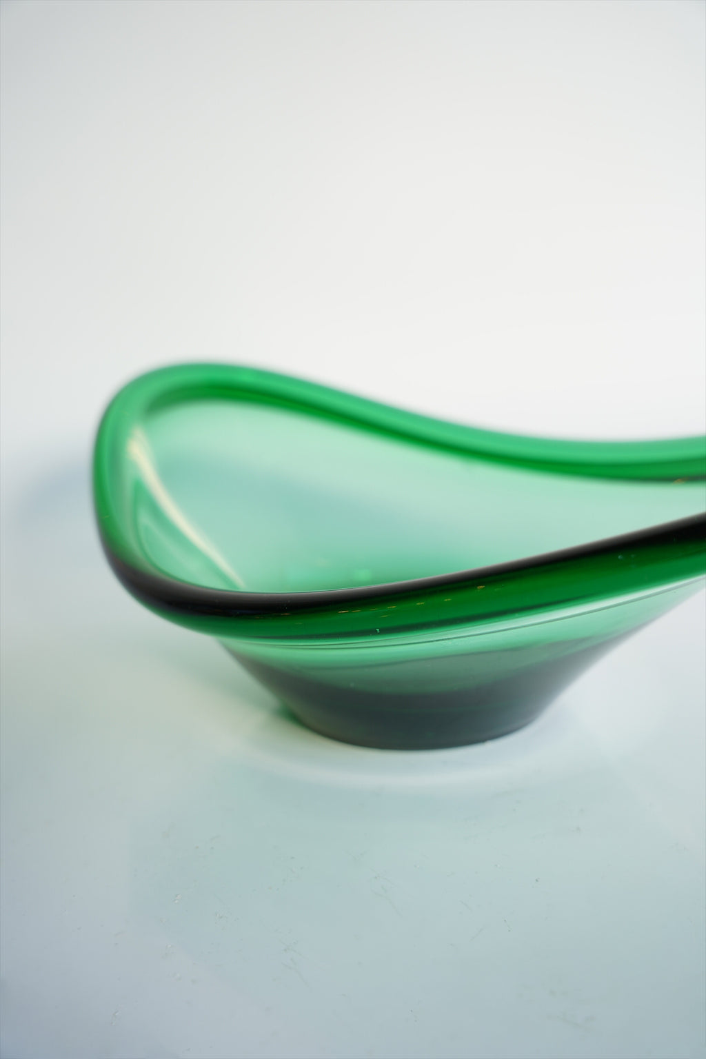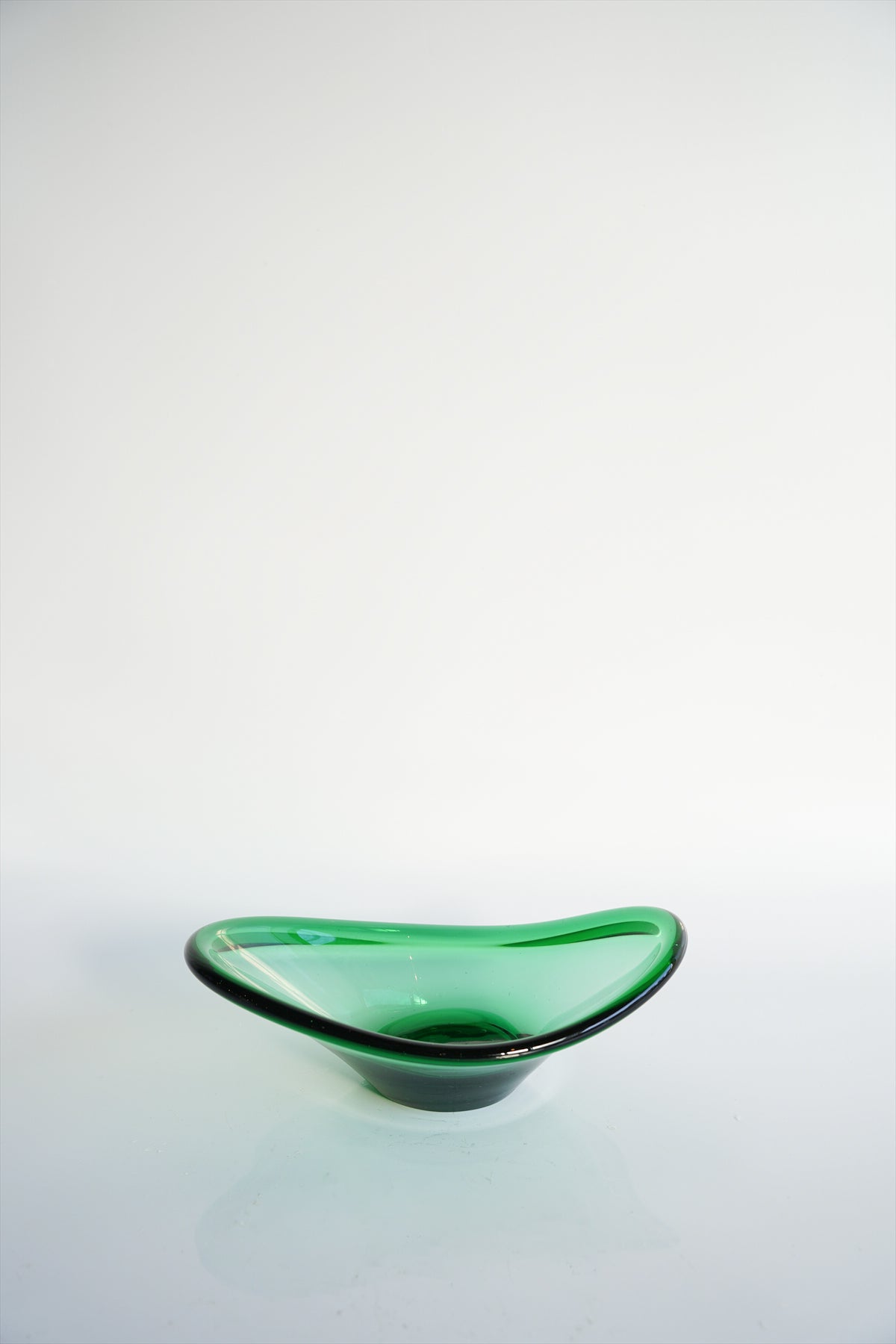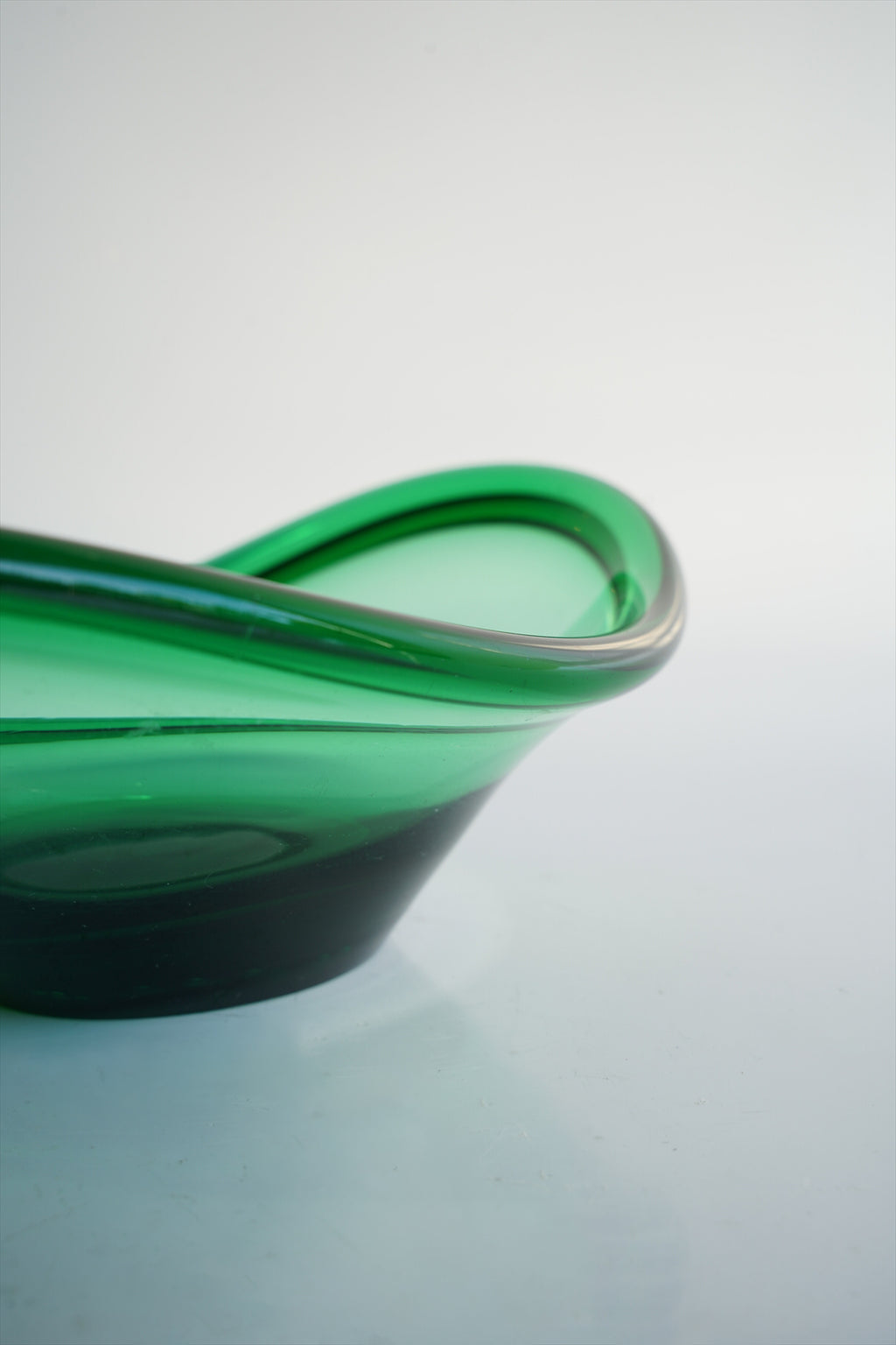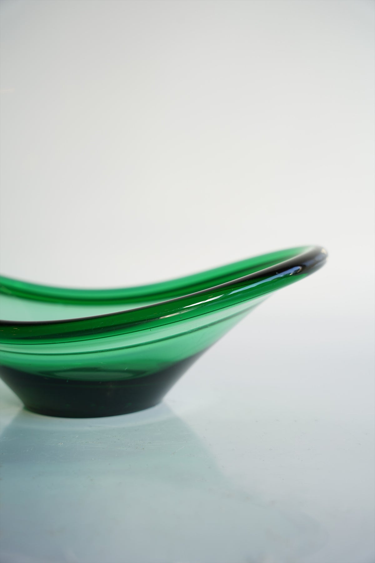 緩やかに波打つフォルムと、深みのあるグリーンのガラスが印象的なオーバルトレー。