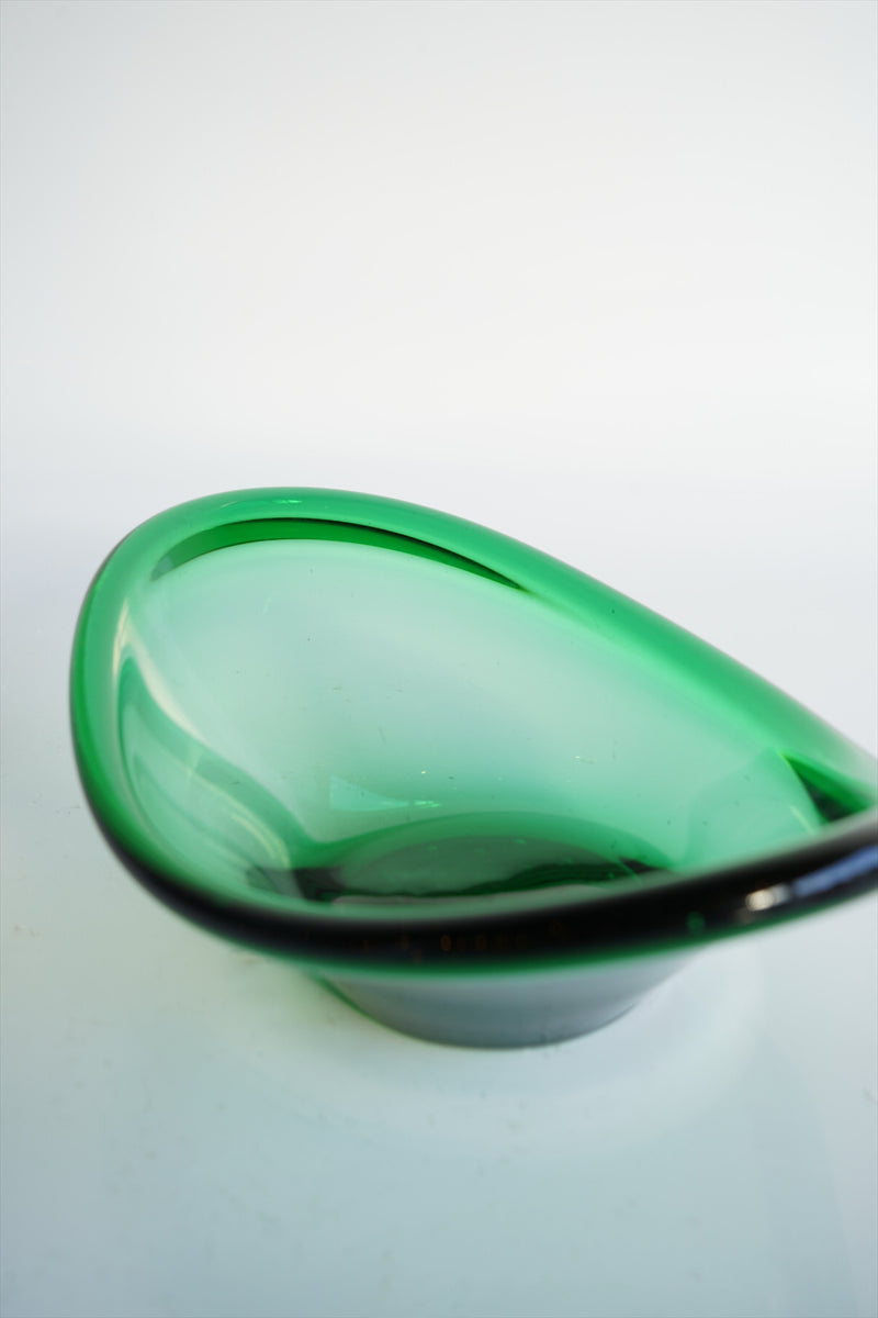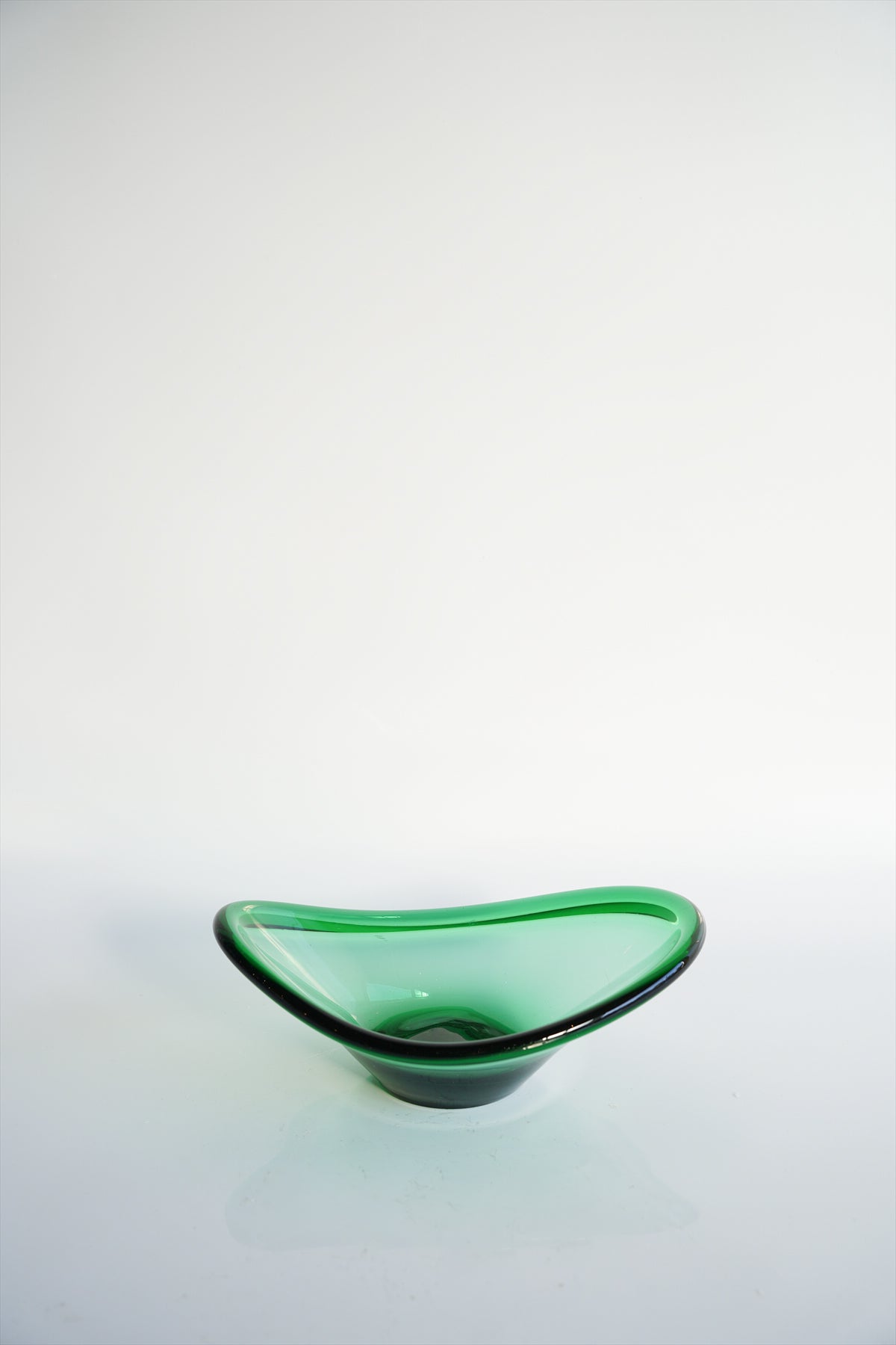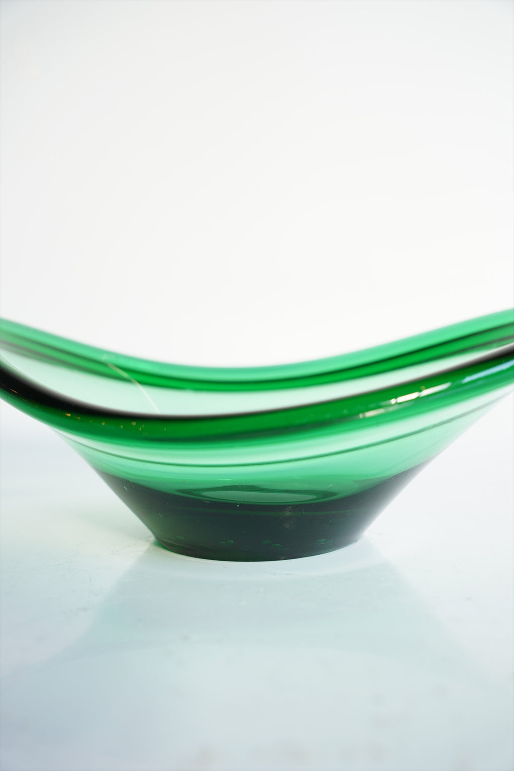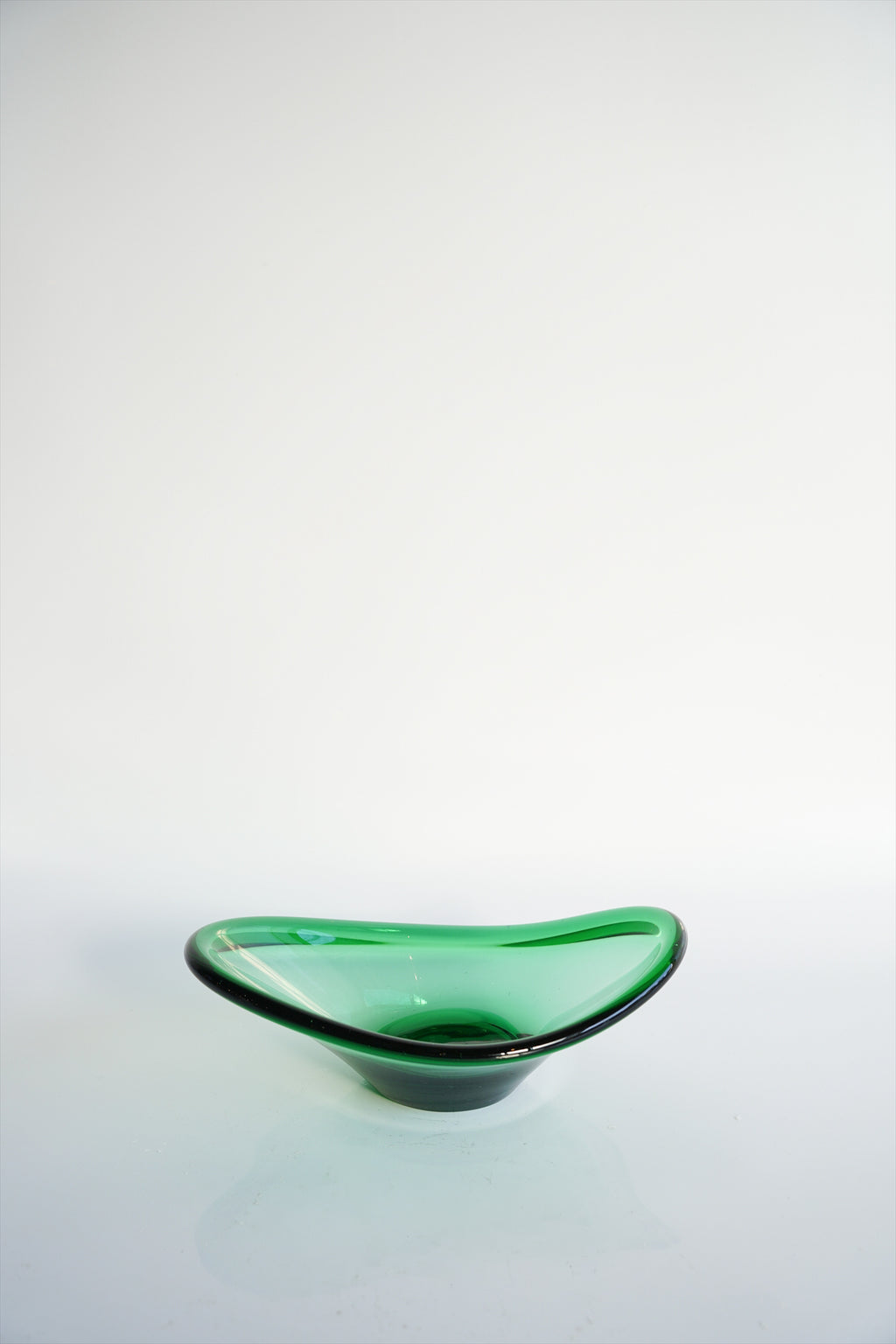 緩やかに波打つフォルムと、深みのあるグリーンのガラスが印象的なオーバルトレー。