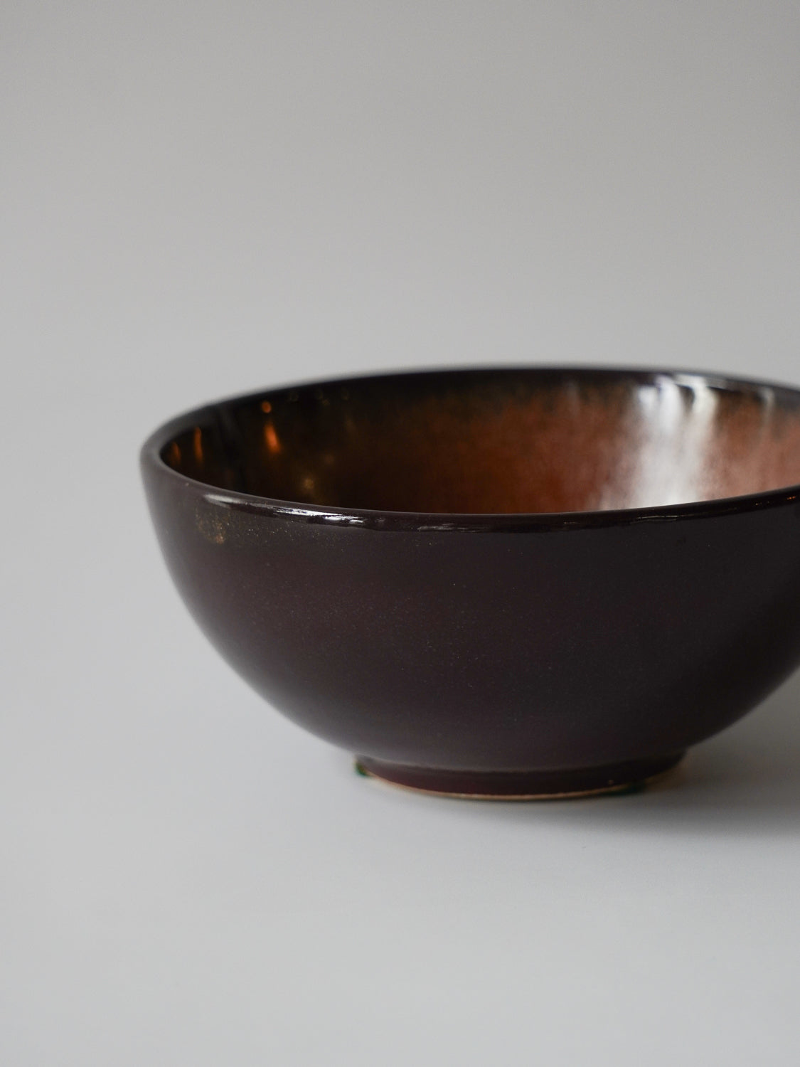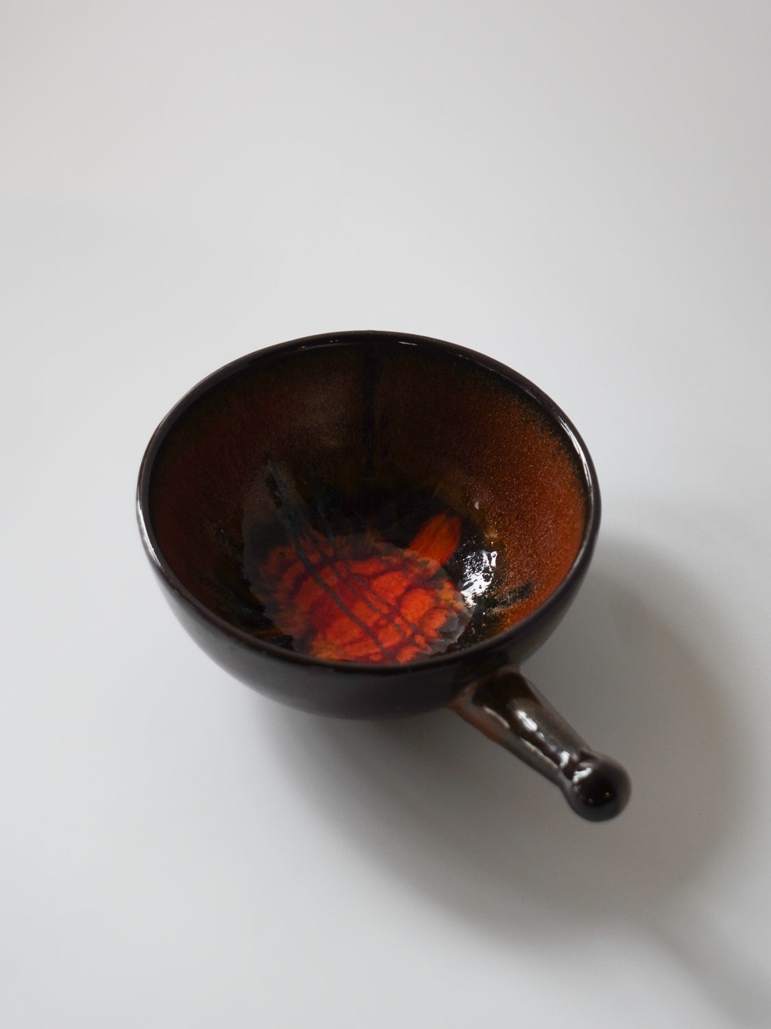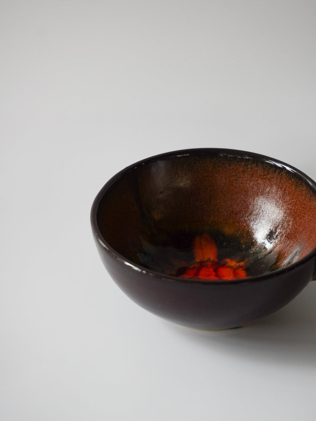 外側は落ち着いた焦げ茶色、内側は茶、黒、オレンジ、赤が混ざり合う表情豊かなグラデーション釉薬。