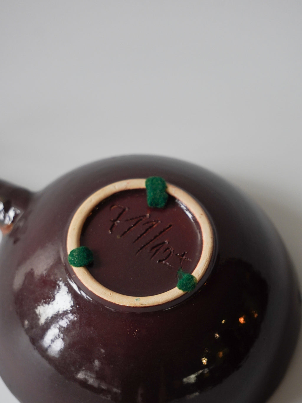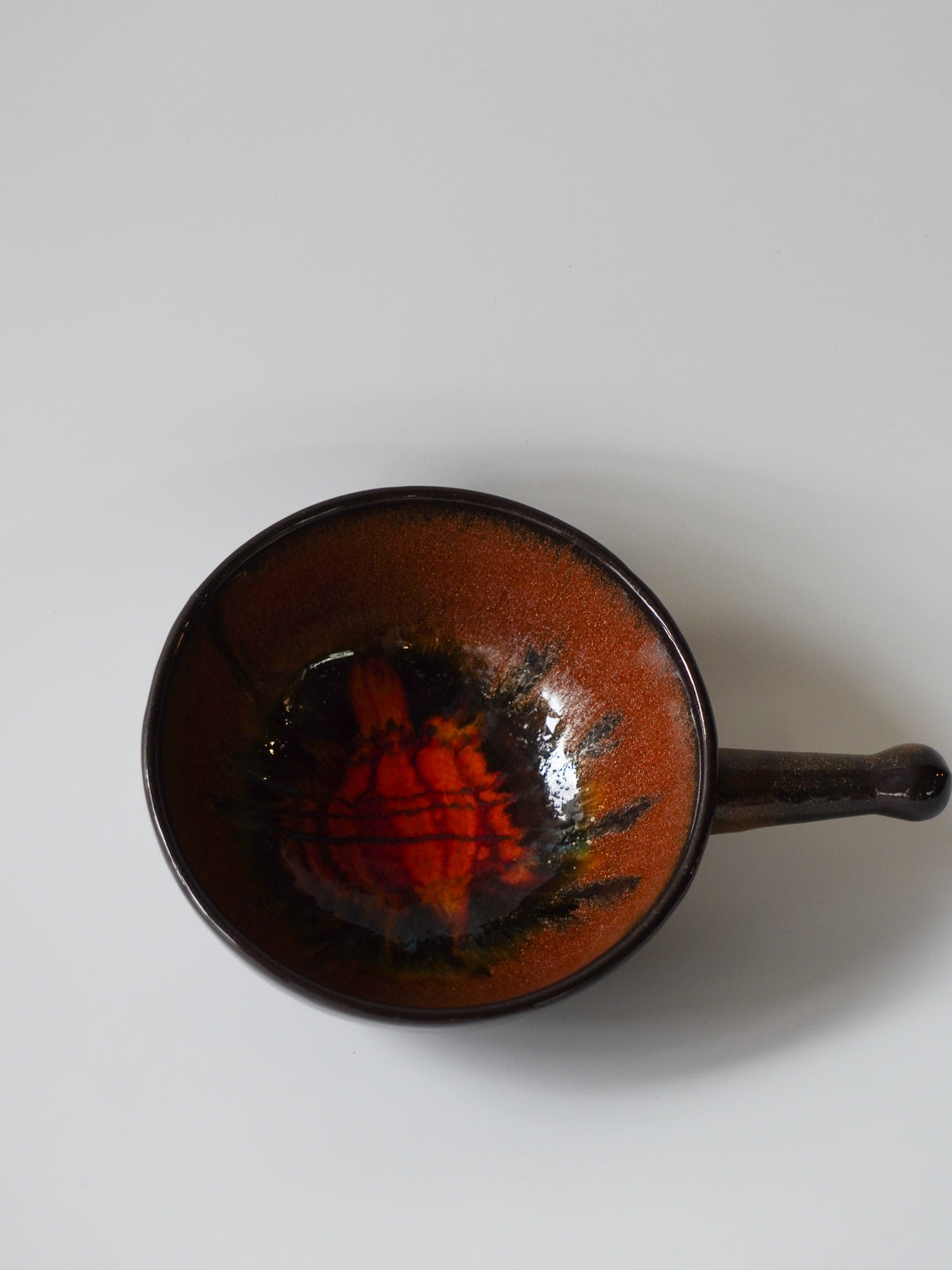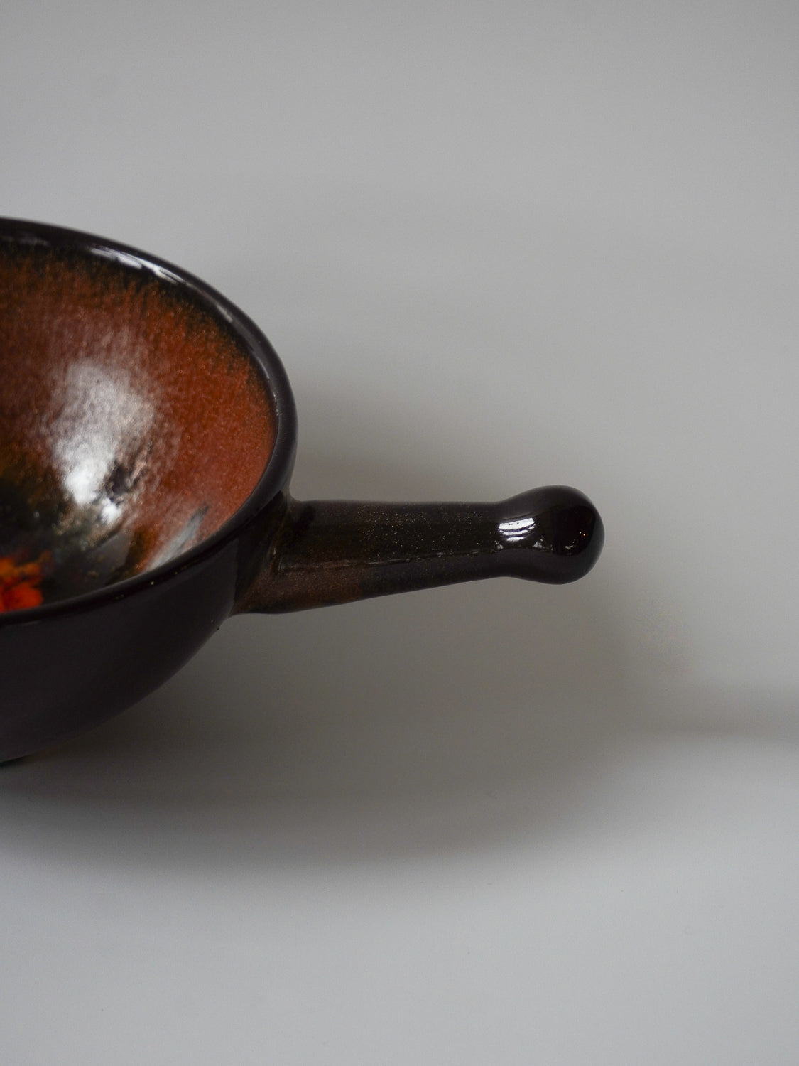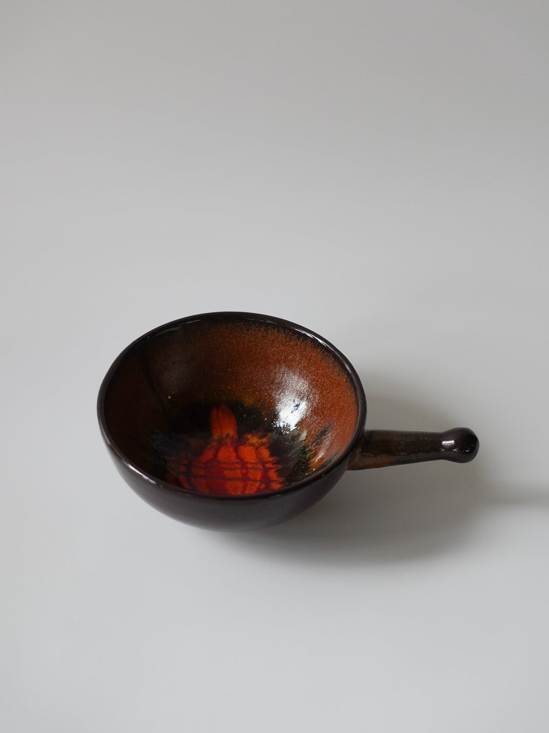 ヴィンテージの雰囲気をまとった、小さなソースパン(片手鍋)のような愛らしいフォルムの陶器ボウルです。