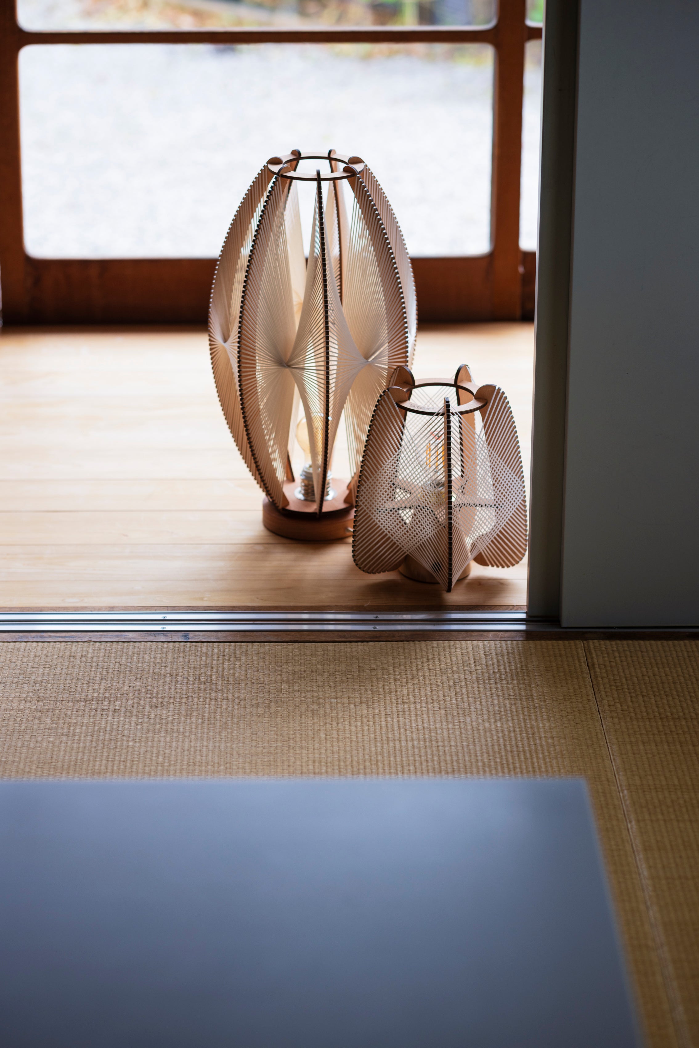 ◯薄板に入ったスリットにロープを繊細に張り巡らせることで、ベジェ曲線や幾何学模様が形成され、点灯時にはやわらかな光と影が空間を彩ります。また、消灯時と点灯時で印象が変化し、見る角度によっても表情が変わるため、オブジェとしても存在感を放ちます。