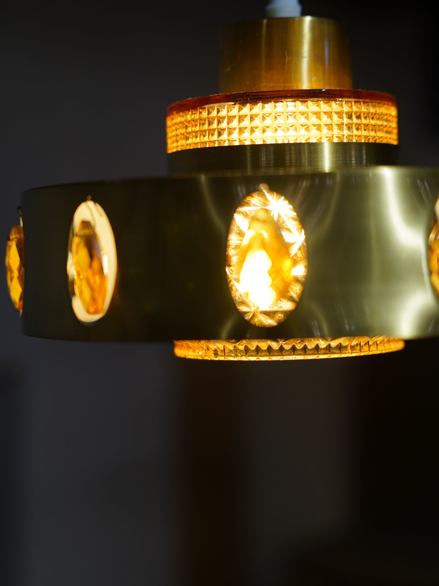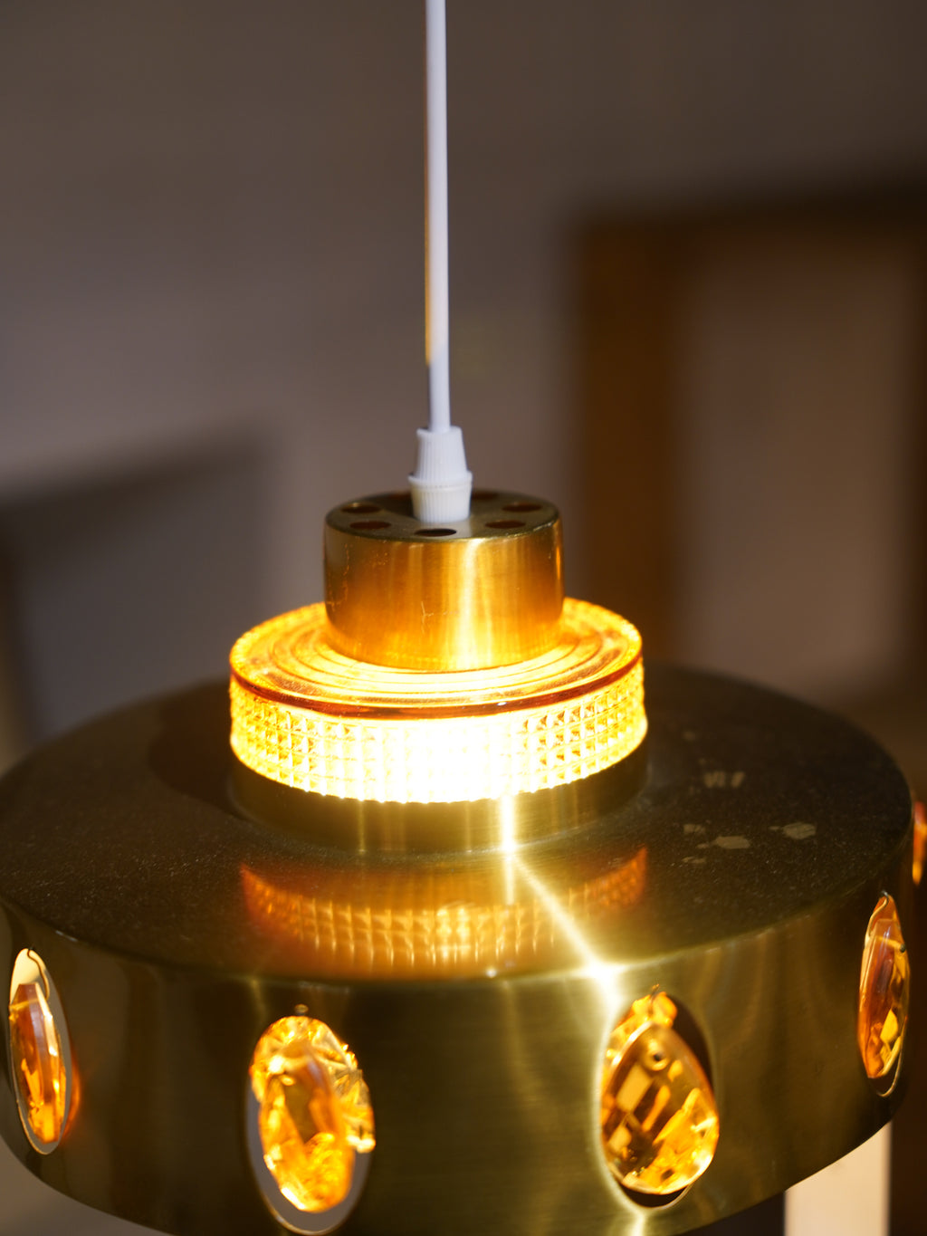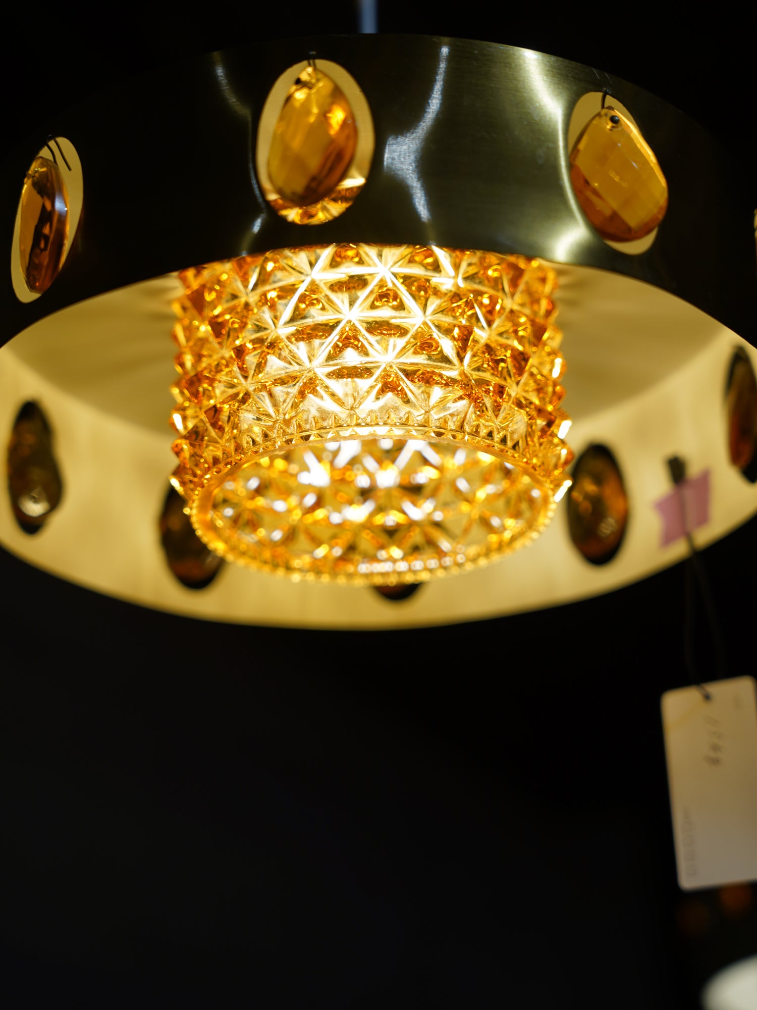 さらに、ガラスシェードを取り囲む装飾が、デザインに奥行きを与えます。吊り下げられた琥珀色のガラスドロップは、光を受けてきらめき、空間にドラマチックな表情を加えます。