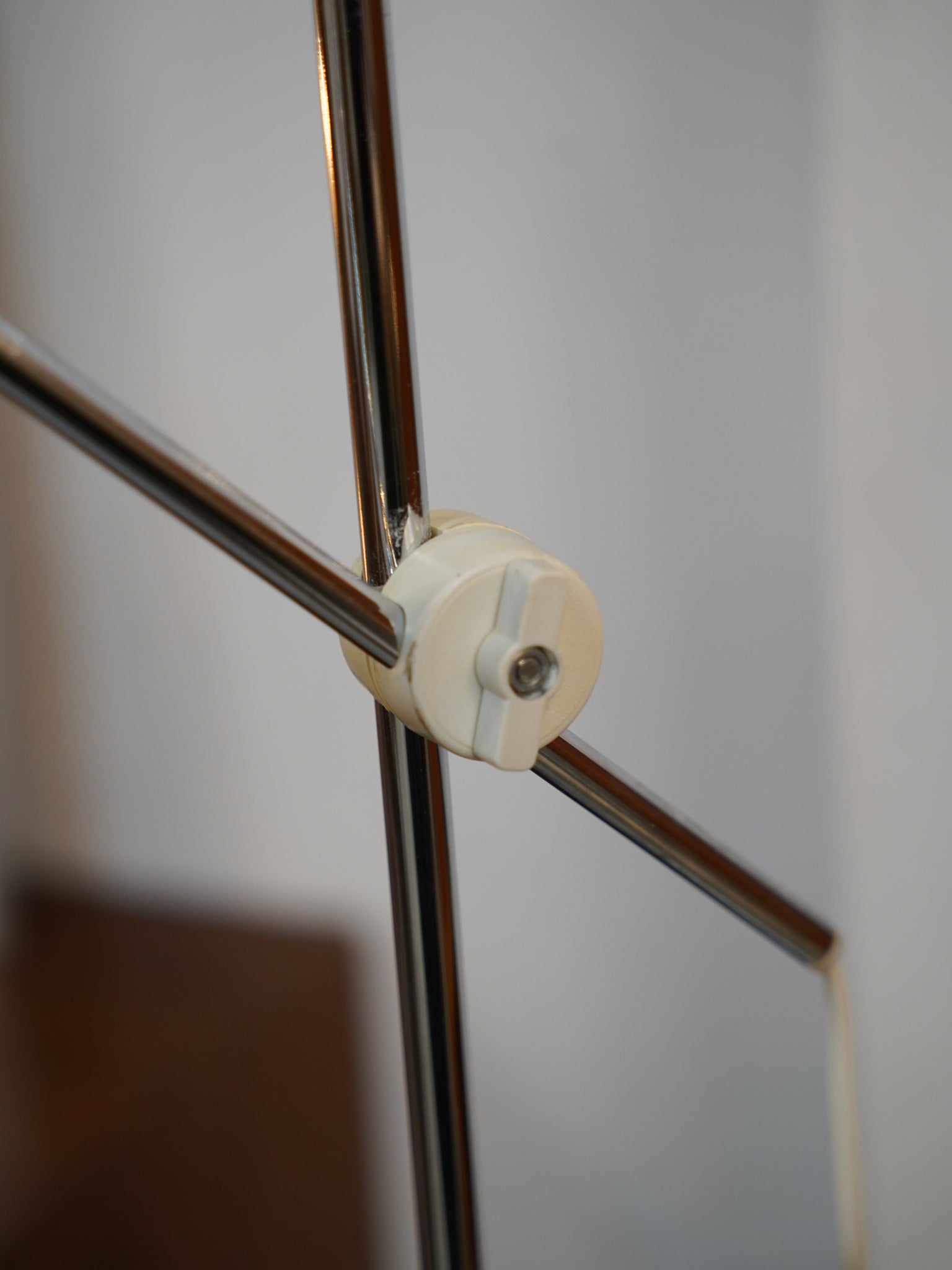 直線的なクロームの支柱と、清潔感のあるホワイトのシェード・ベースが調和したモダンデザインのフロアランプです。
