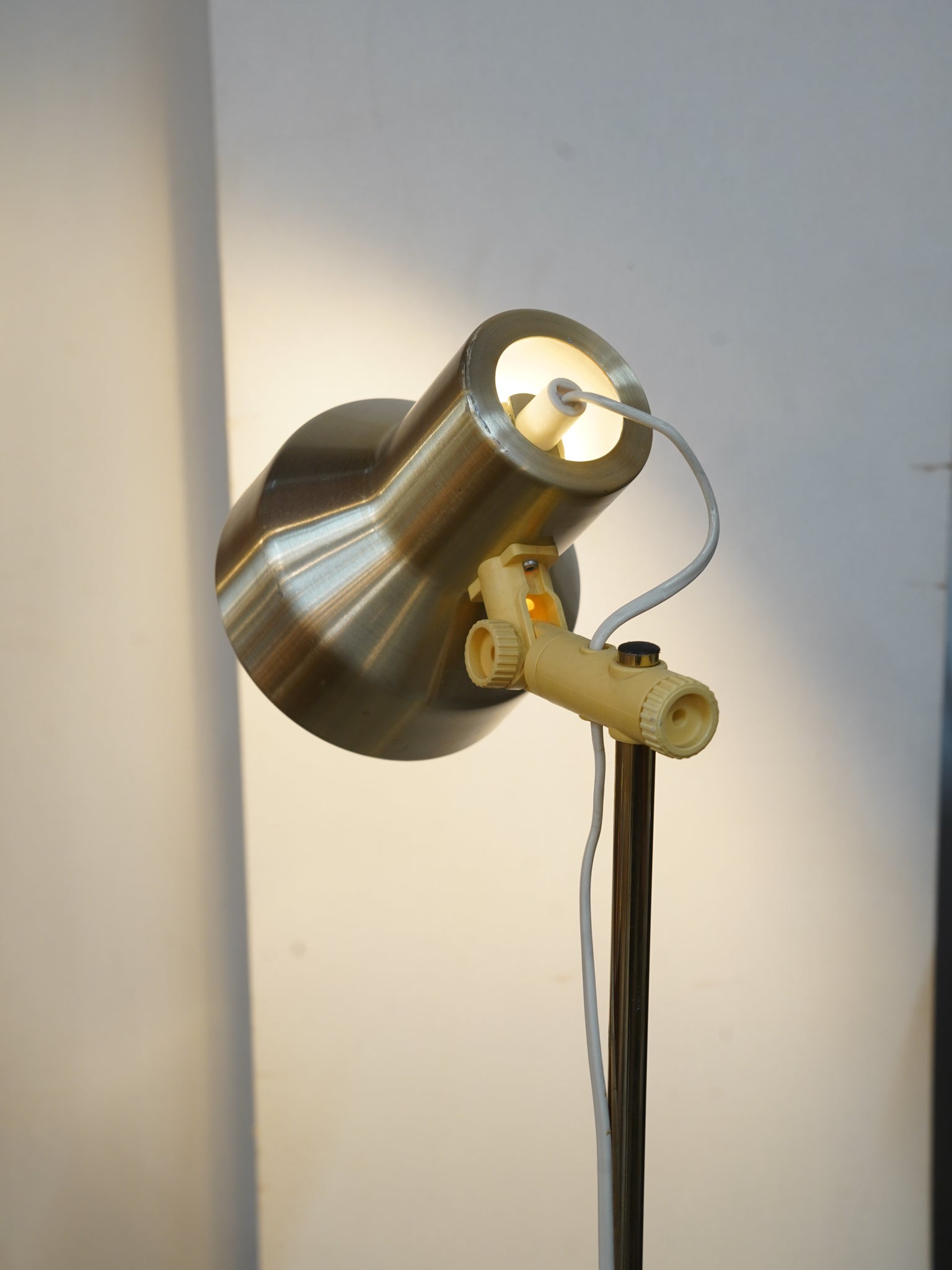 機能面では、シェードの角度を自在に調整できるスポットライト仕様が特徴です。首振りのパーツには当時のヴィンテージらしい風合いの樹脂素材が使われており、メカニカルな機能美を感じさせます。円形のベースは安定感がありながらも省スペースで、お部屋のコーナーや家具の隙間など、場所を選ばず配置できるのも大きな魅力です。