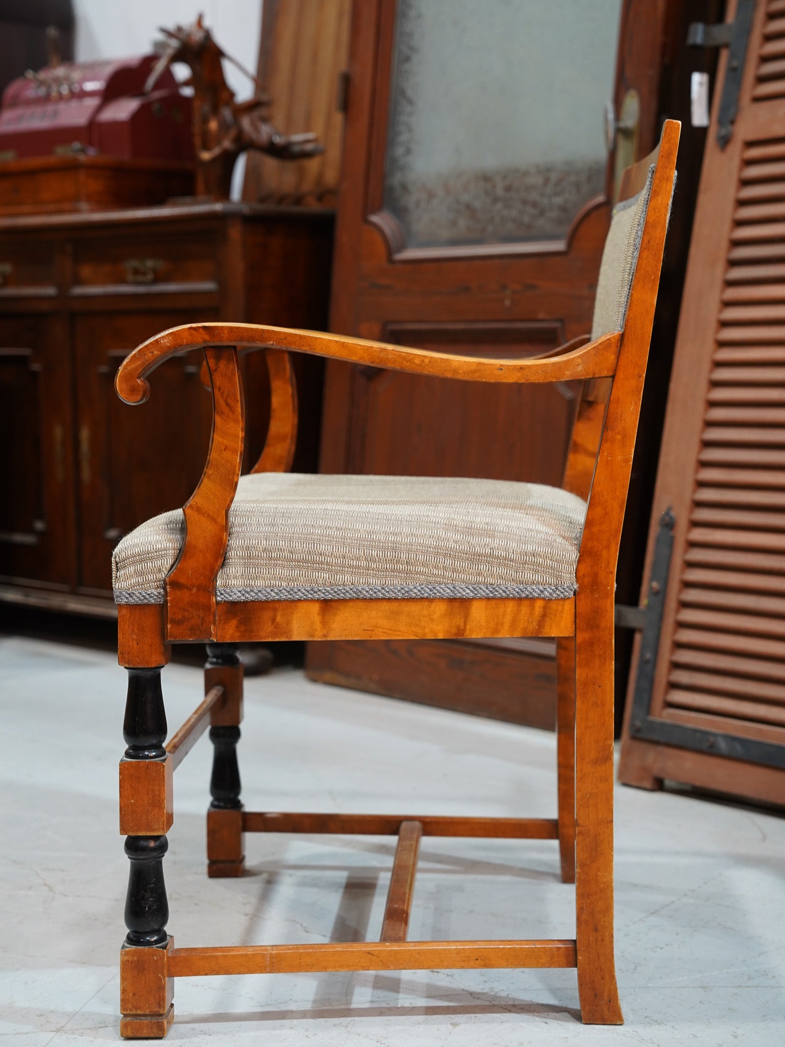 木目や色合いからマホガニー材、あるいはバーチ材が使用されていると推測されます。年月を経た木材の深い色合いと、職人の手仕事を感じさせるろくろ加工の脚が、このチェアに上品な雰囲気を与えています。